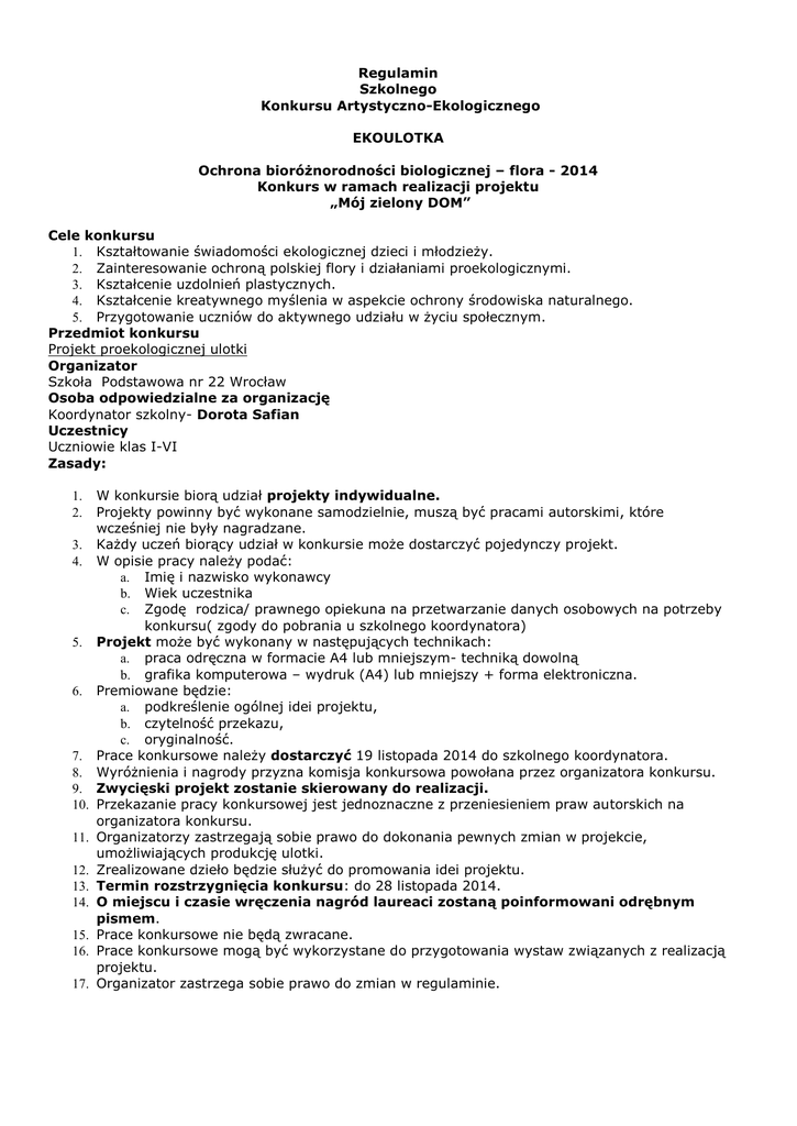 Regulamin Szkolnego Konkursu Artystyczno-Ekologicznego EKOULOTKA Ochrona bioróżnorodności biologicznej – flora - 2014 Konkurs w ramach realizacji projektu „Mój zielony DOM” Cele konkursu 1. Kształtowanie świadomości ekologicznej dzieci i młodzieży. 2. Zainteresowanie ochroną polskiej flory i działaniami proekologicznymi. 3. Kształcenie uzdolnień plastycznych. 4. Kształcenie kreatywnego myślenia w aspekcie ochrony środowiska naturalnego. 5. Przygotowanie uczniów do aktywnego udziału w życiu społecznym. Przedmiot konkursu Projekt proekologicznej ulotki Organizator Szkoła Podstawowa nr 22 Wrocław Osoba odpowiedzialne za organizację Koordynator szkolny- Dorota Safian Uczestnicy Uczniowie klas I-VI Zasady: 1. 2. 3. 4. 5. 6. 7. 8. 9. 10. 11. 12. 13. 14. 15. 16. 17. W konkursie biorą udział projekty indywidualne. Projekty powinny być wykonane samodzielnie, muszą być pracami autorskimi, które wcześniej nie były nagradzane. Każdy uczeń biorący udział w konkursie może dostarczyć pojedynczy projekt. W opisie pracy należy podać: a. Imię i nazwisko wykonawcy b. Wiek uczestnika c. Zgodę rodzica/ prawnego opiekuna na przetwarzanie danych osobowych na potrzeby konkursu( zgody do pobrania u szkolnego koordynatora) Projekt może być wykonany w następujących technikach: a. praca odręczna w formacie A4 lub mniejszym- techniką dowolną b. grafika komputerowa – wydruk (A4) lub mniejszy + forma elektroniczna. Premiowane będzie: a. podkreślenie ogólnej idei projektu, b. czytelność przekazu, c. oryginalność. Prace konkursowe należy dostarczyć 19 listopada 2014 do szkolnego koordynatora. Wyróżnienia i nagrody przyzna komisja konkursowa powołana przez organizatora konkursu. Zwycięski projekt zostanie skierowany do realizacji. Przekazanie pracy konkursowej jest jednoznaczne z przeniesieniem praw autorskich na organizatora konkursu. Organizatorzy zastrzegają sobie prawo do dokonania pewnych zmian w projekcie, umożliwiających produkcję ulotki. Zrealizowane dzieło będzie służyć do promowania idei projektu. Termin rozstrzygnięcia konkursu: do 28 listopada 2014. O miejscu i czasie wręczenia nagród laureaci zostaną poinformowani odrębnym pismem. Prace konkursowe nie będą zwracane. Prace konkursowe mogą być wykorzystane do przygotowania wystaw związanych z realizacją projektu. Organizator zastrzega sobie prawo do zmian w regulaminie.