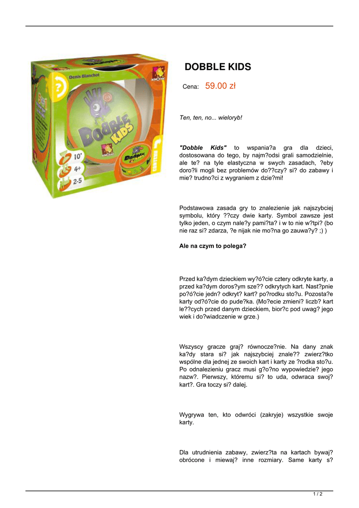 DOBBLE KIDS Cena: 59.00 zł Ten, ten, no... wieloryb! "Dobble Kids" to wspania?a gra dla dzieci, dostosowana do tego, by najm?odsi grali samodzielnie, ale te? na tyle elastyczna w swych zasadach, ?eby doro?li mogli bez problemów do??czy? si? do zabawy i mie? trudno?ci z wygraniem z dzie?mi! Podstawowa zasada gry to znalezienie jak najszybciej symbolu, który ??czy dwie karty. Symbol zawsze jest tylko jeden, o czym nale?y pami?ta? i w to nie w?tpi? (bo nie raz si? zdarza, ?e nijak nie mo?na go zauwa?y? ;) ) Ale na czym to polega? Przed ka?dym dzieckiem wy?ó?cie cztery odkryte karty, a przed ka?dym doros?ym sze?? odkrytych kart. Nast?pnie po?ó?cie jedn? odkryt? kart? po?rodku sto?u. Pozosta?e karty od?ó?cie do pude?ka. (Mo?ecie zmieni? liczb? kart le??cych przed danym dzieckiem, bior?c pod uwag? jego wiek i do?wiadczenie w grze.) Wszyscy gracze graj? równocze?nie. Na dany znak ka?dy stara si? jak najszybciej znale?? zwierz?tko wspólne dla jednej ze swoich kart i karty ze ?rodka sto?u. Po odnalezieniu gracz musi g?o?no wypowiedzie? jego nazw?. Pierwszy, któremu si? to uda, odwraca swoj? kart?. Gra toczy si? dalej. Wygrywa ten, kto odwróci (zakryje) wszystkie swoje karty. Dla utrudnienia zabawy, zwierz?ta na kartach bywaj? obrócone i miewaj? inne rozmiary. Same karty s? 1/2 okr?g?e i pe?ne kolorowych ilustracji, a ka?da z nich jest unikalna i ??czy si? z innymi kartami jednym i tylko jednym zwierz?ciem. W instrukcji znajdziecie pi?? ró?nych minigier, ta opisana powy?ej jest najprostsza i najpopularniejsza. 2/2 Powered by TCPDF (www.tcpdf.org)