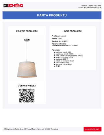 telefon: +48 61 4367 481 e-mail: [email protected] KARTA PRODUKTU ZDJĘCIE PRODUKTU OPIS PRODUKTU Producent Lucide Nazwa FISEL Symbol 08410/41/31 Rekomendowana cena konsumencka 441.57 PLN Parametry ● średnica (mm): 400 ● wysokość (mm): 1500 ● ilość źródeł / rodzaj trzonka: 2XE27 ● max moc źródła: 60 W ● napięcie: 230 V ● źródło w zestawie: brak ● kolor lampy: biały ● materiał: rattan/akryl ● IP: 20 ZOBACZ WIĘCEJ DELighting ul.Budowlana 10 Psary Małe k. Wrześni, 62-300 Września www.delighting.pl