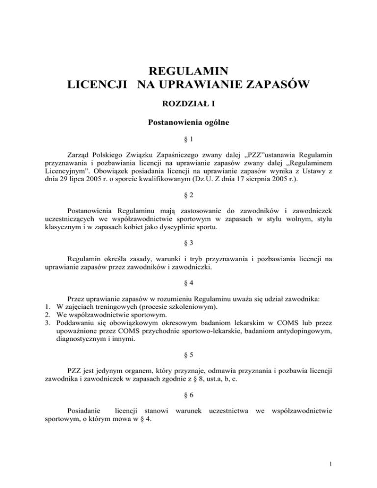 REGULAMIN LICENCJI NA UPRAWIANIE ZAPASÓW ROZDZIAŁ I Postanowienia ogólne §1 Zarząd Polskiego Związku Zapaśniczego zwany dalej „PZZ”ustanawia Regulamin przyznawania i pozbawiania licencji na uprawianie zapasów zwany dalej „Regulaminem Licencyjnym”. Obowiązek posiadania licencji na uprawianie zapasów wynika z Ustawy z dnia 29 lipca 2005 r. o sporcie kwalifikowanym (Dz.U. Z dnia 17 sierpnia 2005 r.). §2 Postanowienia Regulaminu mają zastosowanie do zawodników i zawodniczek uczestniczących we współzawodnictwie sportowym w zapasach w stylu wolnym, stylu klasycznym i w zapasach kobiet jako dyscyplinie sportu. §3 Regulamin określa zasady, warunki i tryb przyznawania i pozbawiania licencji na uprawianie zapasów przez zawodników i zawodniczki. §4 Przez uprawianie zapasów w rozumieniu Regulaminu uważa się udział zawodnika: 1. W zajęciach treningowych (procesie szkoleniowym). 2. We współzawodnictwie sportowym. 3. Poddawaniu się obowiązkowym okresowym badaniom lekarskim w COMS lub przez upoważnione przez COMS przychodnie sportowo-lekarskie, badaniom antydopingowym, diagnostycznym i innymi. §5 PZZ jest jedynym organem, który przyznaje, odmawia przyznania i pozbawia licencji zawodnika i zawodniczek w zapasach zgodnie z § 8, ust.a, b, c. §6 Posiadanie licencji stanowi warunek uczestnictwa we współzawodnictwie sportowym, o którym mowa w § 4. 1 §7 1. PZZ prowadzi ewidencję przyznanych licencji. 2. Ewidencja obejmuje także dokumenty załączone do wniosku o przyznanie licencji. 3. PZZ prowadzi odrębną ewidencję prawomocnych decyzji o odmowie przyznania i o pozbawieniu licencji oraz przechowuje dokumentację tych spraw. ROZDZIAŁ II Zasady przyznawania licencji §8 1. Licencję przyznaje: a) PZZ na czas określony jednego roku dla zawodników i zawodniczek od 15-roku życia i starszych uczestniczących we współzawodnictwie sportowym ogólnopolskim. b) Wojewódzkie/Okręgowe Związki Zapaśnicze zwane dalej „OZZ” na czas określony jednego roku dla zawodników i zawodniczek 13-14 uczestniczących we współzawodnictwie sportowym ogólnopolskim , regionalnym lub wojewódzkim. c) OZZ na czas określony jednego roku dla zawodników i zawodniczek od 15-roku życia i starszych uczestniczących tylko we współzawodnictwie sportowym regionalnym lub wojewódzkim. d) PZZ pobiera opłatę za przyznanie licencji w wysokości podanej w regulaminie i kalendarzu imprez sportowych w zapasach na dany rok. e) OZZ pobiera opłatę za przyznanie licencji w wysokości podanej w regulaminie i kalendarzu imprez sportowych w zapasach na dany rok. §9 1. Klub sportowy ubiegająca się o przyznanie licencji dla zawodników i zawodniczek składa w PZZ pisemny wniosek zawierający: a) imię i nazwisko, datę i miejsce urodzenia oraz adres zamieszkania zawodnika, zawodniczki, b) datę i podpis. 2. Do wniosku, o którym mowa w ust. 1 należy dołączyć: a) zobowiązanie do uczestnictwa we współzawodnictwie sportowym, b) zaświadczenie właściwej poradni sportowo-lekarskiej o dopuszczeniu do uprawiania zapasów lub uwierzytelnioną kopię książeczki sportowo-lekarskiej sportowca wraz z aktualnie ważnym badaniem lekarskim, c) zobowiązanie do wykonywania przewidzianych w przepisach obowiązków zawodnika oraz do przestrzegania warunków uprawiania zapasów, d) dwa zdjęcia. 3. Osoba niepełnoletnia dołącza do wniosku pisemną zgodę opiekunów prawnych na uprawianie zapasów i uczestniczenie we współzawodnictwie sportowym. 2 § 10 Klub sportowy przekazuje wniosek, o którym mowa w ust. 1 do PZZ w celu wykupienia licencji najpóźniej 15 dni przed zawodami lub w wyjątkowym przypadku licencje będą wystawiane zgodnie z procedurą na następujących zawodach podanych w regulaminie i kalendarzu imprez sportowych w zapasach na dany rok. § 11 1. 2. 3. PZZ (poprzez Komisję Sportową) przyznaje licencję w drodze decyzji administracyjnej. Dokument stwierdzający przyznanie licencji zawiera: a) imię i nazwisko, datę i miejsce urodzenia, PESEL, b) numer licencji c) wstęplowany na dany rok okres ważności licencji Licencja powinna być opatrzona zdjęciem, pieczęcią PZZ oraz wstęplowaną przynależnością klubową. § 12 1. 2. 3. Polski Związek Zapaśniczy może odmówić przyznania licencji, jeżeli wnioskodawca nie spełnił warunków określonych w § 9 ust. 1 a braki formalne nie zostały usunięte w terminie 14 dni od otrzymania wezwania do usunięcia braków. Licencji nie może uzyskać osoba, która uprawiając zapasy została: a) ukarana karą dożywotniej dyskwalifikacji, b) ukarana karą czasowej dyskwalifikacji – w czasie odbywania tej kary, c) pozbawiona licencji z przyczyn określonych w § 13 w okresie 2 lat od daty decyzji ostatecznej o pozbawieniu licencji. Odmowa przyznania licencji zapada w drodze uchwały Zarządu PZZ i wymaga uzasadnienia. ROZDZIAŁ III Zasady pozbawiania licencji § 13 1. PZZ (poprzez Komisję Sportową) pozbawia licencji w drodze decyzji administracyjnej w razie: a) stwierdzenia przez poradnię sportowo-lekarską niezdolności do uprawiania zapasów, b) rażącego nie przestrzegania Regulaminów PZZ, c) rażącego naruszenia zasad rywalizacji sportowej, d) rażącego naruszenia obowiązków zawodnika, e) naruszenia przepisów antydopingowych. 2. PZZ może pozbawić licencji w razie: a) odmowy uczestniczenia w reprezentacji kraju, b) odmowy zaprzestania udziału w procesie szkoleniowym i we współzawodnictwie sportowym, 3 c) odmowy poddania się obowiązkowym badaniom lekarskim lub antydopingowym. 3. Jeżeli przyczyny pozbawienia licencji wymienione w ust. 1 i 2 stanowią również przyczyny wszczęcia postępowania dyscyplinarnego, uchwała o pozbawieniu licencji może być wydana po zakończeniu tego postępowania orzeczeniem ostatecznym. 4. PZZ wszczyna postępowanie w przedmiocie pozbawienia licencji z urzędu lub na wniosek organizacji sportowej, do której zawodnik należy. 5. Pozbawienie zawodnika licencji wymaga pisem