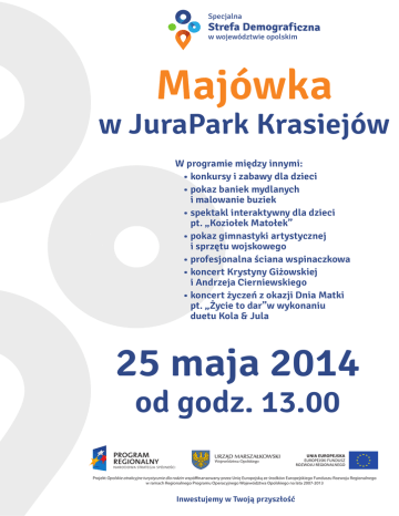 Majówka w JuraPark Krasiejów W programie między innymi: • konkursy i zabawy dla dzieci • pokaz baniek mydlanych i malowanie buziek • spektakl interaktywny dla dzieci pt. „Koziołek Matołek” • pokaz gimnastyki artystycznej i sprzętu wojskowego • profesjonalna ściana wspinaczkowa • koncert Krystyny Giżowskiej i Andrzeja Cierniewskiego • koncert życzeń z okazji Dnia Matki pt. „Życie to dar”w wykonaniu duetu Kola & Jula 25 maja 2014 od godz. 13.00 Projekt Opolskie atrakcyjne turystycznie dla rodzin współfinansowany przez Unię Europejską ze środków Europejskiego Funduszu Rozwoju Regionalnego w ramach Regionalnego Programu Operacyjnego Województwa Opolskiego na lata 2007-2013 Inwestujemy w Twoją przyszłość