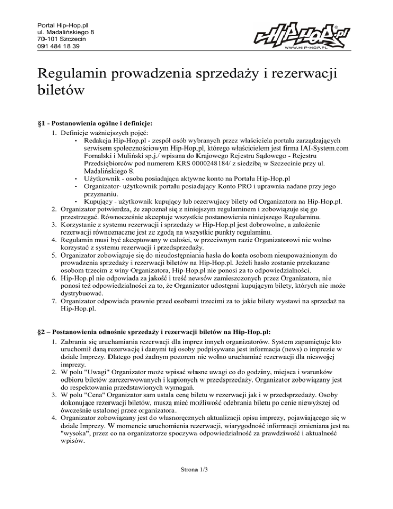 Portal Hip-Hop.pl ul. Madalińskiego 8 70-101 Szczecin 091 484 18 39 Regulamin prowadzenia sprzedaży i rezerwacji biletów §1 - Postanowienia ogólne i definicje: 1. Definicje ważniejszych pojęć: • Redakcja Hip-Hop.pl - zespół osób wybranych przez właściciela portalu zarządzających serwisem społecznościowym Hip-Hop.pl, którego właścicielem jest firma IAI-System.com Fornalski i Muliński sp.j./ wpisana do Krajowego Rejestru Sądowego - Rejestru Przedsiębiorców pod numerem KRS 0000248184/ z siedzibą w Szczecinie przy ul. Madalińskiego 8. • Użytkownik - osoba posiadająca aktywne konto na Portalu Hip-Hop.pl • Organizator- użytkownik portalu posiadający Konto PRO i uprawnia nadane przy jego przyznaniu. • Kupujący - użytkownik kupujący lub rezerwujacy bilety od Organizatora na Hip-Hop.pl. 2. Organizator potwierdza, że zapoznał się z niniejszym regulaminem i zobowiązuje się go przestrzegać. Równocześnie akceptuje wszystkie postanowienia niniejszego Regulaminu. 3. Korzystanie z systemu rezerwacji i sprzedaży w Hip-Hop.pl jest dobrowolne, a założenie rezerwacji równoznaczne jest ze zgodą na wszystkie punkty regulaminu. 4. Regulamin musi być akceptowany w całości, w przeciwnym razie Organizatorowi nie wolno korzystać z systemu rezerwacji i przedsprzedaży. 5. Organizator zobowiązuje się do nieudostępniania hasła do konta osobom nieupoważnionym do prowadzenia sprzedaży i rezerwacji biletów na Hip-Hop.pl. Jeżeli hasło zostanie przekazane osobom trzecim z winy Organizatora, Hip-Hop.pl nie ponosi za to odpowiedzialności. 6. Hip-Hop.pl nie odpowiada za jakość i treść newsów zamieszczonych przez Organizatora, nie ponosi też odpowiedzialności za to, że Organizator udostępni kupującym bilety, których nie może dystrybuować. 7. Organizator odpowiada prawnie przed osobami trzecimi za to jakie bilety wystawi na sprzedaż na Hip-Hop.pl. §2 – Postanowienia odnośnie sprzedaży i rezerwacji biletów na Hip-Hop.pl: 1. Zabrania się uruchamiania rezerwacji dla imprez innych organizatorów. System zapamiętuje kto uruchomił daną rezerwację i danymi tej osoby podpisywana jest informacja (news) o imprezie w dziale Imprezy. Dlatego pod żadnym pozorem nie wolno uruchamiać rezerwacji dla nieswojej imprezy. 2. W polu "Uwagi" Organizator może wpisać własne uwagi co do godziny, miejsca i warunków odbioru biletów zarezerwowanych i kupionych w przedsprzedaży. Organizator zobowiązany jest do respektowania przedstawionych wymagań. 3. W polu "Cena" Organizator sam ustala cenę biletu w rezerwacji jak i w przedsprzedaży. Osoby dokonujące rezerwacji biletów, muszą mieć możliwość odebrania biletu po cenie niewyższej od ówcześnie ustalonej przez organizatora. 4. Organizator zobowiązany jest do własnoręcznych aktualizacji opisu imprezy, pojawiającego się w dziale Imprezy. W momencie uruchomienia rezerwacji, wiarygodność informacji zmieniana jest na "wysoka", przez co na organizatorze spoczywa odpowiedzialność za prawdziwość i aktualność wpisów. Strona 1/3 Portal Hip-Hop.pl ul. Madalińskiego 8 70-101 Szczecin 091 484 18 39 5. Organizator zobowiązany jest do respektowania rezerwacji, jak również przedsprzedaży biletów zgłoszonych przez internet tj. wydrukowania i posiadania na imprezie listy rezerwacji i sprzedanych biletów. 6. Organizator zobowiązany jest do poinformowania przy pomocy "Mailing Listy" osób rezerwujących bilety, oraz kupujących bilety w przedsprzedaży, o wszelkich zmianach co do warunków przebiegu wydarzenia. Organizator bezwzględnie zobowiązany jest do poinformowania rezerwujących o odwołaniu, zmianie terminu lub uczestników koncertu, lub innej imprezy. 7. Osoby rezerwujące, lub nabywające bilety w przedsprzedaży są informowane przez e-mail o wszelkich działaniach systemu dotyczących ich zamówień, takich jak: 1. Przyjęcie zamówienia 2. Potwierdzenie zamówienia 3. Usunięcie zamówienia 4. Przyjęcie rezerwacji 5. Potwierdzenie rezerwacji 6. Zmiana danych w rezerwacji 7. Usunięcie rezerwacji 8. Dane z listy rezerwacji i przedsprzedaży, powinny zostać zabezpieczone przed dostępem do nich osób niepowołanych, zgodnie z Ustawą o Ochronie Danych Osobowych. 9. Dane Organizatora wprowadzane są przez operatorów Portalu Hip-Hop.pl. Organizator zobowiązany jest do informowania na bieżąco o wszelich zmianach, poprzez nadsyłanie e-mailem informacji na temat ewentualnych poprawek. 10.Dane pozyskane w drodze rezerwacji i przedsprzedaży biletów, są własnością Portalu Hip-Hop.pl. §3 - Postanowienia dotyczące przedsprzedaży: 1. Termin przedsprzedaży biletów upływa na 3 dni przed datą imprezy. Związane jest to z czasem niezbędnym do potwierdzenie wszelkich dokonanych transakcji. 2. Prowizja od wartości sprzedaży biletów jest ustalana indywidualnie dla każdej imprezy przez operatorów Hip-Hop.pl. 3. Istnieje możliwość zmiany cen w przedsprzedaży przez Organizatora. 4. Po dokonaniu zamówienia, użytkownik w zależności od wybranego sposobu płatności, proszony jest o jej uregulowanie. 5. Zamówienia są potwierdzane przez operatorów Hip-Hop.pl dopiero po wpłynięciu należności. 6. W przypadku gdy impreza, na którą prowadzona jest sprzedaż biletów, zostanie odwołana lub nastąpią rażące uchybienia w organizacji, które uniemożliwią osobom kupującym bilet na HipHop.pl uczestnictwo w niej, Portal zastrzega sobie prawo do zwrotu pieniędzy zakupione bilety. Jako rażące naruszenia rozumie się przede wszystkim: • impreza będzie trwała mniej niż 40% zaplanowanego czasu lub wystąpiło mniej niż 40% zaproszonych i wypisanych w informacjach oraz na plakatach wykonawców • swój przyjazd lub koncert odwoła wykonawca, który miał być główną gwiazdą wieczoru. Nie przewiduje się za to zwrotów za bilety, gdy nie wystąpią wykonawcy poprzedzający gwiazdę. • organizator nie wprowadzi do systemu informacji o swojej firmie, w tym: naz