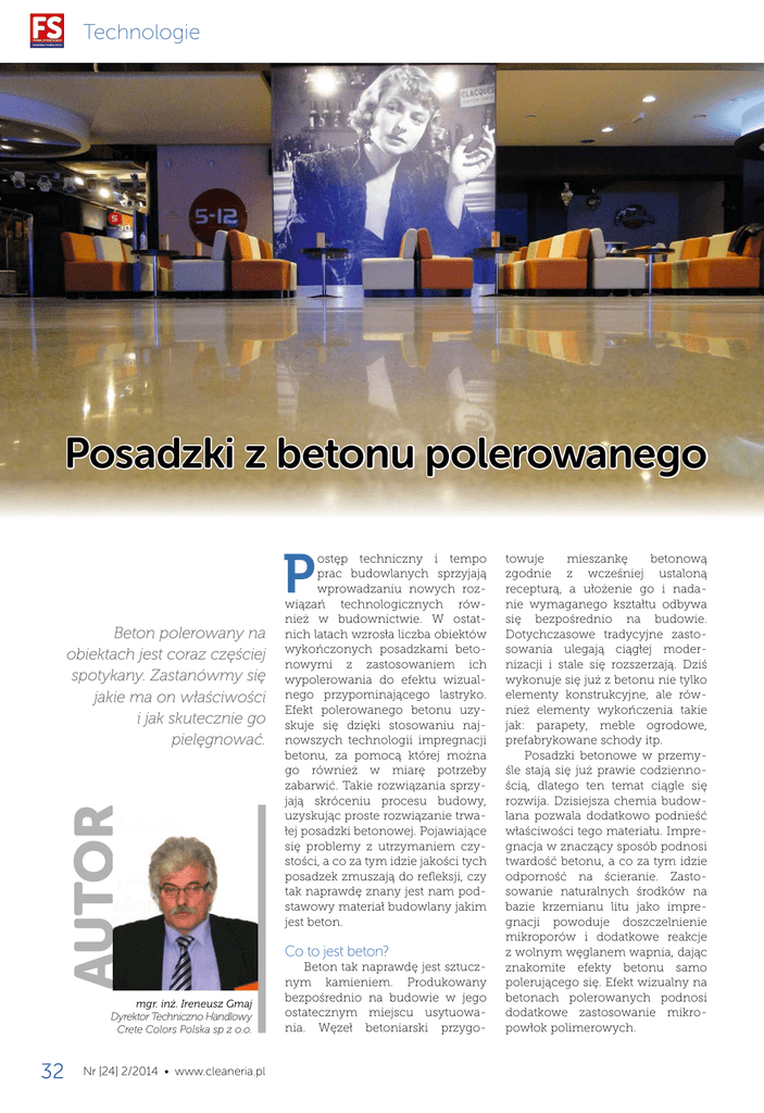 Technologie Posadzki z betonu polerowanego P AUTOR Beton polerowany na obiektach jest coraz częściej spotykany. Zastanówmy się jakie ma on właściwości i jak skutecznie go pielęgnować. mgr. inż. Ireneusz Gmaj Dyrektor Techniczno Handlowy Crete Colors Polska sp z o.o. 32 Nr [24] 2/2014 • www.cleaneria.pl ostęp techniczny i tempo prac budowlanych sprzyjają wprowadzaniu nowych rozwiązań technologicznych również w budownictwie. W ostatnich latach wzrosła liczba obiektów wykończonych posadzkami betonowymi z zastosowaniem ich wypolerowania do efektu wizualnego przypominającego lastryko. Efekt polerowanego betonu uzyskuje się dzięki stosowaniu najnowszych technologii impregnacji betonu, za pomocą której można go również w miarę potrzeby zabarwić. Takie rozwiązania sprzyjają skróceniu procesu budowy, uzyskując proste rozwiązanie trwałej posadzki betonowej. Pojawiające się problemy z utrzymaniem czystości, a co za tym idzie jakości tych posadzek zmuszają do refleksji, czy tak naprawdę znany jest nam podstawowy materiał budowlany jakim jest beton. Co to jest beton? Beton tak naprawdę jest sztucznym kamieniem. Produkowany bezpośrednio na budowie w jego ostatecznym miejscu usytuowania. Węzeł betoniarski przygo- towuje mieszankę betonową zgodnie z wcześniej ustaloną recepturą, a ułożenie go i nadanie wymaganego kształtu odbywa się bezpośrednio na budowie. Dotychczasowe tradycyjne zastosowania ulegają ciągłej modernizacji i stale się rozszerzają. Dziś wykonuje się już z betonu nie tylko elementy konstrukcyjne, ale również elementy wykończenia takie jak: parapety, meble ogrodowe, prefabrykowane schody itp. Posadzki betonowe w przemyśle stają się już prawie codziennością, dlatego ten temat ciągle się rozwija. Dzisiejsza chemia budowlana pozwala dodatkowo podnieść właściwości tego materiału. Impregnacja w znaczący sposób podnosi twardość betonu, a co za tym idzie odporność na ścieranie. Zastosowanie naturalnych środków na bazie krzemianu litu jako impregnacji powoduje doszczelnienie mikroporów i dodatkowe reakcje z wolnym węglanem wapnia, dając znakomite efekty betonu samo polerującego się. Efekt wizualny na betonach polerowanych podnosi dodatkowe zastosowanie mikropowłok polimerowych. Technologie Bardzo ważną sprawą jest świadomość użytkownika posadzki ze sztucznego kamienia – beton to jednak nie to samo co drogie posadzki marmurowe, granitowe czy z innych tym podobnych kamieni naturalnych. Jak już wspominałem beton to sztuczny kamień czyli produkt reakcyjny, w którym mogą zachodzić i zachodzą reakcje chemiczne w kontakcie z różnymi środkami chemicznymi. Środki do pielęgnacji i utrzymania czystości w trakcie jego eksploatacji są takimi produktami. Impregnacja zabezpiecza w pewnym stopniu przed wnikaniem ich w głąb betonu, ale kontakt powierzchniowy nadal pozostaje. Posadzka wykonana z betonu, jako produktu reakcyjnego, zachowuje swoje wszystkie parametry wytrzymałościowe jeżeli jego pH będzie powyżej 11. Po obniżeniu się tego pH rozpoczynają się procesy erozji betonu, które po kontakcie z dwutlenkiem węgla z powietrza rozpoczynają proces utraty parametrów wytrzymałościowych. Zaczyna w betonie wytwarzać się wolny węglan wapnia, który migruje za pomocą wody na powierzchnię i tu w postaci kurzu zostaje usunięty. Beton zaczyna powiększać swoją porowatość i zwiększa się automatycznie jego nasiąkliwość. Migracja wody w betonie doprowadza do równoczesnej migracji dwutlenku węgla i proces erozji betonu zaczyna nabierać tempa. Producenci chemii budowlanej do impregnacji betonu znają te zjawiska i dlatego pracują stale nad udoskonalaniem swoich produktów. Trudno jest znaleźć jedno lekarstwo na wszystkie dolegliwości, również nie ma złotego impregnatu na wszystkie właściwości betonu. Dla użytkownika utrzymanie jego własnych właściwości, nie dopuszczając do procesów erozji, jest wystarczające. Problem w tym, że nie wszyscy użytkownicy są tego świadomi i bardzo często traktują posadzkę z betonu wypolerowanego jak polerowany kamień. Beton nie może być traktowany w ten sposób i należy pamiętać o utrzymaniu jego własnego pH na odpowiednim poziomie nawet podczas jego pielęgnacji. Dlatego należy stosować środki do pielęgnacji o odczynach alkalicznych nie posiadających w swoim składzie soli i fosforanów. Mamy na rynku impregnaty zabezpieczające przed agresywnym działaniem soli, ale stosowane one są do zabezpieczeń powierzchni dróg, placów manewrowych itp. Tego typu impregnaty nie są stosowane podczas polerowania betonów w pomieszczeniach zamkniętych, gdyż zakłada się nie stosowanie tam soli przeciw mrozowych. Jeżeli chodzi o fosforany, to normy dla betonu określają maksymalne występowanie ich w kruszywie użytym do produkcji betonu, natomiast w naturalnym ich eksploatowaniu nie ma do nich dostępu w innej postaci jak w środkach myjących. Ze względu na brak dużego zagrożenia ich występowania nikt nie myśli o specjalnych impregnatach do zabezpieczenia przeciwko nim. Podchodząc do utrzymania czystości polerowanych posadzek betonowych, należy pamiętać o mogących wystąpić niekontrolowanych reakcjach chemicznych w betonie. Podczas polerowania (na etapie wstępnego szlifowania) podawany jest najczęściej impregnat zabezpieczający przed głębokim wnikaniem wody mający właściwości wzmacniające. Stosuje się tu najczęściej krzemiany sodu, potasu czy litu. Każdy z nich działa w podobny sposób, różnią się głębokością wnikania w podłoże betonowe, sposobem aplikacji i rodzajem ich wewnętrznej krystalizacji oraz reakcji ze środowiskiem wewnętrznych struktur betonu. Najpopularniejszym, ze względu na głębokość wnikania, jest dziś krzemian litu. Nie tylko pod tym wzglę- dem wiedzie on prym na rynku budowlanym. Jego sposób krystalizacji nie jest trwały, przez co pozostaje on, po 