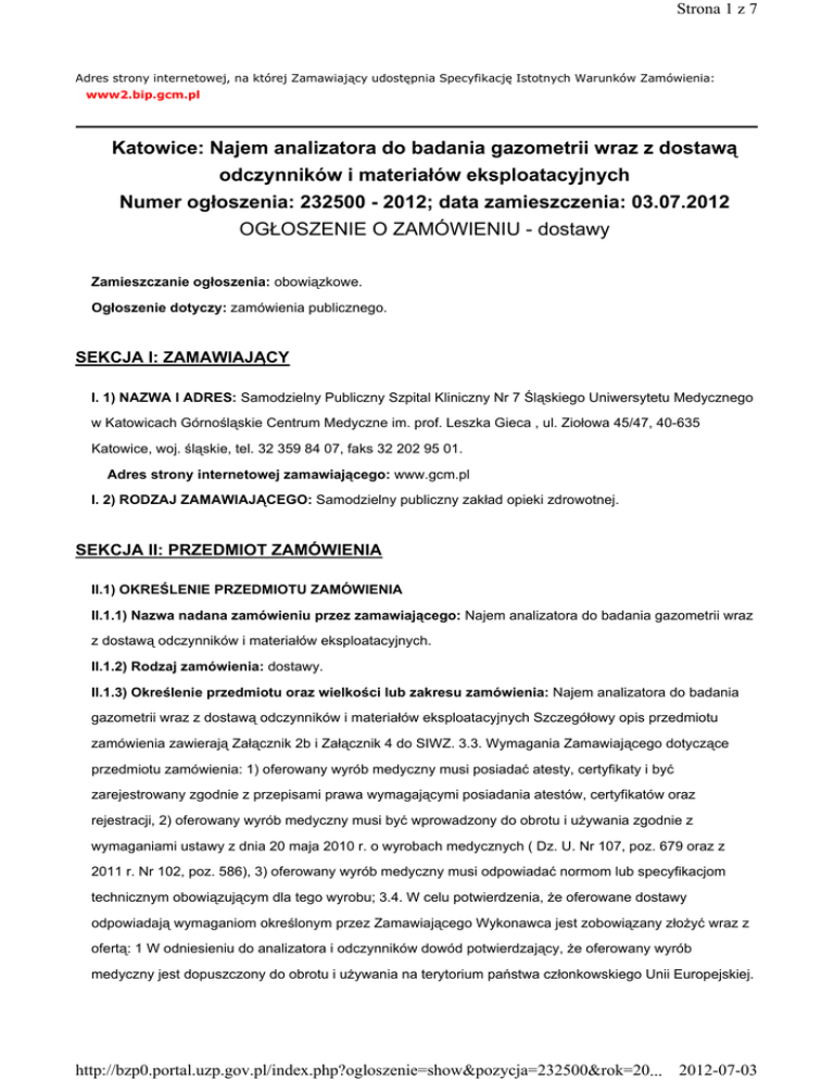 Strona 1 z 7 Adres strony internetowej, na której Zamawiający udostępnia Specyfikację Istotnych Warunków Zamówienia: www2.bip.gcm.pl Katowice: Najem analizatora do badania gazometrii wraz z dostawą odczynników i materiałów eksploatacyjnych Numer ogłoszenia: 232500 - 2012; data zamieszczenia: 03.07.2012 OGŁOSZENIE O ZAMÓWIENIU - dostawy Zamieszczanie ogłoszenia: obowiązkowe. Ogłoszenie dotyczy: zamówienia publicznego. SEKCJA I: ZAMAWIAJĄCY I. 1) NAZWA I ADRES: Samodzielny Publiczny Szpital Kliniczny Nr 7 Śląskiego Uniwersytetu Medycznego w Katowicach Górnośląskie Centrum Medyczne im. prof. Leszka Gieca , ul. Ziołowa 45/47, 40-635 Katowice, woj. śląskie, tel. 32 359 84 07, faks 32 202 95 01. Adres strony internetowej zamawiającego: www.gcm.pl I. 2) RODZAJ ZAMAWIAJĄCEGO: Samodzielny publiczny zakład opieki zdrowotnej. SEKCJA II: PRZEDMIOT ZAMÓWIENIA II.1) OKREŚLENIE PRZEDMIOTU ZAMÓWIENIA II.1.1) Nazwa nadana zamówieniu przez zamawiającego: Najem analizatora do badania gazometrii wraz z dostawą odczynników i materiałów eksploatacyjnych. II.1.2) Rodzaj zamówienia: dostawy. II.1.3) Określenie przedmiotu oraz wielkości lub zakresu zamówienia: Najem analizatora do badania gazometrii wraz z dostawą odczynników i materiałów eksploatacyjnych Szczegółowy opis przedmiotu zamówienia zawierają Załącznik 2b i Załącznik 4 do SIWZ. 3.3. Wymagania Zamawiającego dotyczące przedmiotu zamówienia: 1) oferowany wyrób medyczny musi posiadać atesty, certyfikaty i być zarejestrowany zgodnie z przepisami prawa wymagającymi posiadania atestów, certyfikatów oraz rejestracji, 2) oferowany wyrób medyczny musi być wprowadzony do obrotu i uŜywania zgodnie z wymaganiami ustawy z dnia 20 maja 2010 r. o wyrobach medycznych ( Dz. U. Nr 107, poz. 679 oraz z 2011 r. Nr 102, poz. 586), 3) oferowany wyrób medyczny musi odpowiadać normom lub specyfikacjom technicznym obowiązującym dla tego wyrobu; 3.4. W celu potwierdzenia, Ŝe oferowane dostawy odpowiadają wymaganiom określonym przez Zamawiającego Wykonawca jest zobowiązany złoŜyć wraz z ofertą: 1 W odniesieniu do analizatora i odczynników dowód potwierdzający, Ŝe oferowany wyrób medyczny jest dopuszczony do obrotu i uŜywania na terytorium państwa członkowskiego Unii Europejskiej. http://bzp0.portal.uzp.gov.pl/index.php?ogloszenie=show&pozycja=232500&rok=20... 2012-07-03 Strona 2 z 7 Dokumenty, jakie musi złoŜyć Wykonawca: a) oświadczenie wytwórcy lub jego autoryzowanego przedstawiciela, stwierdzające na jego wyłączną odpowiedzialność, Ŝe wyrób jest zgodny z wymaganiami zasadniczymi (deklaracja zgodności); b) certyfikat zgodności wydany przez jednostkę notyfikowaną w zakresie wyrobów medycznych (certyfikat CE), - w formie oryginału lub kopii poświadczonej za zgodność z oryginałem przez Wykonawcę; W przypadku Wykonawców wspólnie ubiegających się o udzielenie zamówienia, o których mowa w art. 23 Pzp, dokumenty te składa pełnomocnik tych Wykonawców; 2 W odniesieniu do analizatora i opatrunków dane katalogowe potwierdzające jednoznacznie zgodność parametrów zaoferowanego przedmiotu zamówienia z określonymi w SIWZ; - w formie oryginału lub kopii poświadczonej za zgodność z oryginałem przez Wykonawcę; W przypadku Wykonawców wspólnie ubiegających się o udzielenie zamówienia, o których mowa w art. 23 Pzp, dokumenty te składa pełnomocnik tych Wykonawców; 3 W odniesieniu do analizatora Opis urządzeń technicznych, szczegółowe instrukcje obsługi w języku polskim z uwzględnieniem wymogów dotyczących konserwacji bieŜącej i okresowej analizatora, opis potwierdzający jednoznacznie zgodność parametrów zaoferowanego przedmiotu zamówienia z określonymi w SIWZ - w formie oryginału lub kopii poświadczonej za zgodność z oryginałem przez Wykonawcę; W przypadku Wykonawców wspólnie ubiegających się o udzielenie zamówienia, o których mowa w art. 23 Pzp, dokumenty te składa pełnomocnik tych Wykonawców; 4 W odniesieniu do odczynników i materiałów eksploatacyjnych Karty charakterystyki substancji niebezpiecznych (jeśli odczynniki lub materiały eksploatacyjne zawierają substancje wymieniane w ustawie o odpadach i opakowaniach po substancjach niebezpiecznych); - w formie oryginału lub kopii poświadczonej za zgodność z oryginałem przez Wykonawcę; W przypadku Wykonawców wspólnie ubiegających się o udzielenie zamówienia, o których mowa w art. 23 Pzp, dokumenty te składa pełnomocnik tych Wykonawców; 5 W odniesieniu do odczynników i materiałów eksploatacyjnych Dokładne instrukcje uŜytkowania zestawów z opisem między innymi protokołu badania, trwałości odczynników po otwarciu zestawu (konieczna informacja), przygotowania odczynników, interpretacji wyników - instrukcja w języku producenta, a w przypadku gdy jest ona w języku innym niŜ polski - równieŜ instrukcja obsługi w języku polskim. - w formie oryginału lub kopii poświadczonej za zgodność z oryginałem przez Wykonawcę; W przypadku Wykonawców wspólnie ubiegających się o udzielenie zamówienia, o których mowa w art. 23 Pzp, dokumenty te składa pełnomocnik tych Wykonawców. II.1.4) Czy przewiduje się udzielenie zamówień uzupełniających: tak. Określenie przedmiotu oraz wielkości lub zakresu zamówień uzupełniających Zamawiający przewiduje udzielanie zamówień uzupełniających, o których mowa w art. 67 ust. 1 pkt 7 Pzp. II.1.5) Wspólny Słownik Zamówień (CPV): 38.43.40.00-6, 33.69.63.00-8, 33.69.65.00-0. II.1.6) Czy dopuszcza się złoŜenie oferty częściowej: nie. II.1.7) Czy dopuszcza się złoŜenie oferty wariantowej: nie. http://bzp0.portal.uzp.gov.pl/index.php?ogloszenie=show&pozycja=232500&rok=20... 2012-07-03 Strona 3 z 7 II.2) CZAS TRWANIA ZAMÓWIENIA LUB TERMIN WYKONANIA: Okres w miesiącach: 36. SEKCJA III: INFORMACJE O CHARAKTERZE PRAWNYM, EKONOMICZNYM, FINANSOWYM I TECHNICZNYM III.1) WADIUM Informacja na temat wa