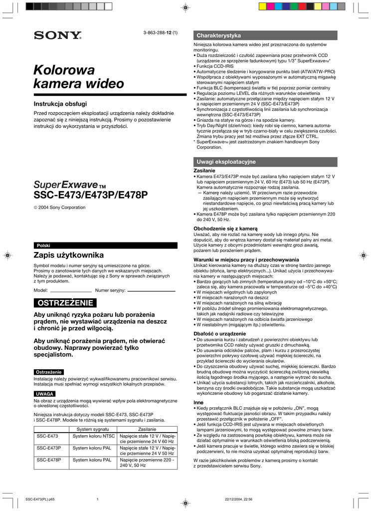 3-863-288-12 (1) Kolorowa kamera wideo Instrukcja obs∏ugi Przed rozpocz´ciem eksploatacji urzàdzenia nale˝y dok∏adnie zapoznaç si´ z niniejszà instrukcjà. Prosimy o pozostawienie instrukcji do wykorzystania w przysz∏oÊci. Charakterystyka Niniejsza kolorowa kamera wideo jest przeznaczona do systemów monitoringu. • Du˝a rozdzielczoÊç i czu∏oÊç zapewniana przez przetwornik CCD (urzàdzenie ze sprz´˝enie ∏adunkowym) typu 1/3” SuperExwaveTM* • Funkcja CCD-IRIS • Automatyczne Êledzenie i korygowanie punktu bieli (ATW/ATW-PRO) • Wspó∏praca z obiektywami wyposa˝onymi w automatycznà migawk´ sterowanymi napi´ciem sta∏ym • Funkcja BLC (kompensacji Êwiat∏a w tle) poprzez pomiar centralny • Regulacja poziomu LEVEL dla ró˝nych warunków oÊwietlenia • Zasilanie: automatyczne prze∏àczanie mi´dzy napi´ciem sta∏ym 12 V a napi´ciem przemiennym 24 V (SSC-E473/E473P) • Synchronizacja z cz´stotliwoÊcià linii zasilania lub synchronizacja wewn´trzna (SSC-E473/E473P) • Gniazda na statyw na górze i na spodzie kamery. • Tryb Day/Night (dzieƒ/noc): kiedy robi si´ ciemno, kamera automatycznie prze∏àcza si´ w tryb czarno-bia∏y w celu zwi´kszenia czu∏oÊci. Zmiana trybu pracy jest te˝ mo˝liwa przez z∏àcze EXT CTRL. * SuperExwaveTM jest zastrze˝onym znakiem handlowym Sony Corporation. Uwagi eksploatacyjne Zasilanie TM SSC-E473/E473P/E478P 2004 Sony Corporation • Kamera E473/E473P mo˝e byç zasilana tylko napi´ciem sta∏ym 12 V lub napi´ciem przemiennym 24 V, 60 Hz (E473) lub 50 Hz (E473P). Kamera automatycznie rozpoznaje rodzaj zasilania. — Kamer´ nale˝y uziemiç. W przeciwnym razie przewodzie zasilajàcym napi´ciem przemiennym mo˝e si´ wytworzyç niestandardowe napi´cie, co grozi niew∏aÊciwà pracà kamery lub jej uszkodzeniem. • Kamera E478P mo˝e byç zasilana tylko napi´ciem przemiennym 220 do 240 V, 50 Hz. Obchodzenie si´ z kamerà Uwa˝aç, aby nie rozlaç na kamer´ wody lub innego p∏ynu. Nie dopuÊciç, aby do wn´trza kamery dosta∏ si´ materia∏ palny ani metal. U˝ycie kamery z obcymi przedmiotami wewnàtrz grozi awarià, po˝arem lub pora˝eniem pràdem. Polski Zapis u˝ytkownika Warunki w miejscu pracy i przechowywania Symbol modelu i numer seryjny sà umieszczone na górze. Prosimy o zanotowanie tych danych we wskazanych miejscach. Nale˝y je podawaç, kontaktujàc si´ z Sony w sprawach zwiàzanych z tym produktem. Model: Numer seryjny: OSTRZE˚ENIE Aby uniknàç ryzyka po˝aru lub pora˝enia pràdem, nie wystawiaç urzàdzenia na deszcz i chroniç je przed wilgocià. Unikaç kierowania kamery na d∏u˝szy czas w stron´ bardzo jasnego obiektu (s∏oƒca, lamp elektrycznych...). Unikaç u˝ycia i przechowywania kamery w nast´pujàcych miejscach: • Bardzo goràcych lub zimnych (temperatura pracy od –10°C do +50°C; zaleca si´, aby kamera pracowa∏a w temperaturze od –5°C do +40°C) • W miejscach wilgotnych lub zapylonych • W miejscach nara˝onych na deszcz • W miejscach nara˝onych na silnà wibracj´ • W pobli˝u êróde∏ silnego promieniowania elektromagnetycznego, takich jak nadajniki radiowe czy telewizyjne • W miejscach nara˝onych na odbicia Êwiat∏a jarzeniowego • W niestabilnym (migajàcym itp.) oÊwietleniu. Dba∏oÊç o urzàdzenie Aby uniknàç pora˝enia pràdem, nie otwieraç obudowy. Naprawy powierzaç tylko specjalistom. Ostrze˝enie Instalacj´ nale˝y powierzyç wykwalifikowanemu pracownikowi serwisu. Instalacja musi spe∏niaç wymogi wszystkich lokalnych przepisów. UWAGA Na obraz z urzàdzenia mogà wywieraç wp∏yw pola elektromagnetyczne o okreÊlonej cz´stotliwoÊci. Niniejsza instrukcja dotyczy modeli SSC-E473, SSC-E473P i SSC-E478P. Modele te ró˝nià si´ systemami sygna∏u i zasilania. SSC-E473 System sygna∏u System koloru NTSC SSC-E473P System koloru PAL SSC-E478P System koloru PAL Zasilanie Napi´cie sta∏e 12 V / Napi´cie przemienne 24 V 60 Hz Napi´cie sta∏e 12 V / Napi´cie przemienne 24 V 50 Hz Napi´cie przemienne 220 240 V, 50 Hz • Do usuwania kurzu i zabrudzeƒ z powierzchni obiektywu lub przetwornika CCD nale˝y u˝ywaç gruszki z dmuchawkà. • Do usuwania odcisków palców, plam i kurzu z przezroczystej powierzchni pokrywy czo∏owej u˝ywaç mi´kkiej Êciereczki, na przyk∏ad Êciereczki do wycierania okularów. • Do czyszczenia obudowy u˝ywaç suchej, mi´kkiej Êciereczki. Bardzo brudnà obudow´ mo˝na wyczyÊciç Êciereczkà zwil˝onà niewielkà iloÊcià ∏agodnego Êrodka myjàcego, a nast´pnie wytrzeç do sucha. • Unikaç u˝ycia substancji lotnych, takich jak rozcieƒczalniki, alkohole, benzyna czy Êrodki owadobójcze. Takie substancje mogà uszkadzaç wykoƒczenie obudowy lub pogarszaç dzia∏anie kamery. Inne • Kiedy prze∏àcznik BLC znajduje si´ w po∏o˝eniu „ON”, mogà wyst´powaç fluktuacje jasnoÊci obrazu. W takim przypadku nale˝y przestawiç prze∏àcznik w po∏o˝enie „OFF”. • JeÊli funkcja CCD-IRIS jest u˝ywana w miejscach oÊwietlonych lampami jarzeniowymi, to mogà wyst´powaç powolne zmiany barw. • Ze wzgl´du na zastosowanà pow∏ok´ obiektywu, kamera mo˝e nie dzia∏aç optymalnie w warunkach oÊwietlenia bliskà podczerwienià. • JeÊli kamera pracuje w Êwietle, którego widmo zawiera si´ w bliskiej podczerwieni, to nie mo˝na uzyskaç optymalnej reprodukcji barw. W razie jakichkolwiek problemów z kamerà prosimy o kontakt z przedstawicielem serwisu Sony. 1 SSC-E473(PL).p65 1 22/12/2004, 22:56 Zapewni to automatyczne korygowanie czu∏oÊci zale˝nie od iloÊci Êwiat∏a wejÊciowego. W przypadku obiektywu z automatycznà migawkà prze∏àcznik powinien si´ znajdowaç w po∏o˝eniu „OFF”. A SSC-E473/E473P/ E478P 5: Prze∏àcznik ATW/ATW-PRO Kamera automatycznie koryguje balans bieli zale˝nie od temperatury barwy êród∏a Êwiat∏a. JeÊli filmowanie odbywa si´ w specjalnym oÊwietleniu, na przyk∏ad pod lampami sodowymi, p
