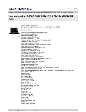 ELEKTRONIK S.C. Utworzono : 08 marzec 2017 Mobile - Notebooki > Notebooki > Lenovo IdeaPad B580G B820 2GB 15 6 LED HD 320GB INT DOS Lenovo IdeaPad B580G B820 2GB 15 6 LED HD 320GB INT DOS Model : MOBLEVNOT1140 Lenovo IdeaPad B580G B820 2GB 15 6 LED HD 320GB INT DOS Producent : Lenovo Gwarancja: 12 miesięcy gwarancji fabrycznej Kod Producenta: 59-335546 Procesor (producent): Intel� Procesor (rodzaj): Dual Core Procesor (taktowanie): 1,7 GHz Procesor (opis): Intel� Pentium� Processor B820 Technologia Intel vPro: Nie Matryca (przekątna): 15,6 cale Matryca (rozdzielczość): WXGA 1366 x 768 (16:9) Matryca (powłoka): świecąca Pamięć zainstalowana (pojemność): 2 GB Pamięć (zajęte/wolne sloty): 1 /1 Pamięć (max. pojemność): 8 GB Pamięć (technologia): DDRIII 1600MHz Dysk twardy (pojemność): 320 GB Dysk twardy (interfejs): SATA II Dysk twardy (prędkość): 5400 obr/min Napęd optyczny (typ): Super Multi DVD+/-RW/RAM Karta graficzna (producent): Intel� Karta graficzna (model): Intel Integrated Karta dźwiękowa: Realtek Podświetlana klawiatura: Nie Wbudowany mikrofon: Tak Karta sieciowa przewodowa: 10/100/1000 Mbps Gigabit Ethernet Karta sieciowa bezprzewodowa: Tak Karta sieciowa bezprzewodowa (opis): Intel� Centrino� Wireless-N 2230 (2x2) BGN +BT BLE (Jackson Peak 1) Bluetooth: Nie Modem 3G: Nie Fax modem: Nie ExpressCard 34: Nie ExpressCard 54: Nie Czytnik Smart Card: Nie E-SATA: Nie Czytnik linii papilarnych: Nie Platforma szyfrująca TPM: Nie Kensington Lock: Nie Display Port: Nie DVI-D: Nie HDMI: Tak VGA (RGB): Tak S-video/TV-out: Nie AV-in (Tuner TV): Nie Line-in: Nie Line-out: Tak Wejście mikrofonu: Tak S/PDIF: Nie RS232 (szeregowy): Nie kontakt : - [email protected] Strona 1 ELEKTRONIK S.C. Utworzono : 08 marzec 2017 Mobile - Notebooki > Notebooki > Lenovo IdeaPad B580G B820 2GB 15 6 LED HD 320GB INT DOS Lenovo IdeaPad B580G B820 2GB 15 6 LED HD 320GB INT DOS Czytnik kart pamięci: Tak Czytnik kart pamięci (opis): 4 in 1 (2in1 tech ready) Panel klawiszy multimedialnych: Nie Złącze replikatora portów: Nie Fire-Wire (IEEE1394): Nie USB 2.0: 2 szt. USB 3.0: 2 szt. System operacyjny: Brak systemu operacyjnego System operacyjny (wer. Językowa): Brak systemu operacyjnego Wbudowana kamera: Tak Akumulator (technologia): 6 Cell Akumulator (pojemność): 2200 mAh Akumulator (czas pracy): 6 h Wymiary (wysokość): 33 mm Wymiary (szerokość): 378 mm Wymiary (głębokość): 252 mm Waga: 2,35 kg Gwarancja: 24 mies Gwarancja międzynarodowa: Tak Gwarancja baterii: 12 mies Wyposażenie: Zasilacz sieciowy Cena : 1.489,91 zł Brutto ( 1.221,24 zł Netto) Dostępność: Produkt dostępny w naszym sklepie od 17 lipiec 2012 kontakt : - [email protected] Strona 2