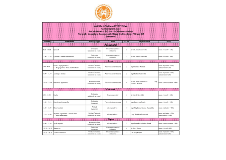 WYŻSZA SZKOŁA ARTYSTYCZNA Harmonogram zajęć Rok akademicki 2013/2014 - Semestr zimowy Kierunek: Malarstwo, Specjalność: Obraz Multimedialny / Grupa GR Semestr III Godziny Przedmiot Rodzaj zajęć Sala ECTS Wykładowca Uwagi Poniedziałek 8.30 - 10.55 Rysunek Ćwiczenia (zaliczenie na ocenę) Pracownia rysunku i malarstwa 3 dr hab.Anna Klonowska (suma ćwiczeń = 45h) 11.00 - 12.30 Rysunek z elementami anatomii Ćwiczenia (zaliczenie na ocenę) Pracownia rysunku i malarstwa 2 dr hab.Anna Klonowska (suma ćwiczeń = 30h) Środa 8.00 - 9.30 10.00 - 11.30 Grafika trójwymiarowa F- dla specjalności Obraz multimedialny Animacje i montaż 11.40 - 17.00 Pracownia dyplomowa Wykład/Ćwiczenia (zaliczenie na ocenę) Pracownia komputerowa 2 mgr Tomasz Woźniak (suma wykładów = 10h, suma ćwiczeń=20h) Wykład/Ćwiczenia (zaliczenie na ocenę) Pracownia komputerowa 2 mgr Robert Manowski (suma wykładów = 10h, suma ćwiczeń=20h) Konwersatorium (zaliczenie na ocenę) Pracownia komputerowa 4 dr hab. Anna Klonowska/ Tomasz Woźniak mgr (suma konwersatorium =90h) Czwartek Ćwiczenia (zaliczenie na ocenę) Pracownia rzeźby 4 dr Marek Kowalski (suma ćwiczeń = 60h) Liternictwo i typografia Ćwiczenia (egzamin) Pracownia komputerowa 3 mgr Katarzyna Szarek (suma ćwiczeń = 30h) Historia sztuki Wykład (egzamin) sala wykładowa 1 2 mgr Magdalena Kucza - Kuczyńska (suma wykładów = 30h) Wykład/Ćwiczenia (zaliczenie na ocenę) sala wykładowa 1 2 8.30 - 11.30 Rzeźba 11.40 - 13.10 13.20 - 15.00 15.10 - 16.50 Wybrane zagadnienia z historii filmu F - Obraz Multimedialny mgr Wojciech Starostecki (suma wykładów = 20h, suma ćwiczeń =10h) Piątek 10.00 - 11.30 Język angielski 11.30 - 14.30 Malarstwo 14.40 - 16.10 Techniki malarskie Konwersatorium (zaliczenie na ocenę) sala wykładowa 1 Ćwiczenia (egzamin) Wykład/Ćwiczenia (zaliczenie na ocenę) Pracownia rysunku i malarstwa Pracownia rysunku i malarstwa 1 mgr Beata Kwiecińska - Sobek (suma konwersatorium =30h) 4 dr Jerzy Korput (suma ćwiczeń=60h) 2 dr Jerzy Korput (suma wykładów = 10h, suma ćwiczeń=20h)