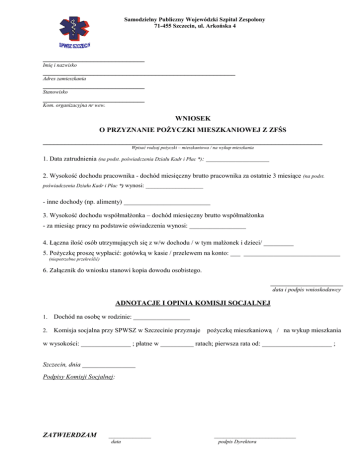 Samodzielny Publiczny Wojewódzki Szpital Zespolony 71-455 Szczecin, ul. Arkońska 4 ____________________________ Imię i nazwisko _____________________________________________________ Adres zamieszkania ____________________________ Stanowisko ____________________________ Kom. organizacyjna nr wew. WNIOSEK O PRZYZNANIE POŻYCZKI MIESZKANIOWEJ Z ZFŚS _____________________________________________________________________________ Wpisać rodzaj pożyczki – mieszkaniowa / na wykup mieszkania 1. Data zatrudnienia (na podst. poświadczenia Działu Kadr i Płac *): ___________________ 2. Wysokość dochodu pracownika - dochód miesięczny brutto pracownika za ostatnie 3 miesiące (na podst. poświadczenia Działu Kadr i Płac *) wynosi: ___________________ - inne dochody (np. alimenty) __________________________ 3. Wysokość dochodu współmałżonka – dochód miesięczny brutto współmałżonka - za miesiąc pracy na podstawie oświadczenia wynosi: _________________ 4. Łączna ilość osób utrzymujących się z w/w dochodu / w tym małżonek i dzieci/ _________ 5. Pożyczkę proszę wypłacić: gotówką w kasie / przelewem na konto: ___ _____________________________ (niepotrzebne przekreślić) 6. Załącznik do wniosku stanowi kopia dowodu osobistego. ________________________ data i podpis wnioskodawcy ADNOTACJE I OPINIA KOMISJI SOCJALNEJ 1. Dochód na osobę w rodzinie: _________________ 2. Komisja socjalna przy SPWSZ w Szczecinie przyznaje pożyczkę mieszkaniową / na wykup mieszkania w wysokości: _______________ ; płatne w __________ ratach; pierwsza rata od: _____________________ ; Szczecin, dnia ________________ Podpisy Komisji Socjalnej: ZATWIERDZAM ______________ data ___________________________ podpis Dyrektora