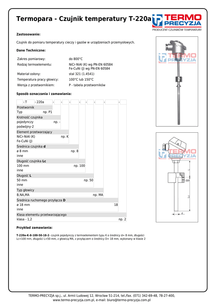 Termopara - Czujnik temperatury T-220a Zastosowanie: Czujnik do pomiaru temperatury cieczy i gazów w urządzeniach przemysłowych. Dane Techniczne: Zakres pomiarowy: do 800°C Rodzaj termoelementu: NiCr-NiAl (K) wg PN-EN 60584 Fe-CuNi (J) wg PN-EN 60584 Materiał osłony: stal 321 (1.4541) Temperatura pracy głowicy: 100°C lub 150°C Wersja z przetwornikiem: P - tabela przetworników Sposób oznaczania i zamawiania: -T - 220a Przetwornik Typ - - - - - - - - np. P1 Krotność czujnika pojedynczy podwójny-2 Element przetwarzający NiCr-NiAl (K) Fe-CuNi (J) np. - np. K Średnica czujnika d ø 8 mm inne Długość czujnika Lc 100 mm inne Długość L 50 mm inne Typ głowicy B,NA,MA Średnica ruchomego przyłącza D ø 18 mm inne Klasa elementu przetwarzającego klasa - 1,2 np. 8 np. 100 np. 50 np. MA 18 np. 2 Przykład zamawiania: T-220a-K-8-100-50-18-2- czujnik pojedynczy z termoelementem typu K o średnicy d= 8 mm, długości Lc=100 mm, długości L=50 mm, z głowicą MA, z przyłączem o średnicy D= 18 mm, wykonany w klasie 2 TERMO-PRECYZJA sp.j., ul. Armii Ludowej 12, Wrocław 51-214, tel./fax. (071) 342-69-48, 78-27-400, www.termo-precyzja.com.pl, e-mail: [email protected]