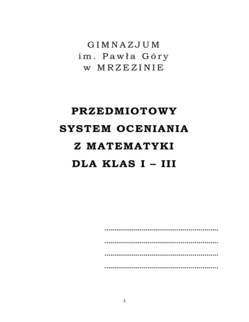 GIMNAZJUM im. Pawła Góry w MRZEZINIE PRZEDMIOTOWY SYSTEM OCENIANIA Z MATEMATYKI DLA KLAS I – III ………………………………...............……. ………………………………...............……. ………………………………...............……. ………………………………...............……. 1 I. GŁÓWNE ZAŁOŻENIA PSO: 1. Ocenianie w matematyce powinno wskazywać, jakie wiadomości i umiejętności są najważniejsze dla uczniów w procesie uczenia się i nauczania i być na to nakierowane (uczniowie wiedzą, czego będą sie uczyć 2. Zadania stosowane w procesie oceniania powinny nakłaniać uczniów do stosowania zdobytej wiedzy w różnych aspektach; a uczeń poprzez uświadomienie sobie co umie, a czego jeszcze nie , powinien stać się czynnym uczestnikiem procesu oceniania. 3. Przy ocenianiu osiągnięć ucznia powinno sie stworzyć okazje do zaprezentowania przez niego swojej wiedzy i umiejętności w różny sposób. 4. Jasne i precyzyjne określenie zasad oceniania poszczególnych form aktywności oraz ustalania oceny semestralnej i rocznej (uczniowie wiedza co i kiedy będzie podlegać ocenie, jakie są zasady oceniania oraz znają kryteria ocen). 5. Informacje zdobyte w procesie oceniania powinny umożliwiać jak największą pewność wnioskowania o wiedzy i umiejętnościach ucznia. II. OBSZARY AKTYWNOŚCI PODLEGAJĄCE OCENIE: Na lekcjach matematyki oceniane są następujące obszary aktywności ucznia: 1. Rozumienie pojęć matematycznych i znajomości ich definicji. 2. Znajomość i stosowanie poznanych twierdzeń. 3. Samodzielne lub w grupie przeprowadzanie rozumowań i wnioskowań. 4. Rozwiązywanie zadań z wykorzystaniem poznanych metod. 5. Posługiwanie się symboliką i językiem matematyki. 6. Matematyczny sposób analizowania tekstów. 7. Logiczne rozumowanie, kojarzenie faktów, myślenie abstrakcyjne i stosowanie 8. poznanej wiedzy w rozwiązywaniu zadań problemowych. 9. Aktywność na lekcjach, praca w grupach i wkład pracy ucznia. 10. Prowadzenie zeszytu. III. SPRAWDZANIE I OCENIANIE OSIĄGNIEĆ UCZNIÓW 1. Formy aktywności: prace klasowe (testy), sprawdziany, kartkówki, odpowiedzi ustne, praca samodzielna na lekcji, prace domowe, zeszyt przedmiotowy, aktywność na lekcji , praca w grupie, przygotowanie do lekcji, udział w konkursach matematycznych, 2 2. Formy aktywności - częstotliwość w semestrze: Prace klasowe (ewentualnie testy) – minimum dwie Sprawdziany Kartkówki Aktywność i praca na lekcji oraz przygotowanie do lekcji na bieżąco Prace domowe Zeszyt przedmiotowy Określenie pojęć zgodne z WSO: wypowiedzi pisemne: praca klasowa – z określonego materiału poprzedzona powtórzeniem, zapisana i zapowiedziana z tygodniowym wyprzedzeniem, test – praca pisemna zawierająca zadania zamknięte lub zadania zamknięte i otwarte, przeprowadzona w zamian za pracę klasową i na takich samych zasadach, sprawdzian – obejmuje materiał 3 – 5 jednostek lekcyjnych ( zapowiedziany na ostatniej lekcji), kartkówka – niezapowiedziana praca obejmująca materiał z 1 – 3 ostatnich jednostek lekcyjnych, prace domowe ucznia – podlegają sprawdzeniu, ale nie zawsze ocenie, zeszyt przedmiotowy – minimum raz w semestrze, ale nie zawsze podlega ocenie, wypowiedzi ustne: odpowiedzi z ostatnich 3 lekcji, aktywność na lekcji. 3. Skala ocen: a. Oceny bieżące, oceny klasyfikacyjne półroczne i oceny roczne ustala się w stopniach według następującej skali: ocena celująca – 6 ocena bardzo dobra – 5 ocena dobra – 4 ocena dostateczna – 3 ocena dopuszczająca – 2 ocena niedostateczna – 1 Wystawiając oceny klasyfikacyjne półroczne dopuszcza się stosowanie przy powyższych ocenach znaków „- ‘’ i „+” b. Stosuje sie określoną wagę ocen dla poszczególnych form aktywności ucznia oraz sposób zapisu w dzienniku. praca klasowa – 3x – kolor czerwony sprawdzian – 2x – kolor czerwony kartkówka – 1x praca samodzielna na lekcji – 2x odpowiedzi ustne – 1x praca domowa – 1x aktywność na lekcji i zajęciach pozalekcyjnych – 1x zeszyt przedmiotowy – 1x Ocenę klasyfikacyjną półroczną i roczną wystawia sie z uwzględnieniem wyżej wymienionej wagi. Ocena klasyfikacyjna półroczna i roczna nie jest średnią ocen bieżących. 3 W przypadku wystawiania ocen półrocznych i rocznych ocenę celująca otrzymuje uczeń, który jest laureatem konkursów lub olimpiad matematycznych lub systematycznie rozwiązuje zadania dodatkowe z poziomu „W” w trakcie prac klasowych ( przy rozwiązaniu wszystkich pozostałych zadań z niższych poziomów) oraz zadania dodatkowe z poziomu „W” w trakcie lekcji i z zadań domowych „dla chętnych” w czasie półrocza. IV. KRYTERIA OCEN BIEŻĄCYCH ( WYMAGANIA NA POSZCZEGÓLNĄ OCENĘ): celujący: otrzymuje uczeń, który swoją wiedzą wyraźnie wykracza poza obowiązujące wymagania programowe - rozwiązuje zadania z poziomu W oraz wszystkie zadania z pozostałych poziomów, bardzo dobry: otrzymuje uczeń, który opanował wiadomości z poziomów K, P, R i co najmniej 50% wiadomości z poziomu D, dobry: otrzymuje uczeń, który opanował wiadomości z poziomów K, P i co najmniej 50% wiadomości z poziomu R, dostateczny: otrzymuje uczeń, który opanował wiadomości z poziomu K i co najmniej 50% wiadomości z poziomu P, dopuszczający: otrzymuje uczeń, który opanował wiadomości z poziomu K, niedostateczny: otrzymuje uczeń, który nie opanował wiadomości i umiejętności określonych na poziomie K, a braki uniemożliwiają zdobywanie dalszej wiedzy. Nie potrafi rozwiązywać zadań o niewielkim stopniu trudności, nawet przy pomocy nauczyciela. Nie zna podstawowych określeń matematycznych. *** Wyjaśnienie określeń: K- poziom wymagań konieczny (odpowiada ocenie dopuszczającej), P - poziom wymagań podstawowy (odpowiada ocenie dostatecznej), R - poziom wymagań rozszerzający (odpowiada ocenie dobrej), D - pozi