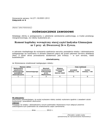 Oznaczenie sprawy: IM.271.18.00001.2012 Załącznik nr 6 ………………………………….. (Nazwa i adres Wykonawcy) DOŚWIADCZENIE ZAWODOWE Składając ofertę w postępowaniu o udzielenie zamówienia publicznego, w trybie przetargu nieograniczonego, na roboty budowlane pn.: Remont kapitalny wewnętrzny starej części budynku Gimnazjum nr 1 przy ul. Dworcowej 26 w śywcu. w zakresie niezbędnego do wykazania spełnienia warunku posiadania wiedzy i doświadczenia polegającego na wykonaniu w okresie ostatnich pięciu lat przed upływem terminu składania ofert, a jeŜeli okres prowadzenia działalności jest krótszy – w tym okresie, robót budowlanych oświadczamy, Ŝe Wykonawca zrealizował następujące roboty: Nazwa i adres Wykonawcy (podmiotu) wykazującego Zamawiającego posiadane doświadczenie 1 2 Czas realizacji Wartość zamówienia wykonanego przez Wykonawcę Miejsce wykonania robót Zakres robót początek miesiąc / rok koniec miesiąc / rok 3 4 5 6 W załączeniu: dokumenty potwierdzające, Ŝe wyŜej wykazane roboty zostały wykonane zgodnie z zasadami sztuki budowlanej i prawidłowo ukończone. UWAGA ! Polegając na wiedzy i doświadczeniu innych podmiotów Wykonawca musi załączyć pisemne zobowiązanie tych podmiotów do zrealizowania części zamówienia. .............................. dnia ................ 2012 r. ......................................................... (Pieczątka i podpis osoby upowaŜnionej do reprezentowania Wykonawcy)