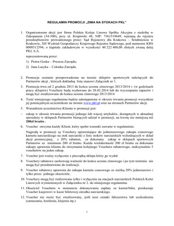 REGULAMIN PROMOCJI „ZIMA NA STOKACH PKL” 1. Organizatorem akcji jest firma Polskie Koleje Linowe Spółka Akcyjna z siedzibę w Zakopanem (34-500), przy ul. Krupówki 48, NIP: 7361519649, wpisaną do rejestru przedsiębiorców prowadzonego przez: Sąd Rejonowy dla Krakowa – Śródmieścia w Krakowie, XII Wydział Gospodarczy Krajowego Rejestru Sądowego, pod numerem KRS 0000312594, o kapitale zakładowym w wysokości 40 222 400,00 złotych zwaną dalej PKL S.A. reprezentowaną przez: 1) Piotra Goska – Prezesa Zarządu; 2) Jana Lasyka – Członka Zarządu. 2. Promocja zostanie przeprowadzona na terenie sklepów sportowych należących do Partnerów akcji , których dokładną listę stanowi Załącznik nr 1. 3. Promocja trwa od 2 grudnia 2013 do końca sezonu zimowego 2013/2014 r. (w godzinach pracy sklepów) Vouchery będą wydawane do 28.02.2014 lub do wyczerpania zapasów i mogą być zrealizowane do końca sezonu zimowego 2013/2014 4. Treść niniejszego regulaminu będzie udostępniona w okresie trwania promocji wszystkim jej potencjalnym uczestnikom na stronie www.pkl.pl oraz na stronach Partnerów akcji. 5. Warunkiem uczestnictwa Klienta w promocji jest: zakup w okresie trwania promocji jednego lub więcej artykułów, dostępnych w aktualnej sprzedaży w sklepach Partnerów biorących udział w promocji, na kwotę nie mniejszą niż 200zł brutto . 6. Voucher otrzyma każdy Klient, który spełni warunki zawarte w regulaminie. Nagrodą w promocji są Vouchery uprawniające do jednorazowego zakupu czasowego karnetu narciarskiego na stok narciarski z listy stoków narciarskich wchodzących w skład akcji promocyjnej, z 20% rabatem, za dokonany zakup w sklepach sportowych Partnerów za minimum 200 zł brutto. Każda wielokrotność 200 zł brutto za dokonane zakupy uprawnia klienta do otrzymania kolejnego Voucheru rabatowego, maksymalnie 5 voucherów na jeden zakup. 7. Voucher jest ważny wyłącznie z pieczątką sklepu który go wydał. 8. Vouchery rabatowe zachowują ważność do końca sezonu zimowego i po tym terminie nie mogą być przedstawione do realizacji. 9. Voucher rabatowy uprawnia do zakupu karnetu czasowego ze zniżką 20% jednorazowo i tylko przez jednego okaziciela . 10. Vouchery mogą być realizowane tylko i wyłącznie na stacjach narciarskich Polskich Kolei Linowych wymienionych w Załączniku nr 2. do niniejszego regulaminu 11. Okaziciel Voucheru w momencie dokonywania zapłaty za karnet/bilet, przekazuje Voucher kasjerowi w kasie biletowej ośrodka narciarskiego. 12. Voucher nie może być zrealizowany, jeśli nosi oznaki fałszerstwa lub uszkodzenia (zamazania, kreślenia, klejenia itp.) 1 13. W przypadku uszkodzenia bonu duplikat nie będzie wydawany. 14. Voucher może być zrealizowany jednorazowo i przez jedną osobę na wybranym stoku narciarskim z listy podanej na bonie i w dziale obsługi klienta. ( 1 voucher = zniżka 20% na jeden karnet czasowy) 15. Wydanie nagrody / Vouchera nastąpi bezpośrednio po dokonaniu zakupu w kasie. Pracownik działu obsługi klienta lub starszy kasjer obliczy wartość zakupów i na tej podstawie wyda odpowiednią ilość voucherów. 16. Vouchery będą wydawane w dniach 02.12.2013 – do 28.02.2014 na terenie sklepów biorących udział w promocji w godzinach pracy sklepów. Odebranie nagrody jest możliwe jedynie w sklepie, w którym zostały dokonane zakupy objęte promocją, zgodnie z niniejszym regulaminem. 17. Reklamacje dotyczące przebiegu promocji mogą być zgłaszane w ciągu 7 dni od daty zakończenia promocji pod adres organizatora Polskie Koleje Linowe ul. Krupówki 48 Zakopane lub mailowo na adres e-mail.: [email protected] 18. Polskie Koleje Linowe ponoszą odpowiedzialność za treść Regulaminu Promocji. 19. Polskie Koleje Linowe zastrzegają sobie prawo do wprowadzania zmian w regulaminie stosownym aneksem i ogłoszenia ich. 20. Promocje w Polskich Kolejach Linowych S.A. nie sumują się. 2 Załącznik nr 1. Wykaz sklepów biorących udział w promocji „Zima na stokach PKL” WYKAZ SKLEPÓW INTERSPORT Białystok, Alfa Bielsko-Biała, Sfera Bydgoszcz, Focus Mall Bytom, CH Atrium Plejada Częstochowa, Galeria Jurajska Gdańsk, Galeria Bałtycka Gdańsk, Madison Gdynia, Centrum Riviera Kielce, Galeria Korona Katowice, Silesia Kraków, Galeria Krakowska Gorzów Wlkp. , Galeria Nova Park Kraków, Zakopianka Łódź, ul. Kilińskiego Łódź, Manufaktura Opole, CH Solaris Center Płock, Galeria WISŁA Poznań, King Cross Marcelin Poznań, M1 Poznań, Stary Browar Poznań, Galeria Pestka Radom, Galeria Słoneczna Rzeszów, CH Millenium Hall Szczecin, Kaskada Warszawa, Arkadia Warszawa, Sadyba Best Mall Warszawa, ul. Sójki 37 Warszawa, Złote Tarasy Wrocław, Borek Wrocław, Magnolia Park Wrocław, Pasaż Grunwaldzki Zakopane, Wierchy ul. Świętojańska 15, 15-277 Białystok ul. Mostowa 5, 43-300 Bielsko-Biała ul. Jagiellońska 39-47, 85-097 Bydgoszcz ul. Jana Nowaka Jeziorańskiego 25, 41-923 Bytom al. Wojska Polskiego 207, 42-202 Częstochowa al. Grunwaldzka 141, 80-264 Gdańsk ul. Rajska 10, 80-850 Gdańsk ul. Kazimierza Górskiego 2, 81-304 Gdynia ul. Warszawska 26, 25-312 Kielce ul. Chorzowska 107, 40-101 Katowice ul. Pawia 5, 31-154 Kraków ul. Przemysłowa 2, 66-400 Gorzów Wielkopolski ul. Zakopiańska, 30-418 Kraków ul. Kilińskiego 122 - 128, 90-013 Łódź ul. Karskiego 5, 91-071 Łódź pl. Kopernika 16, 45-040 Opole ul. Wyszogrodzka 144, 09-410 Płock ul. Bukowska 156, 60-198 Poznań ul. Szwajcarska 14, 61-285 Poznań ul. Półwiejska 42, 61-888 Poznań al. Solidarności 47, 61-696 Poznań ul. Chrobrego 1, 26-600 Radom al. Majora Wacława Kopisto 1, 35‐315 Rzeszów al. Niepodległości 36, 70-404 Szczecin al. Jana Pawła II 82, 00-175 Warszawa ul. Powsińska 31, 02-903 Warszawa ul. Sójki 37, 02-812 Warszawa ul. Złota 59, 00-120 Warszawa al. gen. J. Hallera 52, 50-984 Wrocław ul. Legnicka 58, 54-204 Wrocław pl. Grunwaldzki 22, 50-363 Wrocław ul. Tetmajera 2, 34-500 Zakopane 3 Z