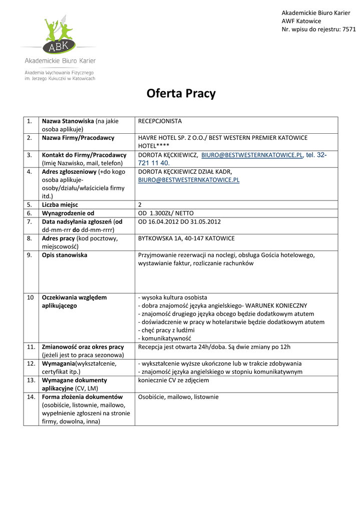 Akademickie Biuro Karier AWF Katowice Nr. wpisu do rejestru: 7571 Oferta Pracy 1. 2. 3. 4. 5. 6. 7. 8. 9. 10 Nazwa Stanowiska (na jakie osoba aplikuje) Nazwa Firmy/Pracodawcy Kontakt do Firmy/Pracodawcy (Imię Nazwisko, mail, telefon) Adres zgłoszeniowy (+do kogo osoba aplikujeosoby/działu/właściciela firmy itd.) Liczba miejsc Wynagrodzenie od Data nadsyłania zgłoszeń (od dd-mm-rrr do dd-mm-rrrr) Adres pracy (kod pocztowy, miejscowość) Opis stanowiska Oczekiwania względem aplikującego 11. Zmianowość oraz okres pracy (jeżeli jest to praca sezonowa) 12. Wymagania(wykształcenie, certyfikat itp.) 13. Wymagane dokumenty aplikacyjne (CV, LM) 14. Forma złożenia dokumentów (osobiście, listownie, mailowo, wypełnienie zgłoszeni na stronie firmy, dowolna, inna) RECEPCJONISTA HAVRE HOTEL SP. Z O.O./ BEST WESTERN PREMIER KATOWICE HOTEL**** DOROTA KĘCKIEWICZ, [email protected], tel. 32721 11 40. DOROTA KĘCKIEWICZ DZIAŁ KADR, [email protected] 2 OD 1.300ZŁ/ NETTO OD 16.04.2012 DO 31.05.2012 BYTKOWSKA 1A, 40-147 KATOWICE Przyjmowanie rezerwacji na noclegi, obsługa Gościa hotelowego, wystawianie faktur, rozliczanie rachunków - wysoka kultura osobista - dobra znajomość języka angielskiego- WARUNEK KONIECZNY - znajomość drugiego języka obcego będzie dodatkowym atutem - doświadczenie w pracy w hotelarstwie będzie dodatkowym atutem - chęć pracy z ludźmi - komunikatywność Recepcja jest otwarta 24h/doba. Są dwie zmiany po 12h - wykształcenie wyższe ukończone lub w trakcie zdobywania - znajomość języka angielskiego w stopniu komunikatywnym koniecznie CV ze zdjęciem Osobiście, mailowo, listownie