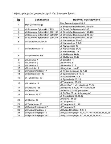 Wykaz placyków gospodarczych Os. Stroszek Bytom lp 1 2 3 4 5 6 7 8 9 10 11 12 13 14 15 16 17 18 19 20 21 22 23 24 25 Lokalizacja Plac Żeromskiego Budynki obsługiwane Plac Żeromskiego 4,5,6,7 ul. Strzelców Bytomskich 209-215 ul.Strzelców Bytomskich 205 ul. Strzelców Bytomskich 205 ul.Strzelców Bytomskich 192-196 ul. Strzelców Bytomskich 192-196 ul.Strzelców Bytomskich 229-237 ul. Strzelców Bytomskich 223-237 ul.Strzelców Bytomskich 239-247 ul. Strzelców Bytomskich 239-247 ul. Narutowicza 22A-G ul.Narutowicza 22A-G ul. Narutowicza 8 A-C ul. Narutowicza 10 ul.Narutowicza 10 ul. Narutowicza 6A-C ul. Narutowicza 14 ul. Myśliwska 4A-B ul.Myśliwska 4A-B ul. Myśliwska 3A-B ul.Łokietka 1 ul. Łokietka 1 ul.Łokietka 3 ul.Łokietka 3 ul.Łokietka 5 ul.Łokietka 5 , 7 ul.Legnicka 1 ul.Legnicka 1 A- E ul.Rydza Śmigłego 17 ul. Rydza Śmigłego 17 A-D ul.Spółdzielców 10 ul. Spółdzielców 8,10,12 ul.Spółdzielców 4, 6 ul.Tysiaclecia 23 ul. Tysiaclecia 23, 25 ul.Tysiąclecia 27, 29, ul.Łokietka 11 ul.Łokietka 11, ul.Tysiąclecia 41AB ul.Drzewna 24 ul.Drzewna 6-10,12-16,18,20,22,24 ul.Okólna 34 ul.Okólna 32 - 42 (parzyste) ul. Okólna 29 - 41 (nieparzyste) ul.Okólna 29 A ul. Tysiąclecia 13,15,17 ul.Okólna 44-50 ul.Okólna 50 ul.Tysiąclecia 11 ul.Tysiaclecia 21 ul.Tysiąclecia 21, 19 ul.Rydza-Śmigłego 5-7 ul.Tysiąclecia 6 ul.Rydza Śmigłego 8 ul.Rydza Śmigłego 4, 6, 8 ul.Rydza Śmigłego 10 ul.Rydza Śmigłego 10,12,14,16,18,20,22,24,26,28 ul.Rydza Śmigłego 38 ul.Rydza Śmigłego 30 ,32,34,36,38,40,42 Wykaz placyków gospodarczych Os. Ziętka Bytom LP. 1. 2. Lokalizacja ul.Szymały 121 A-B ul. Szymały 117A-B 3. 4. 5 6. 7. 8 9. ul. Szymały 153-155 ul. Szymały 204-206 ul. Szymały 220-222 ul. Szymały 156-158 ul. Strzelców Byt. 238A ul. Strzelców Byt. 240 ul. Hlonda 26 10. 11. 12 13. 14. 15. 16. 17. 18. ul. Hlonda 46-48 ul. Hlonda 1-11 (na parkingu) ul. Hlonda 31 ul. Hlonda 99-101 ul. Hlonda 103 ul. Leszczyka 44-46 ul. Modrzewiowa 43A-B ul. Modrzewiowa 51A-B ul. Hlonda 108-110 Budynki obsługiwane ul.Szymały 111ab,113ab,119ab, 121 ab,123-127 ul. Szymały 115 AB, 117 AB,129-135, 137-145, 145-149 ul. Szymały 151-153,155-161 ul.Szymały 204-206 , 212-218 ul. Szymały 224-226,222-220 ul.Szymały 140 do 188 (parzyste) ul.Strzelców Byt. 236-236D, 238-238A; ul.Strzelców Byt. 240-240D, 242-242A; ul. Hlonda 26-28-30, ul. Strzelców Byt. 244-244B, 246-246D ul.Hlonda 32-46, 48-52 ul. Hlonda 25A-27, 1-3, 5-9, 11-15 ul. Hlonda 29-31, 33-35, 39-43A ul. Hlonda 99,101 ul. Hlonda- 103 ul.Leszczyka 34-36,38-40B, 44-46 ul. Modrzewiowa 33-35, 37-41, 43 AB ul. Modrzewiowa 51A-B, 53A-B ul. Hlonda 104-106, 108-110 Wykaz placyków gospodarczych Radzionków Lp 1 2 3 Lokalizacja ul.Knosały 2-14 ul.Knosały 18 A i Bul.Knosały 71-73 4 ul.Knosały 85 5 ul.Knosały 111 6 ul.Krzywa 21 7 8 ul.Śródmiejska 5 A-F ul.Sadowa 28 9 ul.Sadowa 58 10 ul. Sadowa 86 11 ul.Sadowa 100 Budynki obsługiwane ul. Knosały 2-14 ul.Knosały 18 AB ul.Knosały 53-55 ul.Knosały 57 ul.Knosały 59-61 ul.Knosały 63-65-67-69 ul.Knosały 71-73 ul. Knosały 75-83 ul.Knosały 85 ul.Knosały 87-89 ul.Knosały 91-93 ul.Knosały 95-97 ul.Knosały 99 ul.Knosały 101 do 109 ul.Knosały 111 ul.Krzywa 13-15 ul.Krzywa 17-19 ul.Krzywa 21 ul.Krzywa 25-27 ul.Śródmiejska 5 A-F ul.Knosały 111 A ul.Sadowa 24-26 ul.Sadzowa 28 ul.Sadowa 30-32 ul.Sadowa 34-36-38 ul.Sadowa 40 do 50 ul.Sadowa 52 ul.Sadowa 54-56 ul.Sadowa 58 ul.Sadowa 60-62 ul.Sadowa 64-66-68 ul. Sadowa 70 do 78 ul.Sadowa 80 ul.Sadowa 82-84 ul.Sadowa 86 ul.Sadowa 88-90 ul.Sadowa 92-94-96 ul.Sadowa 98-100-102 ul.Sadowa 104-106 garaże ul. Sadowa 12 ul. Miedziowa 2 13 ul. Miedziowa 5 14 ul. Miedziowa 8 15 ul. Miedziowa 16 16 ul. Kużaja 72 ul. Nałkowskiej 1 ul.Miedziowa 2 ul.Miedziowa 4 ul. Miedziowa 1 ul. Miedziowa 3 ul. Miedziowa 5 ul. Miedziowa 6 ul.Miedziowa 8 ul. Miedziowa 10 ul. Miedziowa 12 ul. Miedziowa 14 ul. Miedziowa 16 garaże ul.Miedziowa ul.Kużaja 72 ab ul.Kużaja 74 abcd