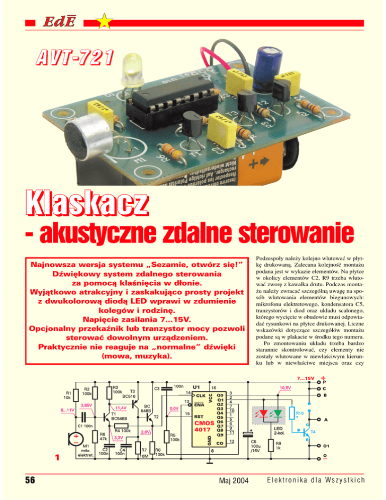A V T -7 2 1 Klaskacz - akustyczne zdalne sterowanie Najnowsza wersja systemu „Sezamie, otwórz się!” Dźwiękowy system zdalnego sterowania za pomocą klaśnięcia w dłonie. Wyjątkowo atrakcyjny i zaskakująco prosty projekt z dwukolorową diodą LED wprawi w zdumienie kolegów i rodzinę. Napięcie zasilania 7...15V. Opcjonalny przekaźnik lub tranzystor mocy pozwoli sterować dowolnym urządzeniem. Praktycznie nie reaguje na „normalne” dźwięki (mowa, muzyka). Podzespoły należy kolejno wlutować w płyt− kę drukowaną. Zalecana kolejność montażu podana jest w wykazie elementów. Na płytce w okolicy elementów C2, R9 trzeba wluto− wać zworę z kawałka drutu. Podczas monta− żu należy zwracać szczególną uwagę na spo− sób wlutowania elementów biegunowych: mikrofonu elektretowego, kondensatora C5, tranzystorów i diod oraz układu scalonego, którego wycięcie w obudowie musi odpowia− dać rysunkowi na płytce drukowanej. Liczne wskazówki dotyczące szczegółów montażu podane są w plakacie w środku tego numeru. Po zmontowaniu układu trzeba bardzo starannie skontrolować, czy elementy nie zostały wlutowane w niewłaściwym kierun− ku lub w niewłaściwe miejsca oraz czy 1 56 E l e k t ro n i k a d l a Ws z y s t k i c h podczas lutowania nie powstały zwarcia punktów lutowniczych. Po skontrolowaniu popra− wności montażu można dołą− czyć źródło zasilania: baterię 9− woltową lub zasilacz stabilizo− wany. Układ bezbłędnie zmon− towany ze sprawnych elemen− tów od razu będzie poprawnie pracował. Model pokazany na foto− grafiach reaguje na klaskanie 2a nawet z odległości 5m. Wyka− zuje przy tym zaskakująco małą czułość na „normalne” dźwięki, takie jak mowa czy spokojna muzyka. Układ można zasilać napięciem stałym w zakresie 7...15V z baterii lub zasilacza sta− bilizowanego. Przy napięciu 9,0V pobór prądu modelu wynosi około 6,6mA, a przy 12V − 10mA. Na schemacie ideowym poda− ne są napięcia stałe w kluczowych punktach układu, mierzone w spoczynku względem masy przy zasilaniu napięciem 12V z zasila− cza stabilizowanego (napięcia w różnych egzemplarzach układu mogą się różnić od podanych nawet o 20%). Tylko dla dociekliwych − działanie układu Układ składa się z dwóch zasadniczych blo− ków − czujnika dźwiękowego ze wzmacnia− czem tranzystorowym oraz przerzutnika T zrealizowanego na scalonym liczniku U1 (CMOS 4017). Sygnał z mikrofonu elektreto− wego jest wzmacniany we wzmacniaczu z trzema tranzystorami T1...T3. Obwód R4, C2 zapewnia niezbędne ujemne sprzężenie zwrot− ne. Wzmacniacz ten jest nietypowy, ponieważ wzmacnia tylko przebiegi o wysokich częstot− liwościach. Dzięki temu słabo reaguje na „normalne” dźwięki mowy czy muzyki. Dla wyższych częstotliwości akustycznych kon− densator C2 stanowi niemal zwarcie, więc stopień z tranzystorem T1 ma dla takich przebiegów duże wzmocnienie. Dla małych częstotliwości stopień ten ma wzmocnienie bliskie jedności, ponieważ kondensator C2 ma dużą impedancję, a wartość R4 jest równa R3. Pojawienie się silnego sygnału zawiera− jącego znaczną ilość składowych o wyższych częstotliwościach powoduje reakcję układu: dodatnie połówki sygnału z mikrofonu powodują dodatkowe otwarcie T1, a to otwiera T3. Rośnie napięcie na R7. Wzmac− niacz jest nietypowy, ponieważ zawiera obwód R7, C4 oraz dodatkowy bufor−wtór− nik w postaci tranzystora T2. Klaśnięcie w dłonie powoduje szybkie naładowanie kondensatora C4 przez tranzystor T3, a potem powolne jego rozładowywanie przez R7. Dzięki obecności bufora T2 po klaśnię− ciu na R8, a więc także na wejściu zegaro− wym układu 4017 występuje impuls dodatni, powodujący zmianę stanu licznika. Zwięk− E l e k t ro n i k a d l a Ws z y s t k i c h 2b szenie napięcia na R8, a w konsekwencji także na C2 powoduje zatkanie tranzystora T1, przez co wzmacniacz na czas rozładowania C4 przez R7 zostaje praktycznie wyłączony. Obecność kondensatora „pamiętającego” C4 zapewnia więc zliczenie tylko jednego impul− su i zablokowanie wzmacniacza na około sekundę, co gwarantuje prawidłową pracę licznika U1, pracującego tu jako przerzutnik typu T. Licznik CMOS 4017 zachowuje się jak przerzutnik T − liczy 0−1−0−1−itd., a to dzię− ki dołączeniu wyjścia Q2 do wejścia zerujące− go RST. Dodatkowy obwód R5C3 zapewnia wyzerowanie licznika po włączeniu zasilania. Stan przerzutnika pokazuje dwukolorowa dioda LED − każde klaśniecie w dłonie spo− woduje zmianę koloru świecenia lampki. Możliwości zmian W wersji podstawowej nie są montowane elementy R10, T4. Elementem wykonaw− czym jest dwukolorowa dioda LED, której Wykaz elementów (w kolejności lutowania) 1 2 3 4 5 6 7 8 9 10 11 12 13 14 15 16 17 18 19 20 21 22 23 zwora z drutu (blisko C2, R8) R1 − 10kΩ (brąz−czar.−pom.−złoty) R2 − 100kΩ (brąz−czar.−żółty−złoty) R3 − 100kΩ (brąz−czar.−żółty−złoty) R4 − 100kΩ (brąz−czar.−żółty−złoty) R5 − 100kΩ (brąz−czar.−żółty−złoty) R8 − 100kΩ (brąz−czar.−żółty−złoty) R6 − 47kΩ (żółty−fiol.−pom.−złoty) R7 − 10MΩ (brąz−czar.−nieb.−złoty) R9 − 1kΩ (brąz−czar.−czerw.−złoty) C1 − 100nF C2 − 100nF C3 − 100nF C4 − 100nF C5 − 100uF/16V (lub 100uF/25V) T1 − BC548B T2 − BC548B T3 − BC516 („darlington” PNP małej mocy) podstawka 16−pin pod układ scalony U1 D1 − Dioda LED dwukolorowa 5mm lub 3mm M1 − mikrofon elektretowy dwukońcówkowy złączka baterii (tzw. kijanka) włożyć układ scalony CMOS 4017 do podstawki Uwaga! W wersji podstawowej elementy R10, T4 nie są montowane − patrz śródtytuł Możliwość zmian. Komplet podzespo³ów z p³ytk¹ jest dostêpny w sieci handlowej AVT jako kit szkolny AVT-721 57 barwa świecenia zmienia się po klaśnięc