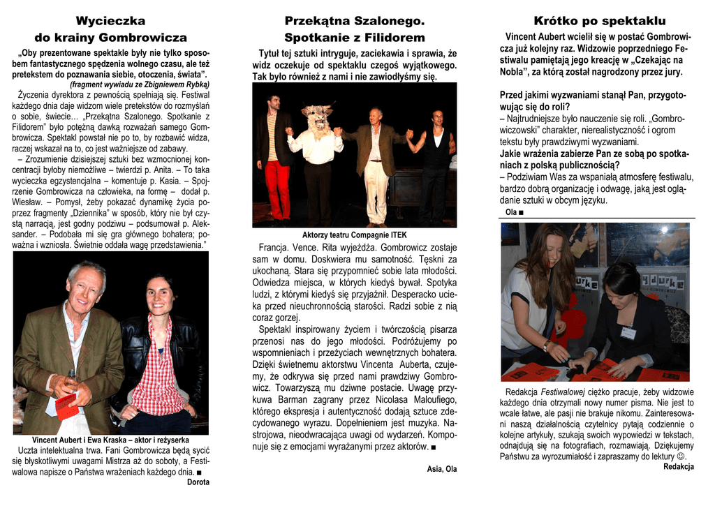 Wycieczka do krainy Gombrowicza Przekątna Szalonego. Spotkanie z Filidorem „Oby prezentowane spektakle były nie tylko sposobem fantastycznego spędzenia wolnego czasu, ale też pretekstem do poznawania siebie, otoczenia, świata”. Tytuł tej sztuki intryguje, zaciekawia i sprawia, że widz oczekuje od spektaklu czegoś wyjątkowego. Tak było również z nami i nie zawiodłyśmy się. (fragment wywiadu ze Zbigniewem Rybką) Życzenia dyrektora z pewnością spełniają się. Festiwal każdego dnia daje widzom wiele pretekstów do rozmyślań o sobie, świecie… „Przekątna Szalonego. Spotkanie z Filidorem” było potężną dawką rozważań samego Gombrowicza. Spektakl powstał nie po to, by rozbawić widza, raczej wskazał na to, co jest ważniejsze od zabawy. – Zrozumienie dzisiejszej sztuki bez wzmocnionej koncentracji byłoby niemożliwe – twierdzi p. Anita. – To taka wycieczka egzystencjalna – komentuje p. Kasia. – Spojrzenie Gombrowicza na człowieka, na formę – dodał p. Wiesław. – Pomysł, żeby pokazać dynamikę życia poprzez fragmenty „Dziennika” w sposób, który nie był czystą narracją, jest godny podziwu – podsumował p. Aleksander. – Podobała mi się gra głównego bohatera; poważna i wzniosła. Świetnie oddała wagę przedstawienia.” Vincent Aubert i Ewa Kraska – aktor i reżyserka Uczta intelektualna trwa. Fani Gombrowicza będą sycić się błyskotliwymi uwagami Mistrza aż do soboty, a Festiwalowa napisze o Państwa wrażeniach każdego dnia. ■ Dorota Krótko po spektaklu Vincent Aubert wcielił się w postać Gombrowicza już kolejny raz. Widzowie poprzedniego Festiwalu pamiętają jego kreację w „Czekając na Nobla”, za którą został nagrodzony przez jury. Przed jakimi wyzwaniami stanął Pan, przygotowując się do roli? – Najtrudniejsze było nauczenie się roli. „Gombrowiczowski” charakter, nierealistyczność i ogrom tekstu były prawdziwymi wyzwaniami. Jakie wrażenia zabierze Pan ze sobą po spotkaniach z polską publicznością? – Podziwiam Was za wspaniałą atmosferę festiwalu, bardzo dobrą organizację i odwagę, jaką jest oglądanie sztuki w obcym języku. Ola ■ Aktorzy teatru Compagnie ITEK Francja. Vence. Rita wyjeżdża. Gombrowicz zostaje sam w domu. Doskwiera mu samotność. Tęskni za ukochaną. Stara się przypomnieć sobie lata młodości. Odwiedza miejsca, w których kiedyś bywał. Spotyka ludzi, z którymi kiedyś się przyjaźnił. Desperacko ucieka przed nieuchronnością starości. Radzi sobie z nią coraz gorzej. Spektakl inspirowany życiem i twórczością pisarza przenosi nas do jego młodości. Podróżujemy po wspomnieniach i przeżyciach wewnętrznych bohatera. Dzięki świetnemu aktorstwu Vincenta Auberta, czujemy, że odkrywa się przed nami prawdziwy Gombrowicz. Towarzyszą mu dziwne postacie. Uwagę przykuwa Barman zagrany przez Nicolasa Maloufiego, którego ekspresja i autentyczność dodają sztuce zdecydowanego wyrazu. Dopełnieniem jest muzyka. Nastrojowa, nieodwracająca uwagi od wydarzeń. Komponuje się z emocjami wyrażanymi przez aktorów. ■ Asia, Ola Redakcja Festiwalowej ciężko pracuje, żeby widzowie każdego dnia otrzymali nowy numer pisma. Nie jest to wcale łatwe, ale pasji nie brakuje nikomu. Zainteresowani naszą działalnością czytelnicy pytają codziennie o kolejne artykuły, szukają swoich wypowiedzi w tekstach, odnajdują się na fotografiach, rozmawiają. Dziękujemy Państwu za wyrozumiałość i zapraszamy do lektury . Redakcja