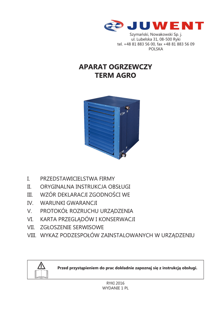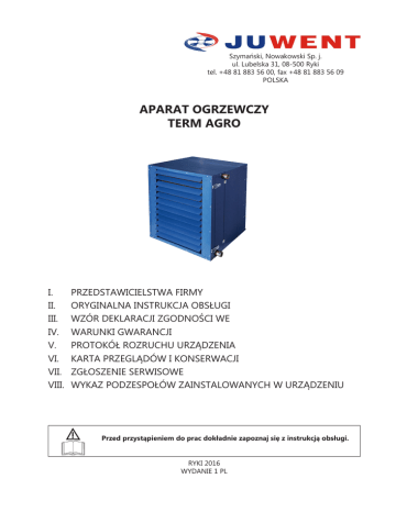 Szymański, Nowakowski Sp. j. ul. Lubelska 31, 08-500 Ryki tel. +48 81 883 56 00, fax +48 81 883 56 09 POLSKA APARAT OGRZEWCZY TERM AGRO I. II. III. IV. V. VI. VII. VIII. PRZEDSTAWICIELSTWA FIRMY ORYGINALNA INSTRUKCJA OBSŁUGI WZÓR DEKLARACJI ZGODNOŚCI WE WARUNKI GWARANCJI PROTOKÓŁ ROZRUCHU URZĄDZENIA KARTA PRZEGLĄDÓW I KONSERWACJI ZGŁOSZENIE SERWISOWE WYKAZ PODZESPOŁÓW ZAINSTALOWANYCH W URZĄDZENIU Przed przystąpieniem do prac dokładnie zapoznaj się z instrukcją obsługi. RYKI 2016 WYDANIE 1 PL I. PRZEDSTAWICIELSTWA FIRMY Białystok GSM +48 692 478 020 e-mail: [email protected] Poznań GSM +48 692 473 053 e-mail: [email protected] Gdańsk GSM +48 692 473 056 e-mail: [email protected] Rzeszów 35-210 Rzeszów, ul. Baczyńskiego 1 Tel. +48 17 853 50 09 Fax +48 17 853 50 09 GSM +48 660 771 537 e-mail: [email protected] Kielce GSM +48 606 618 860 e-mail: [email protected] Kraków 30-207 Kraków ul. Malczewskiego 47A lok.9 Tel. +48 12 655 90 63 Fax +48 12 655 97 50 GSM +48 664 197 142 e-mail: [email protected] Lublin GSM +48 692 476 090 e-mail: [email protected] Łódź 93-486 Łódź, ul. Zamojska 16 Tel. +48 42 682 70 55 Fax +48 42 682 70 56 GSM +48 600 438 028 e-mail: [email protected] Olsztyn GSM +48 606 908 820 e-mail: [email protected] 2 www.juwent.com.pl Szczecin GSM +48 608 539 432 e-mail: [email protected] Śląsk 41-200 Sosnowiec ul. Narutowicza 50 Tel. +48 32 293 54 47 Fax +48 32 293 54 47 GSM +48 604 978 536 e-mail: [email protected] Warszawa GSM +48 600 998 676 GSM +48 602 195 709 e-mail: [email protected] Wrocław 50-542 Wrocław ul. Żegiestowska 11 Tel. +48 71 787 21 60 Fax +48 71 787 21 61 GSM +48 601 974 999 GSM +48 601 671 566 e-mail: [email protected] II. ORYGINALNA INSTRUKCJA OBSŁUGI APARAT OGRZEWCZY TERM AGRO www.juwent.com.pl 3 1. PRZEZNACZENIE 4 SPIS TREŚCI 5 2. OZNACZENIA 5 3. OPIS URZĄDZENIA 5 4. DANE TECHNICZNE 6 5. TRANSPORT 8 6. ZALECENIA BEZPIECZEŃSTWA 8 7. MONTAŻ 9 8. INSTALACJA WODNA 10 9. INSTALACJA ELEKTRYCZNA 10 10. AUTOMATYKA 12 11. URUCHOMIENIE URZĄDZENIA 15 12. NAPRAWA, KONSERWACJA I WYCOFANIE Z EKSPLOATACJI 16 13. USUWANIE NIESPRAWNOŚCI 17 14. INFORMACJE 17 www.juwent.com.pl 1. PRZEZNACZENIE Aparaty ogrzewcze TERM AGRO przeznaczone są do stosowania w obiektach rolniczych oraz w obiektach gdzie powietrze jest o wysokiej wilgotności i o dużym zapyleniu. Aparaty przeznaczone są do stosowania w kurnikach, oborach, stajniach, chlewniach itp. Korzystne jest także ich zastosowanie w pomieszczeniach, w których aparaty są szczególnie narażone na korozję. Aparaty należy użytkować tylko zgodnie z przeznaczeniem. Za użytkowanie aparatów niezgodnie z przeznaczeniem i za szkody powstałe z tego powodu producent nie ponosi odpowiedzialności. Aparaty TERM 1; 2; 3 i 4 nie mogą być stosowane w pomieszczeniach o wilgotności względnej większej niż 95% i zapyleniu powietrza powyżej 3mg/m3. Pomieszczenia mogą być obsługiwane przez jeden lub większą ilość aparatów. 2. OZNACZENIA Aparat ogrzewczy TERM-AGRO 3. OPIS URZĄDZENIA W skład aparatu wchodzą: »» wentylator osiowy typu agro. »» nagrzewnica wodna. Nagrzewnica wodna lamelowa wykonana jest z rurek miedzianych o średnicy zewnętrznej D=12mm i lamel epoksydowanych o rozstawieniu s=3mm oraz ramy z blachy kwasoodpornej. Dla nagrzewnic wodnych lamelowych max temperatura czynnika grzewczego wynosi do 150OC i max ciśnienie pracy do 1,5Mpa. Istnieje niebezpieczeństwo zamarznięcia czynnika grzewczego w nagrzewnicy w pomieszczeniach o temperaturze poniżej 0OC. Zagrożenie można ograniczyć przez zastosowanie termostatu przeciwzamrożeniowego (dostarczanego na życzenie), zastosowanie niezamarzających czynników grzewczych lub spuszczenie wody z aparatu. »» obudowa wykonana z blachy stalowej ocynkowanej, malowanej proszkowo z zewnątrz i wewnątrz (proszek epoksydowy) wyposażona jest w kratkę wylotową jednorzędową umożliwiającą ustawienie kierunku nawiewanego powietrza. Konstrukcja łopat kratki zabezpiecza przed samoczynnym przestawianiem łopat. Obudowa może być wykonana z blachy nierdzewnej. Konstrukcja obudowy umożliwia łatwe czyszczenie wnętrza aparatu (na zawiasach oddzielnie kratka wylotowa, nagrzewnica i wentylator z filtrem). »» filtra w postaci siatki o oczkach uniemożliwiających dostanie się cząstek stałych do wnętrza aparatu. Aparaty mogą być dostarczone z 5-cio biegowym regulatorem prędkości obrotowej wentylatorów (praca aparatu przewidywana jest na V; IV; III i II biegu regulatora). www.juwent.com.pl 5 4. DANE TECHNICZNE Masa oraz parametry wentylatora Typ aparatu TERM AGRO Masa [kg] 53 Parametry wentylatorów w aparatach Napięcie [V] 230 Moc silnika [kW] 0,38 Prąd [A] 1,9 Obroty [min-1] 1365 IP 54 Klasa izolacji F Temperatura pracy [OC] do +60 Głośność pracy oraz zasięgi izotermicznych strumieni powietrza na poszczególnych biegach regulatora obrotów wentylatora Typ aparatu Bieg regulatora TERM AGRO V IV III II Głośność pracy [dB(A)] Z odległości 1m 67 63 55 49 Z odległości 3m 62 58 50 44 Zasięgi nawiewanego powietrza [m] przy Vk=0.5 m/s 27 24 18 14 Głośność pracy - poziom ciśnienia akustycznego z uwzględnieniem współczynnika kierunkowego Q=2 i zdolności pochłaniania pomieszczenia A=100 m2. 6 www.juwent.com.pl Moce cieplne aparatu na V; IV; III i II biegu regulatora obrotów wentylatora Typ aparatu TERM AGRO Pojemność wodna [dm3] Bieg regulatora V Wydatek powietrza [m3/h] Parametry wody [OC] 90/70 80/60 70/50 60/40 5800 Temp. powietrza napływ. [OC] kW C kPa 36 6,4 O 58,2 33 15 48,7 39 5 10 15 5 10 15 5 10 15 53,4 49,1 44,5 39,9 40,2 35,8 31,3 31,6 27,3 23,0 III 5100 II 3900 3000 Moc cieplna [kW], temperatura powietrza wypływającego [oC] oraz opory przepływu wody [kPa] 5 10 3,2 IV 29 kW 45,2 41 45,7 41,4 37,1 3,6 27 37,4 2,9 31 33,3 2,2 20 29,2 2,2 23 29,5 1,7 26 5,5 5,3 49,6 3,6 24 38 35 4,4 35 kPa 54,1 5,4 32 C O 7,6 25,4 1,2 21,5 30 33 36 26 28 32 21 24 27 kW C kPa 41 4,1 O 6,6 46,5 38 4,6 38,