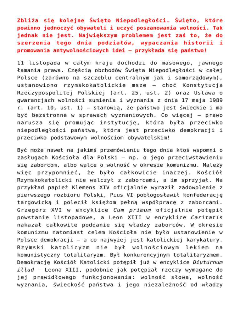 Zbliża się kolejne Święto Niepodległości. Święto, które powinno jednoczyć obywateli i uczyć poszanowania wolności. Tak jednak nie jest. Największym problemem jest zaś to, że do szerzenia tego dnia podziałów, wypaczania historii i promowania antywolnościowych idei – przykłada się państwo! 11 listopada w całym kraju dochodzi do masowego, jawnego łamania prawa. Częścią obchodów Święta Niepodległości w całej Polsce (zarówno na szczeblu centralnym jak i samorządowym), ustanowiono rzymskokatolickie msze – choć Konstytucja Rzeczypospolitej Polskiej (art. 25, ust. 2) oraz Ustawa o gwarancjach wolności sumienia i wyznania z dnia 17 maja 1989 r. (art. 10, ust. 1) – stanowią, że państwo jest świeckie i ma być bezstronne w sprawach wyznaniowych. Co więcej – prawo narusza się promując instytucję, która była przeciwko niepodległości państwa, która jest przeciwko demokracji i przeciwko podstawowym wolnościom obywatelskim! Być może nawet na jakimś przemówieniu tego dnia ktoś wspomni o zasługach Kościoła dla Polski – np. o jego przeciwstawieniu się zaborcom, albo walce o wolność w okresie komunizmu. Należy więc przypomnieć, że było całkowicie inaczej. Kościół Rzymskokatolicki nie walczył z zaborcami, a im sprzyjał. Na przykład papież Klemens XIV oficjalnie wyraził zadowolenie z pierwszego rozbioru Polski, Pius VI pobłogosławił konfederację targowicką i polecił księżom pełną współpracę z zaborcami. Grzegorz XVI w encyklice Cum primum oficjalnie potępił powstanie listopadowe, a Leon XIII w encyklice Caritatis nakazał całkowite poddanie się władzy zaborców. W okresie komunizmu natomiast celem Kościoła nie było ustanowienie w Polsce demokracji – a co najwyżej jest katolickiej karykatury. Rzymski katolicyzm nie był wolnościowym lekiem na komunistyczny totalitaryzm. Był konkurencyjnym totalitaryzmem. Demokrację Kościół Katolicki potępił już w encyklice Diuturnum illud – Leona XIII, podobnie jak potępiał rzeczy wymagane do jej prawidłowego funkcjonowania: wolność słowa, wolność wyznania, świeckość państwa i jego niezależność od władzy kościelnej (np. encykliki Mirari Vos – Grzegorza XVI, Libertas – Leona XIII, Quanta cura – Piusa IX). Mówienie wiec o zasługach Kościoła w odzyskaniu niepodległości i w umacnianiu demokracji – jest szerzeniem kłamstwa. Całkowitym wypaczeniem rzeczywistości i robieniem z wroga – bohatera. Część polityków promująca Kościół Katolicki podczas obchodów Święta Niepodległości, robi to zapewne z przekonania, wyznając katolickie idee. Część jednak – raczej ta większa – robi to z cynicznej chęci przypodobania się ludziom, którzy uważają siebie za katolików. Według propagandy katolickiej bowiem, wyznawanie katolicyzmu jest niezbędne do bycia prawdziwym „Polakiem”, „patriotą” i „dobrym człowiekiem”. Problem w tym, że robiąc z państwowych obchodów, obchody katolickie – politycy ci nie tylko działają na rzecz swojego wizerunku, ale i powielają przekaz tejże propagandy. Wspierają tym samym poglądy pomawiające i obrażające wielu porządnych obywateli, którzy nie wyznają katolicyzmu – a z których pomaga się Kościołowi robić ludzi złych, szkodzących społeczeństwu, wrogów Polski – dla których nie ma miejsca we wspólnocie narodowej (z tego względu – jako, że wedle katolickiej retoryki członkami narodu polskiego są tylko katolicy – słowo „narodowe” w nazwie święta też dystrybuuje negatywne sugestie). Tym samym podczas państwowych obchodów promowane są nie poglądy, które będą jednoczyć obywateli w duchu przyjaźni, ale takie, które dzielą społeczeństwo w nastroju nienawiści i uprzedzeń. W Warszawie tego dnia środowiska katolickie pójdą w Marszu Niepodległości. Nazwa absurdalna jak dla marsz promujący katolickie poglądy – według których państwo musi podlegać Kościołowi (Watykanowi). Zapewne i tym razem dojdzie do ulicznych zamieszek, aktów wandalizmu oraz podobnych nadużyć. Środowiska te bronią się, że działania takie nie mają nic wspólnego z organizowaną przez nie manifestacją, a zostały zainscenizowane przez np. policyjnych agentów na usługach rządu. Są to jednak wymówki bardzo naiwne – nie tylko ze względu na brak dowodów na tego rodzaju „spiski”, ale ze względu na to, że katolicka propaganda nieustannie podżega do nienawiści i pochwala naruszanie praw obywateli. Dla przykładu, odnośnie samego tylko Święta Niepodległości – Katolickie Stowarzyszenie Dziennikarzy za najlepszą „patriotyczną fotografię” roku uznało zdjęcie z 11 listopada, przedstawiające mężczyznę z polską flagą, na tle podpalonej warszawskiej „tęczy”. Za podobne nawoływanie do nienawiści związane z obchodami tego święta, Krajowa Rada Radiofonii i Telewizji – ukarała telewizję Trwam. Kto podżega – jest odpowiedzialny za skutki tego podżegania. Prezydent, prezydenci miast, burmistrzowie, posłowie czy członkowie rad miejskich – w dużej mierze zapewne potępiliby demolowanie Warszawy tego dnia. Nie znaczy to jednak, że nie są za to częściowo odpowiedzialni. Wspomniana wcześniej większość z nich, która nasyca państwo – w tym Święto Niepodległości – elementami katolickimi, promuje tym samym idee głoszone przez Kościół (i związane z nim media): wspiera go w robieniu z katolicyzmu normy społecznej i wyznacznika patriotyzmu; uwiarygodnia katolickie oszczerstwa i przekłamywanie historii; legitymizuje agresję wobec osób o odmiennym wyznaniu, politycznych. orientacji seksualnej, poglądach Tak wiec wszyscy politycy, którzy ze Święta Niepodległości robią chociaż w niewielkim stopniu święto katolickie, są po części odpowiedzialni za akty przemocy i wandalizmu popełnianie tego dnia pod hasłem „patriotyzmu”. Są po części odpowiedzialni za wypaczanie his