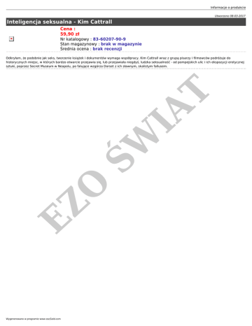 Informacje o produkcie Utworzono 08-03-2017 Inteligencja seksualna - Kim Cattrall Cena : 59,90 zł Nr katalogowy : 83-60207-90-9 Stan magazynowy : brak w magazynie Średnia ocena : brak recenzji EZ O ŚW IA T Odkryłam, że podobnie jak seks, tworzenie książek i dokumentów wymaga współpracy. Kim Cattrall wraz z grupą pisarzy i filmowców podróżuje do historycznych miejsc, w których bardzo otwarcie przejawia się, lub przejawiała niegdyś, ludzka seksualność - od pompejskich ulic i ich ekspozycji erotycznej sztuki, poprzez Secret Museum w Neapolu, po falujące wzgórza Dorset z ich sławnym, skalistym fallusem. Wygenerowano w programie www.oscGold.com