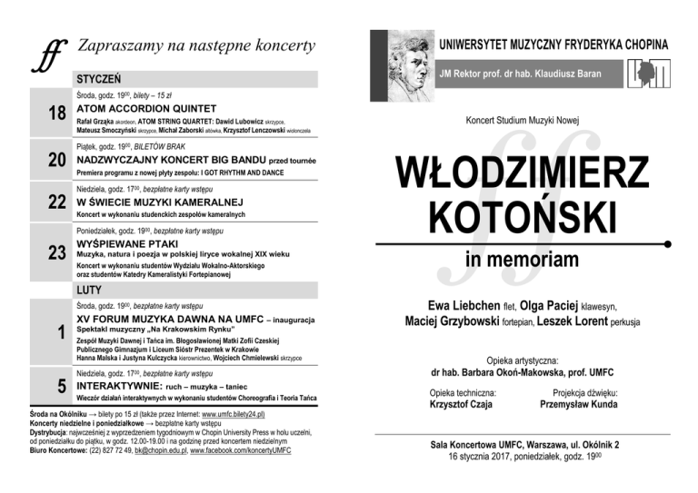 ff Zapraszamy na następne koncerty UNIWERSYTET MUZYCZNY FRYDERYKA CHOPINA STYCZEŃ JM Rektor prof. dr hab. Klaudiusz Baran Ł ATOM ACCORDION QUINTET u Rafał Grząka ATOM STRING QUARTET: Dawid Lubowicz Mateusz Smoczyński MichałkZaborski Krzysztof Lenczowski a Piątek, godz. 19 , BILETÓW BRAK NADZWYCZAJNY KONCERT BIG BANDU przed tournée s Premiera programu z nowej płyty zespołu: I GOT RHYTHM AND DANCE z Środa, godz. 1900, bilety – 15 zł 18 akordeon, skrzypce, skrzypce, 20 22 altówka, wiolonczela 00 Niedziela, godz. 1700, bezpłatne karty wstępu W ŚWIECIE MUZYKI KAMERALNEJ C Poniedziałek, godz. 19 , bezpłatne h karty wstępu WYŚPIEWANE PTAKIr Muzyka, natura i poezja w polskiej liryce wokalnej XIX wieku Koncert w wykonaniu studentów Wydziału z Wokalno-Aktorskiego oraz studentów Katedry Kameralistyki Fortepianowej ę LUTY s Środa, godz. 19 , bezpłatne karty wstępu XV FORUM MUZYKAzDAWNA NA UMFC – inauguracja Spektakl muzyczny „Na Krakowskim Rynku” c Zespół Muzyki Dawnej i Tańca im. Błogosławionej Matki Zofii Czeskiej Publicznego Gimnazjum i Liceum z Sióstr Prezentek w Krakowie Hanna Malska i Justyna Kulczycka kierownictwo, Wojciech Chmielewski skrzypce y Niedziela, godz. 17 , bezpłatne karty wstępu k – muzyka – taniec INTERAKTYWNIE: ruch Koncert w wykonaniu studenckich zespołów kameralnych 00 23 00 1 5 Pianista, 00 Wieczór działań interaktywnych w wykonaniu studentów Choreografia i Teoria Tańca Środa na Okólniku → bilety po 15 zł (także przez Internet: www.umfc.bilety24.pl) urodzony Koncerty niedzielne i poniedziałkowe → bezpłatne karty wstępu się w Dystrybucja: 1990 roku najwcześniej z wyprzedzeniem tygodniowym w Chopin University Press w holu uczelni, od poniedziałku do piątku, w godz. 12.00-19.00 i na godzinę przed koncertem niedzielnym w KielBiuro Koncertowe: (22) 827 72 49, [email protected], www.facebook.com/koncertyUMFC cach. Tam w wieku 6 lat rozpo- ff Koncert Studium Muzyki Nowej WŁODZIMIERZ KOTOŃSKI in memoriam Ewa Liebchen flet, Olga Paciej klawesyn, Maciej Grzybowski fortepian, Leszek Lorent perkusja Opieka artystyczna: dr hab. Barbara Okoń-Makowska, prof. UMFC Opieka techniczna: Krzysztof Czaja Projekcja dźwięku: Przemysław Kunda Sala Koncertowa UMFC, Warszawa, ul. Okólnik 2 16 stycznia 2017, poniedziałek, godz. 1900 Program WŁODZIMIERZ KOTOŃSKI WŁODZIMIERZ KOTOŃSKI (1925–2014) (1925–2014) Tierra caliente na taśmę (1992) realizacja – Ewa Guziołek-Tubelewicz; Studio Eksperymentalne Polskiego Radia Partita na organy lub klawesyn (2008–2009, prawykonanie światowe) I. II. III. IV. Andante lento Allegro Tranquillo Fuga. Allegro OLGA PACIEJ klawesyn Bucolica (Morton Feldman in memoriam) na flet (1989) 1. 2. 3. 4. Spiritus Promptus Caro infirma Inscriptio Surdis auribus EWA LIEBCHEN flet Przerwa Trzy etiudy rytmiczne na fortepian (1990) 1. 2. 3. Etiuda polimetryczna Studium polirytmiczne Etiuda w wieloczasie MACIEJ GRZYBOWSKI fortepian Tlaloc na klawesyn i perkusję (1986) realizacja nagrania projekcja dźwięku prelegenci Magdalena Paluch Paulina Wyszkowska dr hab. Barbara Okoń-Makowska, prof. UMFC dr hab. Barbara Okoń-Makowska, prof. UMFC opieka dydaktyczna Przemysław Kunda ad. dr hab. Edward Sielicki prof. Witold Osiński ad. dr hab. Leszek Lorent OLGA PACIEJ klawesyn LESZEK LORENT perkusja Arietta e fiori na puzon i dźwięki elektroniczne (2014) partia puzonu – Michał Mazurkiewicz nagranie prawykonania – Beata Jankowska (V Festiwal Prawykonań w Katowicach, 2013) realizacja partii taśmy – Barbara Okoń-Makowska, współpraca – Andrzej Kopeć