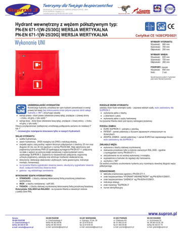 PRODUKCJA, DYSTRYBUCJA i SERWIS SPRZĘTU PPOŻ. i BHP PPUH SUPRON 3 Spółka z o.o. Certyfikat jakości wg PN-EN ISO 9001:2009 ZARZĄDZANIA SYSTEM Tworzymy dla Twojego bezpieczeństwa Certyfikowany na zgodność z: PN-EN ISO 9001:2009 Hydrant wewnętrzny z wężem półsztywnym typ: PN-EN 671-1[W-25/30G] WERSJA WERTYKALNA PN-EN 671-1[W-25/20G] WERSJA WERTYKALNA Certyfikat CE 1438/CPD/0021 Wykonanie UNI WYMIARY HYDRANTU: Wysokość: 800 mm Szerokość: 700 mm Głębokość: 250 mm WYMIARY WNĘKI: Wysokość: 820 mm Szerokość: 720 mm Głębokość: 260 mm PODPORY: (opcja) Wysokość: 650 mm Ilość: 2 szt. Sposób łączenia podpór z hydrantem patrz karta “Montaż hydrantów” UNIWERSALNOŚĆ HYDRANTÓW: Konstrukcja hydrantu umożliwia ten sam hydrant zamontować w wersji prawej lub lewej (bez dokonywania zmian jedynie poprzez obrót całego hydrantu o 180°) utrzymując zasadę: · wersja prawa - drzwi prawe (otwierane prawą ręką), przyłącze: z prawej strony - z boku, od góry, z tyłu szafy * · wersja lewa - drzwi lewe (otwierane lewą ręką), przyłącze: z lewej strony - z boku, od góry, z tyłu szafy * Otwory przyłączeniowe (zaślepione) umożliwiają podłączenie zarówno do instalacji 2” lub 1” * - innowacyjne rozwiązanie stosowane tylko w naszych hydrantach SKŁAD HYDRANTU: · szafka hydrantowa, · zawór hydrantowy: ZH25 mosiężny lub ZH52 z redukcją skośną, · zwijadło węża z osią wodną i wężem tłocznym półsztywnym o średnicy 25 mm oraz długości 20 mb, lub 30 mb zgodnym z normą PN-EN 694. Wąż zakończony jest prądownicą hydrantową PWh-25 spełniającą wymagania PN-EN 671-1 połączoną na stałe z wężem za pomocą tulejki zaciskowej z wykorzystaniem wzoru użytkowego SUPRON 3. Zapewnia to niezawodność połączenia, ergonomię uchwytu prądownicy, estetykę oraz eliminuje możliwość skaleczenia się, · dokumenty: deklaracja właściwości użytkowych, karta gwarancyjna, instrukcje: montażu, konserwacji, · na życzenie Klienta sygnalizator otwarcia zaworu, akustyczny sygnalizator otwarcia drzwi, wyłącznik krańcowy otwarcia drzwi · gaśnica - wg oddzielnego zamówienia WYKONANIE SZAFKI HYDRANTOWEJ: · STANDARD - z blachy stalowej lakierowanej farbą proszkową poliestrowoepoksydową · INOX - z blachy nierdzewnej - szlif 240, · FASADA - z blachy stalowej ocynkowanej lakierowanej farbą proszkową fasadową Kolorystyka: RAL3000 lub RAL9003 - na życzenie Klienta w dowolnym kolorze z palety barw RAL RODZAJE DRZWI HYDRANTU: zawiasy drzwi kryte wewnątrz szafy – poprawa estetyki szafy, wzór zastrzeżony dla SUPRON 3 · wykonanie pełne z blachy, · z okienkiem z plexi, · wykonanie pełne z szyby hartowanej na życzenie Klienta otwór pod ręczny ostrzegacz pożarowy RODZAJ ZAMKA: · EURO SUPRON 3 - pokrętny z plombą, · PATENT - zamek patentowy z kluczem zapasowym umieszczonym na drzwiczkach, · ZESPÓŁ ZAMKA - zamek patentowy + zamek EURO bez zapasowego klucza wzór zastrzeżony dla SUPRON 3 ZWIJADŁO WĘŻA: · wykonane z blachy stalowej ocynkowanej, · malowane proszkowo tylko w kolorze czerwonym RAL 3000 - zgodnie z wymaganiem normy PN-EN 671-1, · ułożyskowane na osi wodnej wykonanej z mosiądzu, · wyposażone w hamulec do regulacji siły hamowania, · wychylne o 180° Oś wodna umożliwia uruchomienie hydrantu przy rozwinięciu dowolnej długości węża półsztywnego. OZNAKOWANIE: · tabliczka znamionowa zgodnie z PN-EN 671-1, · znak bezpieczeństwa "HYDRANT WEWNĘTRZNY" wg PN-92/N-01256/01, · znak bezpieczeństwa “GAŚNICA” wg PN-92/N-01256/01, · instrukcja obsługi, · znak towarowy "SUPRON 3" · numer identyfikacyjny www.supron.pl Serwis: 26-600 RADOM ul. Czachowskiego 4 tel/fax 48 340 01 65 e-mail: [email protected] 26-600 RADOM ul. Czachowskiego 4 tel/fax 48 363 89 98 tel/fax 48 363 99 65 e-mail: [email protected] 03-481 WARSZAWA ul. Szanajcy 16 lok. 56 tel. 22 618 93 63 fax 22 619 80 05 e-mail: [email protected] 61-003 POZNAŃ ul. Chlebowa 4/8 tel. 61 842 23 00 fax 61 840 06 88 e-mail: [email protected] 80-530 GDAŃSK ul. Uczniowska 52 tel. 58 340 03 55, 56 tel/fax 58 342 91 75 e-mail: [email protected] WŁAŚCIWOŚCI HYDRAULICZNE Ciśnienie robocze: od 0,2 MPa do 1,2 MPa Prąd wody rozproszony stożkowy - nie mniejszy niż 45 stopni. UWAGA: Zależność natężenia przepływu Q od ciśnienia P przedstawia równanie: Q=K 10P, gdzie Q wyraża się w litrach/minutę,a P w megapaskalach. PRZYKŁADY WYKONANIA SZAFEK STANDARD INOX FRONT INOX FASADA szafka przykładowa - kolor RAL 3000 szafka przykładowa - szlif 240 szafka przykładowa - szlif 240 szafka przykładowa - kolor RAL 9006 RODZAJ ZAMKA EURO PATENT ZESPÓŁ ZAMKA