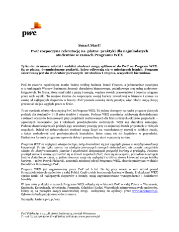 Smart Start! PwC rozpoczyna rekrutację na płatne praktyki dla najmłodszych studentów w ramach Programu WEX Tylko do 10 marca młodzi i ambitni studenci mogą aplikować do PwC na Program WEX. Są to płatne, dwumiesięczne praktyki, które odbywają się w miesiącach letnich. Program skierowany jest do studentów pierwszych lat studiów I stopnia, wszystkich kierunków. PwC to czwarta najsilniejsza marka świata według badania Brand Finance, a jednocześnie zwycięzca w 3 rankingach Warsaw Busiuness Journal: doradztwa biznesowego, podatkowego oraz usług audytowoksięgowych. To firma, która ceni ludzi z pasją i energią, wspiera swoich pracowników i docenia osiągane przez nich wyniki. To miejsce idealne do rozpoczęcie swojej kariery zawodowej w biznesie i szansa na naukę od najlepszych ekspertów w branży. PwC posiada szeroką ofertę praktyk, więc młodzi mają okazję przekonać się jak wygląda praca w firnie. To co wyróżnia ofertę rekrutacyjną PwC to Program WEX. To jedyny dostępny na rynku program płatnych praktyk dla studentów I i II roku studiów I stopnia. Podczas WEX uczestnicy zdobywają doświadczenie z różnych obszarów biznesowych przy projektach realizowanych dla firm z różnych sektorów gospodarki – ogromnych koncernów, jak i lokalnych przedsiębiorstw rodzinnych. WEX ma charakter rotacyjny. Podczas dwumiesięcznych praktyk jego uczestnicy pracują przy co najmniej dwóch projektach w różnych zespołach. Dzięki tej różnorodności studenci mogą liczyć na wszechstronny rozwój w krótkim czasie, a także rozbudować sieć profesjonalnych kontaktów, które staną się ich kapitałem w przyszłości. Unikatowa formuła programu zapewnia dobry i przemyślany start w przyszłą karierę. Program WEX to najlepsza okazja do tego, żeby dowiedzieć się jak wygląda praca w międzynarodowej korporacji. To nie tylko szansa na zdobycie pierwszych cennych doświadczeń, ale przede wszystkich okazja do skonfrontowania planów i wyobrażeń dotyczących przyszłej kariery z praktyką. Podczas praktyk miałem szansę sprawdzić się w trzech zespołach PwC, dużo się nauczyłem, poznałem świetnych ludzi a dodatkowo wiem, w jakim obszarze czuję się najlepiej i w którą stronę kierować swoją ścieżkę kariery. – mówi Patryk Piekarski, uczestnik minionej edycji Programu WEX, obecnie praktykant w dziale Doradztwa Biznesowego PwC. Program WEX jest organizowany przez PwC od 6 lat. Do tej pory wzięło w nim udział ponad 80 najzdolniejszych studentów z całej Polski. Część z nich kontynuuje karierę w firmie. Praktykanci WEX oprócz nauki od najlepszych ekspertów z branży, mają zagwarantowane wynagrodzenie i dodatkowe benefity. W tym roku praktyki w ramach Programu WEX odbędą się w biurach PwC w całej Polsce – Warszawie, Krakowie, Katowicach, Wrocławiu, Poznaniu, Gdańsku i Łodzi. Wszystkich zainteresowanych studentów, którzy są na początku swojej akademickiej drogi, zachęcamy do aplikacji przez www.karierapwc.pl. Zgłoszenia będą przyjmowane do 10 marca. Szczegóły: kariera.pwc.pl/wex PwC Polska Sp. z o.o., Al. Armii Ludowej 14, 00-638 Warszawa T: +48 (0) 22 746 4000, F:+48 (0) 22 508 4040, www.pwc.com/pl