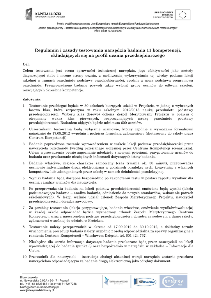 Projekt współfinansowany przez Unię Europejską w ramach Europejskiego Funduszu Społecznego „Jestem przedsiębiorczy – kształtowanie postaw przedsiębiorczych wśród młodzieży z wykorzystaniem innowacyjnych metod i narzędzi” POKL.09.01.02-30-362/10 Regulamin i zasady testowania narzędzia badania 11 kompetencji, składających się na profil ucznia przedsiębiorczego Cel: Celem testowania jest ocena sprawności technicznej narzędzia, jego efektywności jako metody diagnozującej słabe i mocne strony ucznia, z możliwością wykorzystania tej wiedzy podczas lekcji szkolnej w ramach przedmiotu podstawy przedsiębiorczości, zgodnie z nową podstawą programową przedmiotu. Przeprowadzone badanie pozwoli także wyłonić grupy uczniów do odbycia szkoleń, rozwijających określone kompetencje. Założenia: 1. Testowanie przebiegać będzie w 30 szkołach biorących udział w Projekcie, w jednej z wybranych losowo klas, która rozpoczyna w roku szkolnym 2012/2013 naukę przedmiotu podstawy przedsiębiorczości. Wyboru klas (losowo) dokona Zespół Merytoryczny Projektu w oparciu o otrzymany wykaz klas pierwszych, rozpoczynających naukę przedmiotu podstawy przedsiębiorczości. Badaniem objętych będzie minimum 600 uczniów. 2. Uczestnikami testowania będą wyłącznie uczniowie, którzy zgodnie z wymogami formalnymi najpóźniej do 17.09.2012 wypełnią i podpiszą formularz zgłoszeniowy (dostarczony do szkoły przez Centrum Kompetencji). 3. Badanie poprzedzone zostanie wprowadzeniem w trakcie lekcji podstaw przedsiębiorczości przez nauczyciela przedmiotu (według przesłanego wcześniej przez Centrum Kompetencji scenariusza). Celem wprowadzenia będzie zapoznanie młodzieży z nowymi pojęciami, przygotowanie uczniów do badania oraz przekazanie niezbędnych informacji dotyczących istoty badania. 4. Badanie właściwe, mające charakter samooceny (czas trwania ok. 30 minut), przeprowadzą uczniowie indywidualnie drogą elektroniczną w godzinach pozalekcyjnych, korzystając z własnych komputerów lub udostępnionych przez szkołę w ramach działalności pozalekcyjnej. 5. Wyniki badania będą dostępne bezpośrednio po zakończeniu testu w postaci raportu wyników dla ucznia i analizy wyników dla nauczyciela. 6. Po przeprowadzeniu badania na lekcji podstaw przedsiębiorczości omówione będą wyniki (lekcja podsumowująca badanie – analiza badania, odniesienie do nowych standardów, wskazanie potrzeb szkoleniowych). W lekcji weźmie udział członek Zespołu Merytorycznego Projektu, nauczyciel przedsiębiorczości i doradca zawodowy. 7. Za przebieg testowania (lekcja przygotowująca, badanie właściwe, omówienie wyników/ewaluacja) w każdej szkole odpowiadać będzie wyznaczony członek Zespołu Merytorycznego Centrum Kompetencji wraz z nauczycielem podstaw przedsiębiorczości i doradcą zawodowym z danej szkoły, zgłoszonymi wcześniej do udziału w Projekcie. 8. Testowanie należy przeprowadzić w okresie od 17.09.2012 do 30.10.2012, a dokładny termin uruchomienia procedury badania należy uzgodnić z osobą odpowiedzialną za sprawy organizacyjne z ramienia Centrum Kompetencji – Wiesławem Dzięcioł, tel. 601 424 767. 9. Niezbędne dla ucznia informacje dotyczące badania przekazane będą przez nauczycieli na lekcji wprowadzającej do badania (punkt 3) oraz bezpośrednio w narzędziu w zakładce – Informacje dla Ciebie. 10. Przewodnik dla nauczycieli – instrukcja obsługi aktualnej wersji narzędzia zostanie przesłana nauczycielom odpowiadającym za badanie drogą elektroniczną jako odrębny dokument. Biuro projektu ul. Nowosolska 21/3A › 60-171 Poznań tel. (+48) 61 8626485 › fax (+48) 61 6247286 [email protected] www.jestemprzedsiebiorczy.pl