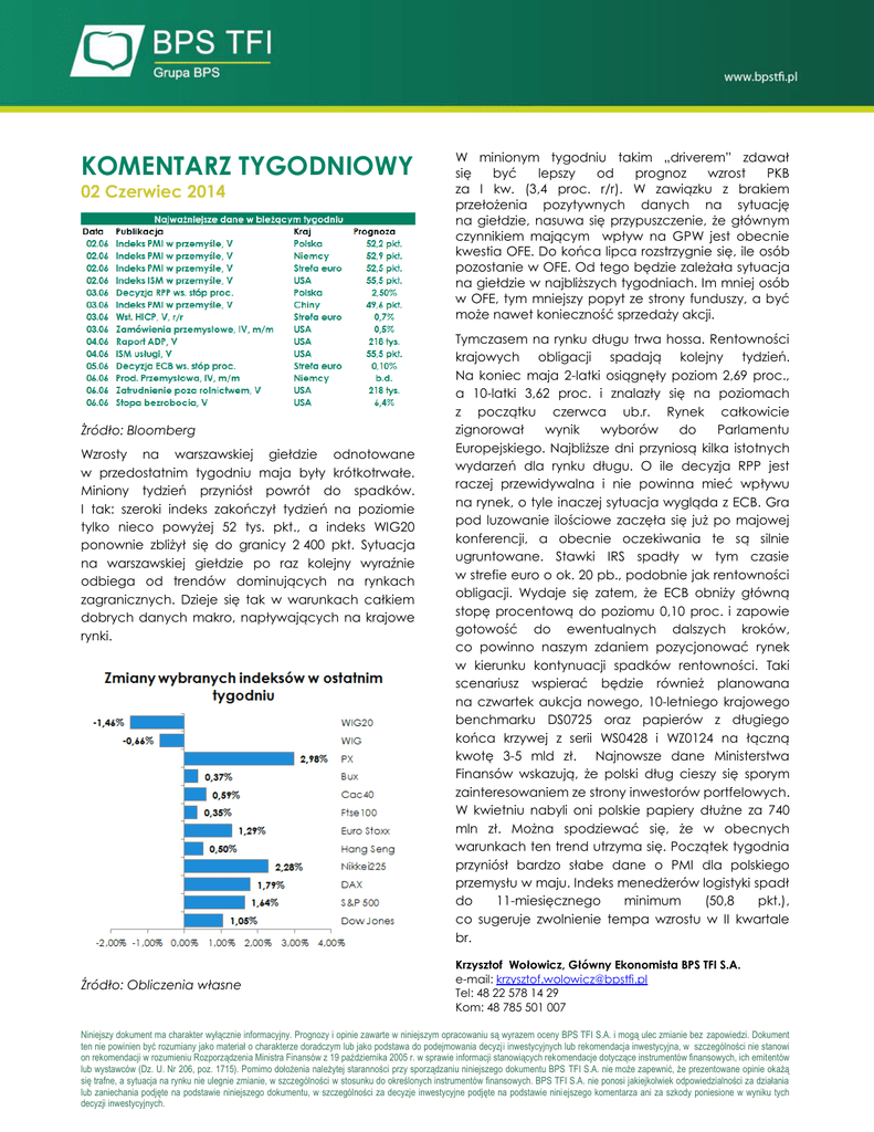 KOMENTARZ TYGODNIOWY 02 Czerwiec 2014 Żródło: Bloomberg Wzrosty na warszawskiej giełdzie odnotowane w przedostatnim tygodniu maja były krótkotrwałe. Miniony tydzień przyniósł powrót do spadków. I tak: szeroki indeks zakończył tydzień na poziomie tylko nieco powyżej 52 tys. pkt., a indeks WIG20 ponownie zbliżył się do granicy 2 400 pkt. Sytuacja na warszawskiej giełdzie po raz kolejny wyraźnie odbiega od trendów dominujących na rynkach zagranicznych. Dzieje się tak w warunkach całkiem dobrych danych makro, napływających na krajowe rynki. Źródło: Obliczenia własne W minionym tygodniu takim „driverem” zdawał się być lepszy od prognoz wzrost PKB za I kw. (3,4 proc. r/r). W zawiązku z brakiem przełożenia pozytywnych danych na sytuację na giełdzie, nasuwa się przypuszczenie, że głównym czynnikiem mającym wpływ na GPW jest obecnie kwestia OFE. Do końca lipca rozstrzygnie się, ile osób pozostanie w OFE. Od tego będzie zależała sytuacja na giełdzie w najbliższych tygodniach. Im mniej osób w OFE, tym mniejszy popyt ze strony funduszy, a być może nawet konieczność sprzedaży akcji. Tymczasem na rynku długu trwa hossa. Rentowności krajowych obligacji spadają kolejny tydzień. Na koniec maja 2-latki osiągnęły poziom 2,69 proc., a 10-latki 3,62 proc. i znalazły się na poziomach z początku czerwca ub.r. Rynek całkowicie zignorował wynik wyborów do Parlamentu Europejskiego. Najbliższe dni przyniosą kilka istotnych wydarzeń dla rynku długu. O ile decyzja RPP jest raczej przewidywalna i nie powinna mieć wpływu na rynek, o tyle inaczej sytuacja wygląda z ECB. Gra pod luzowanie ilościowe zaczęła się już po majowej konferencji, a obecnie oczekiwania te są silnie ugruntowane. Stawki IRS spadły w tym czasie w strefie euro o ok. 20 pb., podobnie jak rentowności obligacji. Wydaje się zatem, że ECB obniży główną stopę procentową do poziomu 0,10 proc. i zapowie gotowość do ewentualnych dalszych kroków, co powinno naszym zdaniem pozycjonować rynek w kierunku kontynuacji spadków rentowności. Taki scenariusz wspierać będzie również planowana na czwartek aukcja nowego, 10-letniego krajowego benchmarku DS0725 oraz papierów z długiego końca krzywej z serii WS0428 i WZ0124 na łączną kwotę 3-5 mld zł. Najnowsze dane Ministerstwa Finansów wskazują, że polski dług cieszy się sporym zainteresowaniem ze strony inwestorów portfelowych. W kwietniu nabyli oni polskie papiery dłużne za 740 mln zł. Można spodziewać się, że w obecnych warunkach ten trend utrzyma się. Początek tygodnia przyniósł bardzo słabe dane o PMI dla polskiego przemysłu w maju. Indeks menedżerów logistyki spadł do 11-miesięcznego minimum (50,8 pkt.), co sugeruje zwolnienie tempa wzrostu w II kwartale br. Krzysztof Wołowicz, Główny Ekonomista BPS TFI S.A. e-mail: [email protected] Tel: 48 22 578 14 29 Kom: 48 785 501 007 Niniejszy dokument ma charakter wyłącznie informacyjny. Prognozy i opinie zawarte w niniejszym opracowaniu są wyrazem oceny BPS TFI S.A. i mogą ulec zmianie bez zapowiedzi. Dokument ten nie powinien być rozumiany jako materiał o charakterze doradczym lub jako podstawa do podejmowania decyzji inwestycyjnych lub rekomendacja inwestycyjna, w szczególności nie stanowi on rekomendacji w rozumieniu Rozporządzenia Ministra Finansów z 19 października 2005 r. w sprawie informacji stanowiących rekomendacje dotyczące instrumentów finansowych, ich emitentów lub wystawców (Dz. U. Nr 206, poz. 1715). Pomimo dołożenia należytej staranności przy sporządzaniu niniejszego dokumentu BPS TFI S.A. nie może zapewnić, że prezentowane opinie okażą się trafne, a sytuacja na rynku nie ulegnie zmianie, w szczególności w stosunku do określonych instrumentów finansowych. BPS TFI S.A. nie ponosi jakiejkolwiek odpowiedzialności za działania lub zaniechania podjęte na podstawie niniejszego dokumentu, w szczególności za decyzje inwestycyjne podjęte na podstawie niniejszego komentarza ani za szkody poniesione w wyniku tych decyzji inwestycyjnych.