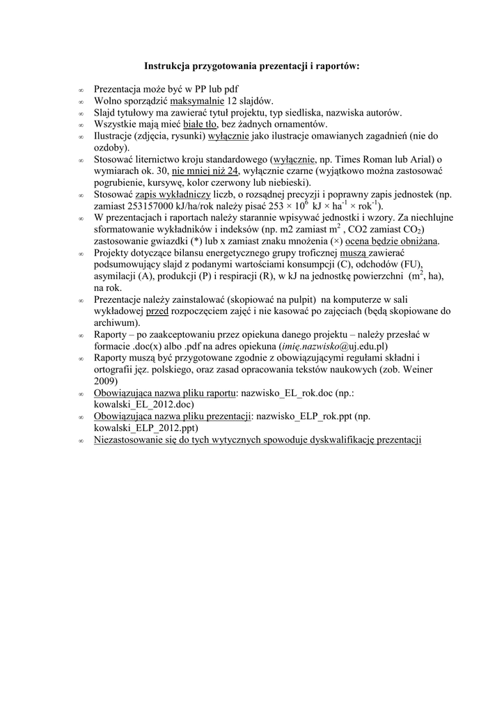 Instrukcja przygotowania prezentacji i raportów: • • • • • • • • • • • • • • • Prezentacja moŜe być w PP lub pdf Wolno sporządzić maksymalnie 12 slajdów. Slajd tytułowy ma zawierać tytuł projektu, typ siedliska, nazwiska autorów. Wszystkie mają mieć białe tło, bez Ŝadnych ornamentów. Ilustracje (zdjęcia, rysunki) wyłącznie jako ilustracje omawianych zagadnień (nie do ozdoby). Stosować liternictwo kroju standardowego (wyłącznie, np. Times Roman lub Arial) o wymiarach ok. 30, nie mniej niŜ 24, wyłącznie czarne (wyjątkowo moŜna zastosować pogrubienie, kursywę, kolor czerwony lub niebieski). Stosować zapis wykładniczy liczb, o rozsądnej precyzji i poprawny zapis jednostek (np. zamiast 253157000 kJ/ha/rok naleŜy pisać 253 × 106 kJ × ha-1 × rok-1). W prezentacjach i raportach naleŜy starannie wpisywać jednostki i wzory. Za niechlujne sformatowanie wykładników i indeksów (np. m2 zamiast m2 , CO2 zamiast CO2) zastosowanie gwiazdki (*) lub x zamiast znaku mnoŜenia (×) ocena będzie obniŜana. Projekty dotyczące bilansu energetycznego grupy troficznej muszą zawierać podsumowujący slajd z podanymi wartościami konsumpcji (C), odchodów (FU), asymilacji (A), produkcji (P) i respiracji (R), w kJ na jednostkę powierzchni (m2, ha), na rok. Prezentacje naleŜy zainstalować (skopiować na pulpit) na komputerze w sali wykładowej przed rozpoczęciem zajęć i nie kasować po zajęciach (będą skopiowane do archiwum). Raporty – po zaakceptowaniu przez opiekuna danego projektu – naleŜy przesłać w formacie .doc(x) albo .pdf na adres opiekuna (imię[email protected]) Raporty muszą być przygotowane zgodnie z obowiązującymi regułami składni i ortografii jęz. polskiego, oraz zasad opracowania tekstów naukowych (zob. Weiner 2009) Obowiązująca nazwa pliku raportu: nazwisko_EL_rok.doc (np.: kowalski_EL_2012.doc) Obowiązująca nazwa pliku prezentacji: nazwisko_ELP_rok.ppt (np. kowalski_ELP_2012.ppt) Niezastosowanie się do tych wytycznych spowoduje dyskwalifikację prezentacji