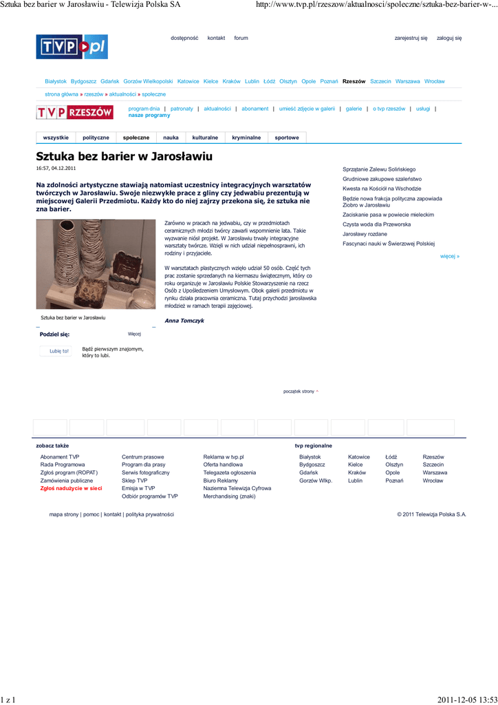 Sztuka bez barier w Jarosławiu - Telewizja Polska SA 1z1 http://www.tvp.pl/rzeszow/aktualnosci/spoleczne/sztuka-bez-barier-w-... dostępność kontakt forum zarejestruj się zaloguj się Białystok Bydgoszcz Gdańsk Gorzów Wielkopolski Katowice Kielce Kraków Lublin Łódź Olsztyn Opole Poznań Rzeszów Szczecin Warszawa Wrocław strona główna » rzeszów » aktualności » społeczne program dnia | patronaty | aktualności | abonament | umieść zdjęcie w galerii | galerie | o tvp rzeszów | usługi | nasze programy wszystkie polityczne społeczne nauka kulturalne kryminalne sportowe Sztuka bez barier w Jarosławiu 16:57, 04.12.2011 Sprzątanie Zalewu Solińskiego Grudniowe zakupowe szaleństwo Na zdolności artystyczne stawiają natomiast uczestnicy integracyjnych warsztatów twórczych w Jarosławiu. Swoje niezwykłe prace z gliny czy jedwabiu prezentują w miejscowej Galerii Przedmiotu. Każdy kto do niej zajrzy przekona się, że sztuka nie zna barier. Zarówno w pracach na jedwabiu, czy w przedmiotach ceramicznych młodzi twórcy zawarli wspomnienie lata. Takie wyzwanie niósł projekt. W Jarosławiu trwały integracyjne warsztaty twórcze. Wzięli w nich udział niepełnosprawni, ich rodziny i przyjaciele. Kwesta na Kościół na Wschodzie Będzie nowa frakcja polityczna zapowiada Ziobro w Jarosławiu Zaciskanie pasa w powiecie mieleckim Czysta woda dla Przeworska Jarosławy rozdane Fascynaci nauki w Świerzowej Polskiej więcej » W warsztatach plastycznych wzięło udział 50 osób. Część tych prac zostanie sprzedanych na kiermaszu świątecznym, który co roku organizuje w Jarosławiu Polskie Stowarzyszenie na rzecz Osób z Upośledzeniem Umysłowym. Obok galerii przedmiotu w rynku działa pracownia ceramiczna. Tutaj przychodzi jarosławska młodzież w ramach terapii zajęciowej. Sztuka bez barier w Jarosławiu Więcej Podziel się: Lubię to! Anna Tomczyk Bądź pierwszym znajomym, który to lubi. początek strony ^ zobacz także Abonament TVP Rada Programowa Zgłoś program (ROPAT) Zamówienia publiczne Zgłoś nadużycie w sieci tvp regionalne Centrum prasowe Program dla prasy Serwis fotograficzny Sklep TVP Emisja w TVP Odbiór programów TVP mapa strony | pomoc | kontakt | polityka prywatności Reklama w tvp.pl Oferta handlowa Telegazeta ogłoszenia Biuro Reklamy Naziemna Telewizja Cyfrowa Merchandising (znaki) Białystok Bydgoszcz Gdańsk Gorzów Wlkp. Katowice Kielce Kraków Lublin Łódź Olsztyn Opole Poznań Rzeszów Szczecin Warszawa Wrocław © 2011 Telewizja Polska S.A. 2011-12-05 13:53
