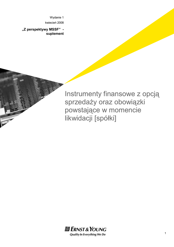 Wydanie 1 kwiecień 2008 „Z perspektywy MSSF” suplement Instrumenty finansowe z opcją sprzedaży oraz obowiązki powstające w momencie likwidacji [spółki] 1 14 lutego 2008 r. Rada Międzynarodowych Standardów Rachunkowości (RMSR) wydała nowelizację MSR 32 Instrumenty finansowe: prezentacja oraz MSR 1 Prezentacja sprawozdań finansowych, w zakresie instrumentów finansowych z opcją sprzedaży oraz obowiązków powstających w momencie likwidacji spółki. Nowelizacja ma na celu udostępnienie praktycznego, krótkoterminowego rozwiązania, umożliwiającego prezentowanie udziałów w jednostkach niebędących spółkami kapitałowymi, jako pozycji kapitału własnego. Do takich udziałów zalicza się wiele udziałów w funduszach otwartych, funduszach zamkniętych o ograniczonym okresie działalności, spółdzielniach i spółkach osobowych, które są obecnie prezentowane jako zobowiązania, zgodnie z definicją zobowiązania finansowego w MSR 32. Zakres, jakiego dotyczy zmiana, jest ograniczony i nie należy jej postanowień stosować poprzez analogię do innych obszarów nie objętych bezpośrednio zakresem zmiany. RMSR opublikowała dokument zawierający tezy dyskusji, dotyczący bardziej kompleksowych, długoterminowych zmian w MSR 32. Został on szczegółowo omówiony w wydaniu 2 dodatku do Z perspektywy MSSF zatytułowanym Zobowiązania a kapitał własny (dostępny pod adresem http://www.ey.com/global/content.n sf/Poland/Assurance_-_MSSF__MSSF_Alert). Zakres Zmiany dotyczą dwóch typów instrumentów finansowych: a) Instrumentów finansowych z opcją sprzedaży, czyli instrumentów dających posiadaczowi prawo do wymagania od jednostki, która je wyemitowała, ich odkupienia lub umorzenia za gotówkę lub inny składnik aktywów finansowych, albo takich które podlegają automatycznemu umorzeniu/odsprzedaży na rzecz tej jednostki w przypadku wystąpienia niepewnego zdarzenia przyszłego, śmierci posiadacza lub jego odejścia na emeryturę. b) Instrumentów finansowych zawierających obowiązek jednostki do przekazania posiadaczowi instrumentu pewnej części aktywów netto jednostki w momencie jej likwidacji, jeżeli jej wystąpienie: „ jest pewne (np. gdy jednostka została utworzona na czas określony); lub „ jest uzależnione od woli posiadacza instrumentu. Kryteria Zmiana w MSR 32 wymaga klasyfikowania niektórych, wyżej wymienionych instrumentów finansowych, jako pozycji kapitału własnego, pod warunkiem że posiadają one wszystkie z następujących cech: „ Instrument uprawnia posiadacza do proporcjonalnej części aktywów netto jednostki w momencie likwidacji. „ Instrument należy do najbardziej podporządkowanej klasy instrumentów i nie posiada pierwszeństwa przed innymi roszczeniami do aktywów likwidowanej jednostki. W rezultacie, jeżeli jednostka ma wyemitowane jakiekolwiek inne instrumenty kapitałowe, które są bardziej podporządkowane lub które w momencie likwidacji miałyby takie samo pierwszeństwo, wówczas instrumentów takich nie można prezentować jako składników kapitału własnego. Byłoby tak nawet w przypadku, gdyby wartość klasy bardziej podporządkowanej była całkiem nieznaczna. W rezultacie ujmowanie wielu instrumentów objętych zakresem nowelizacji nie ulegnie zmianie. „ Wszystkie instrumenty należące do tej klasy muszą posiadać identyczne cechy. „ Jeżeli instrument posiada opcję sprzedaży, nie zawiera on żadnych innych obowiązków umownych przekazywania środków pieniężnych czy innych aktywów finansowych, poza samym obowiązkiem wykupienia lub umorzenia. „ Jeżeli instrument posiada opcję sprzedaży, łączne oczekiwane przepływy pieniężne przypadające na instrument w okresie jego ważności oparte są głównie na zysku lub stracie, zmianie rozpoznanych aktywów netto lub zmianie wartości godziwej ujętych i nie ujętych aktywów netto jednostki w okresie ważności instrumentu. „ Jednostka nie może być stroną żadnych instrumentów ani umów, które: 1) posiadałyby przepływy pieniężne oparte w zasadniczej mierze na zysku lub stracie, zmianie rozpoznanych aktywów netto lub zmianie wartości godziwej ujętych i nie ujętych aktywów netto jednostki w okresie ważności instrumentu; oraz 2) które w znaczącej mierze ograniczałyby lub ustalały pozostały zwrot na rzecz posiadaczy instrumentów podlegających zakresowi nowelizacji. 2 Podstawa obliczenia przewidywanych przepływów pieniężnych Nowelizacja nie narzuca określonej metody obliczania łącznych przewidywanych przepływów pieniężnych w okresie ważności instrumentu, wskazuje jednak, że wynik finansowy lub zmiana rozpoznanych aktywów netto muszą być wyceniane zgodnie z odpowiednimi standardami MSSF. W związku z tym jednak, że wymaga się, aby przewidywane przepływy pieniężne były „w zasadniczej mierze” oparte na tych wycenach, jednostka może wykazać, że przewidywane przepływy pieniężne, jeżeli zostały oparte na innej podstawie ujmowania (np. wynikającej z przepisów prawa lub krajowych standardów rachunkowości) byłyby w zasadniczej mierze podobne do opartych na MSSF. Istnieje również możliwość przedstawienia argumentu, iż większość różnic w wykazanym wyniku finansowym wynika tylko z czasu wyceny i nie wpływa w znaczącym stopniu na przewidywane przepływy pieniężne. Instrumenty pochodne oparte o instrumenty finansowe z opcją sprzedaży i instrumenty zawierające pewne obowiązki powstające w momencie likwidacji Nie ulegnie zmianie sposób ujmowania warrantów i innych instrumentów pochodnych opartych na instrumentach objętych zakresem nowelizacji. Zakres obowiązywania tej ostatniej jest bowiem z założenia ograniczony. Można przyjąć, że dotyczy to również opcji konwersji, zawartych w obligacjach zamiennych, jeżeli zezwalają one na zamianę na instrument objęty zakresem nowelizacji. Brak innych instrumentów finansowych i kontraktów Warunkiem koniecznym d