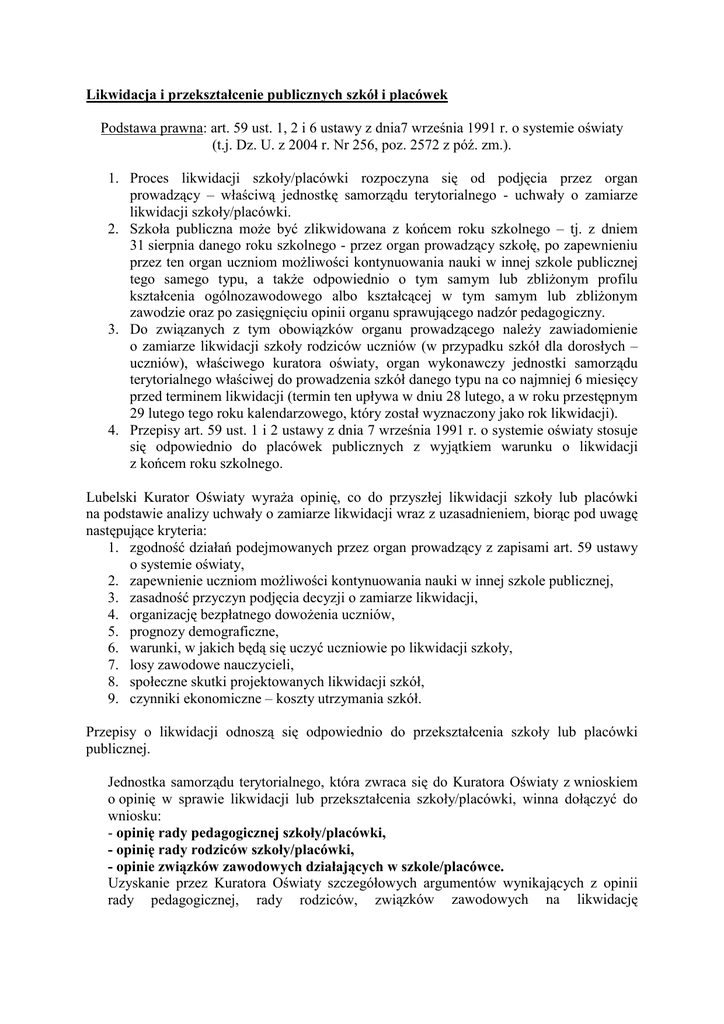 Likwidacja i przekształcenie publicznych szkół i placówek Podstawa prawna: art. 59 ust. 1, 2 i 6 ustawy z dnia7 września 1991 r. o systemie oświaty (t.j. Dz. U. z 2004 r. Nr 256, poz. 2572 z póź. zm.). 1. Proces likwidacji szkoły/placówki rozpoczyna się od podjęcia przez organ prowadzący – właściwą jednostkę samorządu terytorialnego - uchwały o zamiarze likwidacji szkoły/placówki. 2. Szkoła publiczna moŜe być zlikwidowana z końcem roku szkolnego – tj. z dniem 31 sierpnia danego roku szkolnego - przez organ prowadzący szkołę, po zapewnieniu przez ten organ uczniom moŜliwości kontynuowania nauki w innej szkole publicznej tego samego typu, a takŜe odpowiednio o tym samym lub zbliŜonym profilu kształcenia ogólnozawodowego albo kształcącej w tym samym lub zbliŜonym zawodzie oraz po zasięgnięciu opinii organu sprawującego nadzór pedagogiczny. 3. Do związanych z tym obowiązków organu prowadzącego naleŜy zawiadomienie o zamiarze likwidacji szkoły rodziców uczniów (w przypadku szkół dla dorosłych – uczniów), właściwego kuratora oświaty, organ wykonawczy jednostki samorządu terytorialnego właściwej do prowadzenia szkół danego typu na co najmniej 6 miesięcy przed terminem likwidacji (termin ten upływa w dniu 28 lutego, a w roku przestępnym 29 lutego tego roku kalendarzowego, który został wyznaczony jako rok likwidacji). 4. Przepisy art. 59 ust. 1 i 2 ustawy z dnia 7 września 1991 r. o systemie oświaty stosuje się odpowiednio do placówek publicznych z wyjątkiem warunku o likwidacji z końcem roku szkolnego. Lubelski Kurator Oświaty wyraŜa opinię, co do przyszłej likwidacji szkoły lub placówki na podstawie analizy uchwały o zamiarze likwidacji wraz z uzasadnieniem, biorąc pod uwagę następujące kryteria: 1. zgodność działań podejmowanych przez organ prowadzący z zapisami art. 59 ustawy o systemie oświaty, 2. zapewnienie uczniom moŜliwości kontynuowania nauki w innej szkole publicznej, 3. zasadność przyczyn podjęcia decyzji o zamiarze likwidacji, 4. organizację bezpłatnego dowoŜenia uczniów, 5. prognozy demograficzne, 6. warunki, w jakich będą się uczyć uczniowie po likwidacji szkoły, 7. losy zawodowe nauczycieli, 8. społeczne skutki projektowanych likwidacji szkół, 9. czynniki ekonomiczne – koszty utrzymania szkół. Przepisy o likwidacji odnoszą się odpowiednio do przekształcenia szkoły lub placówki publicznej. Jednostka samorządu terytorialnego, która zwraca się do Kuratora Oświaty z wnioskiem o opinię w sprawie likwidacji lub przekształcenia szkoły/placówki, winna dołączyć do wniosku: - opinię rady pedagogicznej szkoły/placówki, - opinię rady rodziców szkoły/placówki, - opinie związków zawodowych działających w szkole/placówce. Uzyskanie przez Kuratora Oświaty szczegółowych argumentów wynikających z opinii rady pedagogicznej, rady rodziców, związków zawodowych na likwidację (przekształcenie) szkoły/placówki pozwoli na wnikliwą i obiektywną ocenę problemu oraz wydanie właściwej i uzasadnionej opinii w przedmiotowej sprawie.