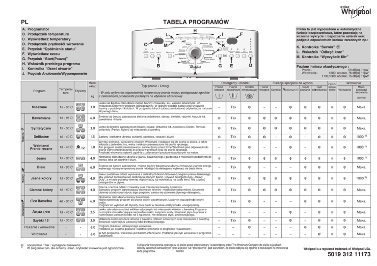 PL TABELA PROGRAMÓW A.Programator B. Przełącznik temperatury C. Wyœwietlacz temperatury D. Przełącznik prędkośći wirowania E. Przycisk “Opóźnienie startu” F. Wyœwietlacz czasu G. Przycisk “Start(Pauza)” H. Wskaźnik przebiegu programu I. Kontrolka “Drzwi otwarte” J. Przycisk Anulowanie/Wypompowanie Oszczędne Kolory Tkanina Program TemperaEtykiety tura Temp. °C L Odkrec kran ˛ Wstepne Zasadnicze Plukanie I Super Wirowanie plukanie Wypompow. M K Bawelniane J Delikatne co Bawelna Szybki 15’ Plukanie i wirowanie Wirowanie min. K. Kontrolka “Serwis” L. Wskaźnik “Odkręć kran” M.Kontrolka “Wyczyścić filtr” Start (Pauza) Welniane/ Pranie reczne Jeans Aqua co godz. Annulow./ Wypompowanie Opóznienie Super Cykl Wiroplukanie odswiezania wanie startu Syntetyczne Temp.°C B F Serwis Mieszane Biale Jasne Ciemne Szybkie Pozostaly czas Pralka ta jest wyposażona w automatyczne funkcje bezpieczeństwa, które pozwalają na wczesne wykrycie i rozpoznanie usterek oraz podjęcie odpowiednich kroków zaradczych np.: Drzwi otwarte Wyczysc filtr C Pranie ˛ wstepne H G E D Poziom hałasu akustycznego : Pranie - 59 dB(A) / 1pW Wirowanie - 1200, obr/min, 76 dB(A) / 1pW 1100,1000, obr/min, 75 dB(A) / 1pW A Maks. wklad kg Typ prania / Uwagi - W celu wybrania odpowiedniej temperatury prania należy postępować zgodnie z zaleceniami producenta podanymi na etykiecie ubraniowej Detergenty i dodatki Funkcje specjalne do wyboru Wirowanie Opóźnienie Super Cykl Maks. płukanie odświeżania startu Wirowanie prędkość wirowania Pranie Pranie Środek Pranie wstêpne zasadnicze zmiêkczający wstêpne Szybkie obr/min Mieszane 15 - 60°C 3.0 Lekko lub średnio zabrudzone mocne tkaniny z bawełny, lnu, włókien sztucznych i ich mieszanek.Efektywny program jednogodzinny. W jednym wsadzie należy prać wyłącznie tkaniny o podobnych kolorach. W przypadku silnych zabrudzeń dodawać odplamiacze na bazie aktywnego tlenu. Bawe³niane 15 - 95°C 6.0 Średnio lub berdzo zabrudzona bielizna pošcielowa, obrusy, bielizna, ręczniki, koszule itd. bawełniane i lniane. i Tak i i i i i i i i Maks. Syntetyczne 15 - 60°C 3.0 Lekko do średnio zabrudzonych bluzek, koszul, fartuchów itd. z poliestru (Diolen, Trevira), poliamidu (Perlon, Nylon) lub mieszanek z bawełną. i Tak i i i i i i i i Maks. Delikatne 15 - 40°C 1.5 Zasłony i delikatne ubrania, sukienki, spódnice, koszule i bluzki. i Tak i i – i – i i i 1000 1) – Tak i – – i – i i i 1000 1) – Tak i – – i i i i i Maks. Wełniane/ Pranie rêczne 15 - 40°C 1.0 Wyroby wełniane, oznaczone znakiem Woolmark i nadające się do prania w pralce, a także tekstylia z jedwabiu, lnu, wełny i wiskozy przeznaczone do prania ręcznego. Ten program został przetestowany i zatwierdzony przez firmę Woolmark jako odpowiedni do prania wełny przeznaczonej do prania w pralkach oraz do prania ręcznego. Prędkość wirowania ustawić zgodnie z zaleceniami producenta podanymi na metce. Jeans 15 - 60°C 4.0 Normalnie zabrudzone ubrania z jeansu bawełnianego i garderoba z materiałów podobnych do jeansu, taka jak spodnie i bluzy. i Tak i i i i i i i i 1000 1) Białe 15 - 60°C 6.0 Średnio lub bardzo zabrudzone i mocne tkaniny bawełniane.Można zmniejszyć zużycie energii, wybierając niższą temperaturę prania i dodając do detergentu wybielacz na bazie tlenu. – Tak i – – – i i i i Maks. Jasne kolory 15 - 60°C 4.0 Biała i pastelowa odzież wykonana z delikatnych tkanin.Stosować program prania delikatnego, aby uniknąć zszarzenia lub zżółknięcia pranych tkanin. Używać detergentu typu „Heavy Duty”, a w razie potrzeby również odplamiaczy lub wybielaczy na bazie tlenu. Nie używać detergentów w płynie. i Tak i i i i i i i i 1000 1) Ciemne kolory 15 - 60°C 4.0 Czarna i ciemna odzież z bawełny oraz mieszanek bawełny i poliestru. Specjalny program ograniczający blaknięcie kolorów i miejscowe odbarwianie. Do prania ciemnej odzieży przy użyciu tego programu zaleca się używanie płynnego detergentu. i Tak i i i i i i i i Maks. co Bawelna 40 - 60°C 6.0 Normalnie zabrudzone tkaniny bawełniane. Najkorzystniejszy program do prania tkanin bawełnianych. Łączy on oszczędność wody i prądu. Program ten wybrano do etykiety zacji pralki w zakresie efektywności energetycznej. – Tak i – – – i i i i Maks. 15 - 40°C 2.5 Lekko zabrudzona odzież włókien sztucznych lub mieszanek włókien z bawełną.Programy oszczędne charakteryzujące się bardzo niskim zużyciem wody. Stosować płyn do prania w najmniejszej zalecanej ilości na 3 kg prania. Nie dodawać płynu zmiękczającego. – Tak – – – i – i i i Maks. 15 - 30°C 3.0 Odświeża krótko noszone ubrania z bawełny, włókien sztucznych oraz mieszanek z bawełną. Stosować najmniejszą zalecaną ilość środka piorącego. – Tak i – – i – i i i Maks. Płukanie i wirowanie - - 6.0 Program płukania i intensywnego wirowania. Podobnie jak ostatnie płukanie i ostatnie wirowanie w programie “Bawełniane”. – – i – – – i i i i Maks. Wirowanie - - 6.0 W tym programie, wirowanie jest bardzo intensywne. Podobnie jak cykl wirowania w programie Bawełniane. – – – – – – – i i i Maks. Szybki 15’ i: opcjonalnie / Tak : wymagane dozowania 1) W programie tym, dla ochrony ubrañ, szybkoœæ wirowania jest ograniczona. Cykl prania we³ny/prania rêcznego w tej pralce zosta³ przetestowany i zatwierdzony przez The Woolmark Company do prania w pralkach odzie¿y Woolmark oznaczonych “praæ w pralce” lub “praæ rêcznie”, pod warunkiem, ¿e pranie odbywa siê zgodnie z instrukcjami na metce oraz kart¹ programów. M0703 Whirlpool is a registered trademark of Whirlpool USA. 5019 312 11173 DANE ODNOŚNIE ZUżYCIA ENERGII I WODY Program Temperatura (°C) Wsad Woda (kg) (l) Mieszane Bawe³niane Bawe³niane Bawe³niane Syntetyczne Syntetyczne Delikatne Wełniane/Pranie rêczne Jeans Białe Jasne kolory Ciemne k