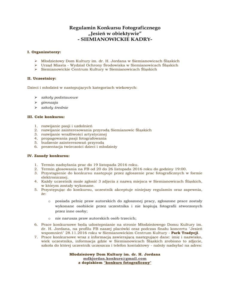 Regulamin Konkursu Fotograficznego „Jesień w obiektywie” - SIEMIANOWICKIE KADRYI. Organizatorzy: Młodzieżowy Dom Kultury im. dr. H. Jordana w Siemianowicach Śląskich Urząd Miasta - Wydział Ochrony Środowiska w Siemianowicach Śląskich Siemianowickie Centrum Kultury w Siemianowicach Śląskich II. Uczestnicy: Dzieci i młodzież w następujących kategoriach wiekowych: szkoły podstawowe gimnazja szkoły średnie III. Cele konkursu: 1. 2. 3. 4. 5. 6. rozwijanie pasji i uzdolnień rozwijanie zainteresowania przyrodą Siemianowic Śląskich rozwijanie wrażliwości artystycznej propagowania pasji fotografowania budzenie zainteresowań przyrodą prezentacja twórczości dzieci i młodzieży IV. Zasady konkursu: 1. Termin nadsyłania prac do 19 listopada 2016 roku. 2. Termin głosowania na FB od 20 do 26 listopada 2016 roku do godziny 19:00. 3. Przystąpienie do konkursu następuje przez zgłoszenie prac fotograficznych w formie elektronicznej. 4. Każdy uczestnik może zgłosić 3 zdjęcia z nazwą miejsca w Siemianowicach Śląskich, w którym zostały wykonane. 5. Przystępując do konkursu, uczestnik akceptuje niniejszy regulamin oraz zapewnia, że: o posiada pełnię praw autorskich do zgłoszonej pracy, zgłoszone prace zostały wykonane osobiście przez uczestnika i nie kopiują fotografii stworzonych przez inne osoby; o nie narusza praw autorskich osób trzecich; 6. Prace konkursowe będą udostępnianie na stronie Młodzieżowego Domu Kultury im. dr. H. Jordana, na profilu FB naszej placówki oraz podczas finału koncertu "Jesień wspomnień" 28.11.2016 roku w Siemianowickim Centrum Kultury - Park Tradycji. 7. Prace konkursowe wraz z informacją zawierającą następujące dane: imię i nazwisko, wiek uczestnika, informacja gdzie w Siemianowicach Śląskich zrobiono to zdjęcie, szkoła do której uczestnik uczęszcza i telefon kontaktowy - należy nadsyłać na adres: Młodzieżowy Dom Kultury im. dr. H. Jordana [email protected] z dopiskiem "konkurs fotograficzny" V. Zasady rozstrzygnięcia konkursu: 1. Zgłoszone zdjęcia będą poddane ocenie użytkowników FB w 3 kategoriach wiekowych, w każdej kategorii zostanie wyłoniony laureat. 2. W każdej kategorii wiekowej zostanie nagrodzone zdjęcie, które uzyskało największą ilość polubień na FB. 3. Wyniki konkursu będą ogłoszone na stronie Młodzieżowego Domu Kultury im. dr. H. Jordana oraz na profilu FB. 4. Laureaci o wynikach konkursu zostaną poinformowani 28 listopada 2016 roku i zostaną nagrodzeni podczas koncertu finałowego "Jesień wspomnień", który odbędzie się o godzinie 16:00 w Siemianowickim Centrum Kultury - Park Tradycji ul. Orzeszkowej 12 w Siemianowicach Śląskich. VI. Postanowienia końcowe: 1. Udział w konkursie jest równoznaczny z wyrażeniem zgody na wykorzystanie danych osobowych uczestnika. 2. Organizator nie ponosi odpowiedzialności za naruszenie praw autorskich osób trzecich przez uczestnika konkursu. 3. Niniejszy regulamin dostępny jest na stronie internetowej oraz na FB.