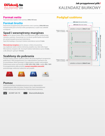 Jak przygotować plik? KALENDARZ BIURKOWY Format netto Twój kalendarz będzie miał wymiary 200x130 mm. Podgląd szablonu 206 mm (format brutto) Format brutto Poprawnie przygotowany plik powinien mieć wymiary 206x348 mm. Format brutto jest to format netto powiększony o spad oraz zakładki na klejenie. zakładka na klejenie (206x21 mm) 5 mm (przedłużenie grafiki na zakładkę) 110 mm Spad jest to obszar druku, który wychodzi poza obszar ostatecznego rozmiaru wydruku. Gwarantuje on, że obszar grafiki będzie dochodził do samej krawędzi przycięcia kalendarza. Spad dla każdego z bocznych boków kalendarza wynosi 3 mm. 190 mm (wew. margines) 110 mm Wewnętrzny margines jest to obszar, w który nie powinny się znajdować żadne istotne elementy projektu (np. tekst albo logo). Wewnętrzny margines dla bocznych boków kalendarza wynosi 5 mm, a dla dolnych i górnych 10 mm. Szablony do pobrania Poniżej możesz pobrać szablony plików dla poszczególnych programów graficznych. Pliki przygotowane są w odpowiednim rozmiarze oraz ze znacznikami, które pomogą Ci odpowiednio osadzić swój projket. Preferowane przez nas formaty to PDF, EPS, PSD, CDR, a także JPG i TIFF. Po przygotowaniu pliku prosimy usunąć wszystkie znaczniki, pozostawiając widoczny wyłacznie sam projekt. Pomoc Jeżeli potrzebujesz dodatkowej pomocy przy odpowiednim przygotowaniu pliku do druku, możesz się z nami skontaktować drogą mail’ową oraz telefoniczną. Z chęcią służymy pomocą. 22 847-24-15 [email protected] 190 mm (wew. margines) 5 mm (przedłużenie grafiki na zakładkę) zakładka na klejenie (206x57 mm) 348 mm (format brutto - grafika + zakładki) 270 mm (format brutto - grafika) 130 mm (format netto) 130 mm (format netto) Spad i wewnętrzny margines 200 mm (format netto)