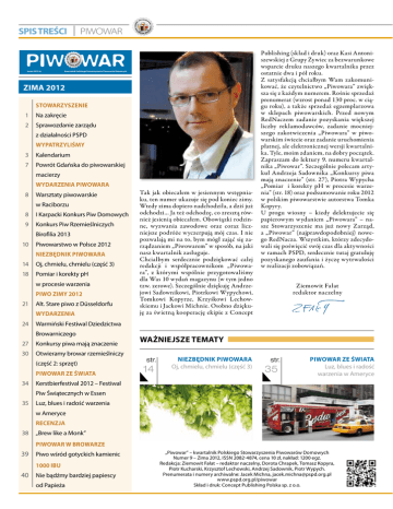 SPIS TREŚCI Jesień 2012 (8) PIWOWAR Kwartalnik Polskiego Stowarzyszenia Piwowarów Domowych ZIMA 2012 STOWARZYSZENIE 1 Na zakręcie 2 Sprawozdanie zarządu z działalności PSPD WYPATRZYLIŚMY 3 Kalendarium 7 Powrót Gdańska do piwowarskiej macierzy WYDARZENIA PIWOWARA 8 Warsztaty piwowarskie w Raciborzu 8 I Karpacki Konkurs Piw Domowych 9 Konkurs Piw Rzemieślniczych Birofilia 2013 10 Piwowarstwo w Polsce 2012 NIEZBĘDNIK PIWOWARA 14 Oj, chmielu, chmielu (część 3) 18 Pomiar i korekty pH w procesie warzenia PIWO ZIMY 2012 21 Alt. Stare piwo z Düsseldorfu WYDARZENIA 24 Ziemowit Fałat redaktor naczelny Warmiński Festiwal Dziedzictwa Browarniczego 27 Konkursy piwa mają znaczenie 30 Otwieramy browar rzemieślniczy (część 2: sprzęt) PIWOWAR ZE ŚWIATA 34 Tak jak obiecałem w jesiennym wstępniaku, ten numer ukazuje się pod koniec zimy. Wtedy zima dopiero nadchodziła, a dziś już odchodzi... Ja też odchodzę, co zresztą również jesienią obiecałem. Obowiązki rodzinne, wyzwania zawodowe oraz coraz liczniejsze podróże wyczerpują mój czas. I nie pozwalają mi na to, bym mógł zająć się zarządzaniem „Piwowarem” w sposób, na jaki nasz kwartalnik zasługuje. Chciałbym serdecznie podziękować całej redakcji i współpracownikom „Piwowara”, z którymi wspólnie przygotowaliśmy dla Was 10 wydań magazynu (w tym jedno tzw. zerowe). Szczególnie dziękuję Andrzejowi Sadownikowi, Piotrkowi Wypychowi, Tomkowi Kopyrze, Krzyśkowi Lechowskiemu i Jackowi Michnie. Osobno dziękuję za świetną kooperację ekipie z Concept Publishing (skład i druk) oraz Kasi Antoniszewskiej z Grupy Żywiec za bezwarunkowe wsparcie druku naszego kwartalnika przez ostatnie dwa i pół roku. Z satysfakcją chciałbym Wam zakomunikować, że czytelnictwo „Piwowara” zwiększa się z każdym numerem. Rośnie sprzedaż prenumerat (wzrost ponad 130 proc. w ciągu roku), a także sprzedaż egzemplarzowa w sklepach piwowarskich. Przed nowym RedNaczem zadanie pozyskania większej liczby reklamodawców, zadanie mocniejszego zakotwiczenia „Piwowara” w piwowarskim świecie oraz zadanie uruchomienia płatnej, ale elektronicznej wersji kwartalnika. Tyle, moim zdaniem, na dobry początek. Zapraszam do lektury 9. numeru kwartalnika „Piwowar”. Szczególnie polecam artykuł Andrzeja Sadownika „Konkursy piwa mają znaczenie” (str. 27), Piotra Wypycha „Pomiar i korekty pH w procesie warzenia” (str. 18) oraz podsumowanie roku 2012 w polskim piwowarstwie autorstwa Tomka Kopyry. U progu wiosny – kiedy delektujecie się papierowym wydaniem „Piwowara” – nasze Stowarzyszenie ma już nowy Zarząd, a „Piwowar” (najprawdopodobniej) nowego RedNacza. Wszystkim, którzy zdecydowali się poświęcić swój czas dla aktywności w ramach PSPD, serdecznie tutaj gratuluję pozyskanego zaufania i życzę wytrwałości w realizacji zobowiązań. WAŻNIEJSZE TEMATY str. 14 NIEZBĘDNIK PIWOWARA Oj, chmielu, chmielu (część 3) str. 35 PIWOWAR ZE ŚWIATA Luz, blues i radość warzenia w Ameryce Kerstbierfestival 2012 – Festiwal Piw Świątecznych w Essen 35 Luz, blues i radość warzenia w Ameryce RECENZJA 38 „Brew like a Monk” PIWOWAR W BROWARZE 39 Piwo wśród gotyckich kamienic 1000 IBU 40 Nie bądźmy bardziej papiescy od Papieża „Piwowar” – kwartalnik Polskiego Stowarzyszenia Piwowarów Domowych Numer 9 – Zima 2012, ISSN 2082-4874, cena 10 zł, nakład: 1200 egz. Redakcja: Ziemowit Fałat – redaktor naczelny, Dorota Chrapek, Tomasz Kopyra, Piotr Kucharski, Krzysztof Lechowski, Andrzej Sadownik, Piotr Wypych. Prenumerata i numery archiwalne: Jacek Michna, [email protected] www.pspd.org.pl/piwowar Skład i druk: Concept Publishing Polska sp. z o.o.