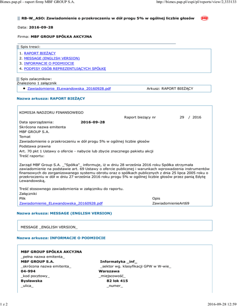 Biznes.pap.pl - raport firmy MBF GROUP S.A. 1z2 http://biznes.pap.pl/espi/pl/reports/view/2,333133 RB-W_ASO: Zawiadomienie o przekroczeniu w dół progu 5% w ogólnej liczbie głosów Data: 2016-09-28 Firma: MBF GROUP SPÓŁKA AKCYJNA Spis tresci: 1. RAPORT BIEŻĄCY 2. MESSAGE (ENGLISH VERSION) 3. INFORMACJE O PODMIOCIE 4. PODPISY OSÓB REPREZENTUJĄCYCH SPÓŁKĘ Spis zalacznikow: Znaleziono 1 załącznik Zawiadomienie_ELewandowska_20160928.pdf Arkusz: RAPORT BIEŻĄCY Nazwa arkusza: RAPORT BIEŻĄCY KOMISJA NADZORU FINANSOWEGO Raport bieżący nr Data sporządzenia: 2016-09-28 Skrócona nazwa emitenta MBF GROUP S.A. Temat Zawiadomienie o przekroczeniu w dół progu 5% w ogólnej liczbie głosów Podstawa prawna Art. 70 pkt 1 Ustawy o ofercie - nabycie lub zbycie znacznego pakietu akcji Treść raportu: 29 / 2016 Zarząd MBF Group S.A. _"Spółka"_ informuje, iż w dniu 28 września 2016 roku Spółka otrzymała zawiadomienie na podstawie art. 69 Ustawy o ofercie publicznej i warunkach wprowadzenia instrumentów finansowych do zorganizowanego systemu obrotu oraz o spółkach publicznych z dnia 25 lipca 2005 roku o przekroczeniu w dół w dniu 27 września 2016 roku progu 5% w ogólnej liczbie głosów przez panią Edytę Lewandowską. Treść stosownego zawiadomienia w załączniku do raportu. Załączniki Plik Zawiadomienie_ELewandowska_20160928.pdf Opis ZawiadomienieArt69 Nazwa arkusza: MESSAGE (ENGLISH VERSION) MESSAGE _ENGLISH VERSION_ Nazwa arkusza: INFORMACJE O PODMIOCIE MBF GROUP SPÓŁKA AKCYJNA _pełna nazwa emitenta_ MBF GROUP S.A. _skrócona nazwa emitenta_ 04-994 _kod pocztowy_ Bysławska _ulica_ Informatyka _inf_ _sektor wg. klasyfikacji GPW w W-wie_ Warszawa _miejscowość_ 82 lok 415 _numer_ 2016-09-28 12:59 Biznes.pap.pl - raport firmy MBF GROUP S.A. 2z2 +48 22 350 70 98 _telefon_ [email protected] _e-mail_ 894-301-86-15 _NIP_ http://biznes.pap.pl/espi/pl/reports/view/2,333133 +48 22 350 70 13 _fax_ www.mbfgroup.pl _www_ 021480943 _REGON_ Nazwa arkusza: PODPISY OSÓB REPREZENTUJĄCYCH SPÓŁKĘ PODPISY OSÓB REPREZENTUJĄCYCH SPÓŁKĘ Data Imię i Nazwisko 2016-09-28 Robert Krassowski Identyfikator raportu Stanowisko/Funkcja Prezes Zarządu Podpis Robert Krassowski ct9oscrwj1 Nazwa raportu RB-W_ASO Symbol raportu RB-W_ASO Nazwa emitenta MBF GROUP SPÓŁKA AKCYJNA Symbol Emitenta MBF GROUP S.A. Tytul Zawiadomienie o przekroczeniu w dół progu 5% w ogólnej liczbie głosów Sektor Informatyka (inf) Kod 04-994 Miasto Warszawa Ulica Bysławska Nr 82 lok 415 Tel. +48 22 350 70 98 Fax +48 22 350 70 13 e-mail [email protected] NIP 894-301-86-15 REGON 021480943 Data sporzadzenia 2016-09-28 Rok biezacy 2016 Numer 29 adres www www.mbfgroup.pl Serwis Ekonomiczny Polskiej Agencji Prasowej SA 2016 Copyright PAP SA - Wszelkie prawa zastrzezone. 2016-09-28 12:59