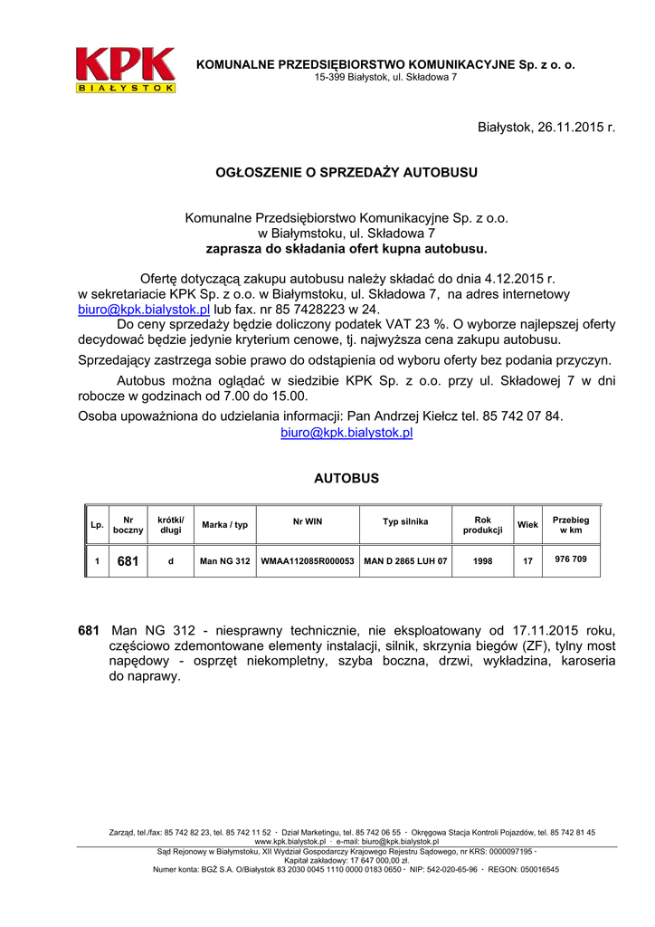 KOMUNALNE PRZEDSIĘBIORSTWO KOMUNIKACYJNE Sp. z o. o. 15-399 Białystok, ul. Składowa 7 Białystok, 26.11.2015 r. OGŁOSZENIE O SPRZEDAŻY AUTOBUSU Komunalne Przedsiębiorstwo Komunikacyjne Sp. z o.o. w Białymstoku, ul. Składowa 7 zaprasza do składania ofert kupna autobusu. Ofertę dotyczącą zakupu autobusu należy składać do dnia 4.12.2015 r. w sekretariacie KPK Sp. z o.o. w Białymstoku, ul. Składowa 7, na adres internetowy [email protected] lub fax. nr 85 7428223 w 24. Do ceny sprzedaży będzie doliczony podatek VAT 23 %. O wyborze najlepszej oferty decydować będzie jedynie kryterium cenowe, tj. najwyższa cena zakupu autobusu. Sprzedający zastrzega sobie prawo do odstąpienia od wyboru oferty bez podania przyczyn. Autobus można oglądać w siedzibie KPK Sp. z o.o. przy ul. Składowej 7 w dni robocze w godzinach od 7.00 do 15.00. Osoba upoważniona do udzielania informacji: Pan Andrzej Kiełcz tel. 85 742 07 84. [email protected] AUTOBUS Lp. Nr boczny krótki/ długi Marka / typ Nr WIN Typ silnika Rok produkcji Wiek Przebieg w km 1 681 d Man NG 312 WMAA112085R000053 MAN D 2865 LUH 07 1998 17 976 709 681 Man NG 312 - niesprawny technicznie, nie eksploatowany od 17.11.2015 roku, częściowo zdemontowane elementy instalacji, silnik, skrzynia biegów (ZF), tylny most napędowy - osprzęt niekompletny, szyba boczna, drzwi, wykładzina, karoseria do naprawy. Zarząd, tel./fax: 85 742 82 23, tel. 85 742 11 52 · Dział Marketingu, tel. 85 742 06 55 · Okręgowa Stacja Kontroli Pojazdów, tel. 85 742 81 45 www.kpk.bialystok.pl · e-mail: [email protected] Sąd Rejonowy w Białymstoku, XII Wydział Gospodarczy Krajowego Rejestru Sądowego, nr KRS: 0000097195 · Kapitał zakładowy: 17 647 000,00 zł. Numer konta: BGŻ S.A. O/Białystok 83 2030 0045 1110 0000 0183 0650 · NIP: 542-020-65-96 · REGON: 050016545