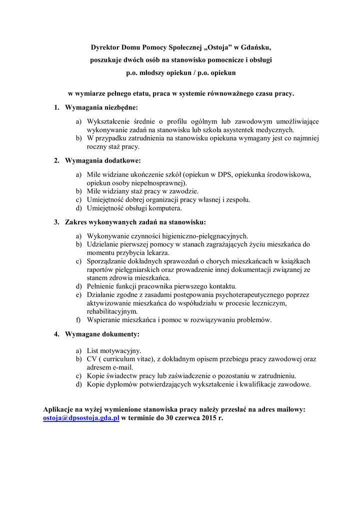 Dyrektor Domu Pomocy Społecznej „Ostoja” w Gdańsku, poszukuje dwóch osób na stanowisko pomocnicze i obsługi p.o. młodszy opiekun / p.o. opiekun w wymiarze pełnego etatu, praca w systemie równoważnego czasu pracy. 1. Wymagania niezbędne: a) Wykształcenie średnie o profilu ogólnym lub zawodowym umożliwiające wykonywanie zadań na stanowisku lub szkoła asystentek medycznych. b) W przypadku zatrudnienia na stanowisku opiekuna wymagany jest co najmniej roczny staż pracy. 2. Wymagania dodatkowe: a) Mile widziane ukończenie szkół (opiekun w DPS, opiekunka środowiskowa, opiekun osoby niepełnosprawnej). b) Mile widziany staż pracy w zawodzie. c) Umiejętność dobrej organizacji pracy własnej i zespołu. d) Umiejętność obsługi komputera. 3. Zakres wykonywanych zadań na stanowisku: a) Wykonywanie czynności higieniczno-pielęgnacyjnych. b) Udzielanie pierwszej pomocy w stanach zagrażających życiu mieszkańca do momentu przybycia lekarza. c) Sporządzanie dokładnych sprawozdań o chorych mieszkańcach w książkach raportów pielęgniarskich oraz prowadzenie innej dokumentacji związanej ze stanem zdrowia mieszkańca. d) Pełnienie funkcji pracownika pierwszego kontaktu. e) Działanie zgodne z zasadami postępowania psychoterapeutycznego poprzez aktywizowanie mieszkańca do współudziału w procesie leczniczym, rehabilitacyjnym. f) Wspieranie mieszkańca i pomoc w rozwiązywaniu problemów. 4. Wymagane dokumenty: a) List motywacyjny. b) CV ( curriculum vitae), z dokładnym opisem przebiegu pracy zawodowej oraz adresem e-mail. c) Kopie świadectw pracy lub zaświadczenie o pozostaniu w zatrudnieniu. d) Kopie dyplomów potwierdzających wykształcenie i kwalifikacje zawodowe. Aplikacje na wyżej wymienione stanowiska pracy należy przesłać na adres mailowy: [email protected] w terminie do 30 czerwca 2015 r.