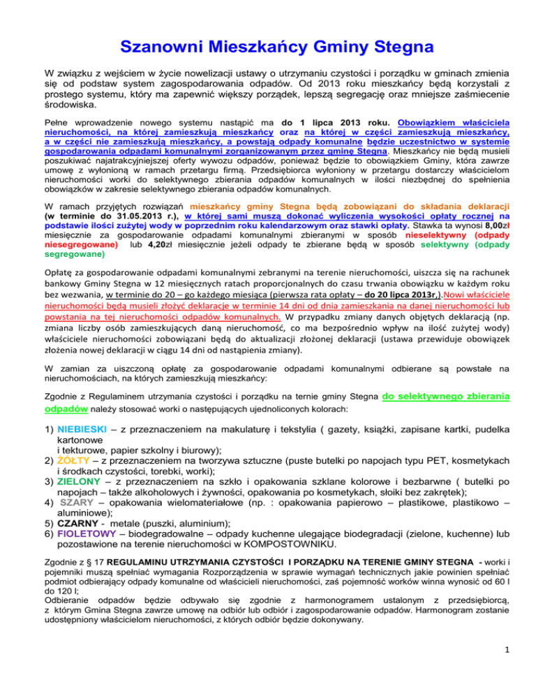 Szanowni Mieszkańcy Gminy Stegna W związku z wejściem w życie nowelizacji ustawy o utrzymaniu czystości i porządku w gminach zmienia się od podstaw system zagospodarowania odpadów. Od 2013 roku mieszkańcy będą korzystali z prostego systemu, który ma zapewnić większy porządek, lepszą segregację oraz mniejsze zaśmiecenie środowiska. Pełne wprowadzenie nowego systemu nastąpić ma do 1 lipca 2013 roku. Obowiązkiem właściciela nieruchomości, na której zamieszkują mieszkańcy oraz na której w części zamieszkują mieszkańcy, a w części nie zamieszkują mieszkańcy, a powstają odpady komunalne będzie uczestnictwo w systemie gospodarowania odpadami komunalnymi zorganizowanym przez gminę Stegna. Mieszkańcy nie będą musieli poszukiwać najatrakcyjniejszej oferty wywozu odpadów, ponieważ będzie to obowiązkiem Gminy, która zawrze umowę z wyłonioną w ramach przetargu firmą. Przedsiębiorca wyłoniony w przetargu dostarczy właścicielom nieruchomości worki do selektywnego zbierania odpadów komunalnych w ilości niezbędnej do spełnienia obowiązków w zakresie selektywnego zbierania odpadów komunalnych. W ramach przyjętych rozwiązań mieszkańcy gminy Stegna będą zobowiązani do składania deklaracji (w terminie do 31.05.2013 r.), w której sami muszą dokonać wyliczenia wysokości opłaty rocznej na podstawie ilości zużytej wody w poprzednim roku kalendarzowym oraz stawki opłaty. Stawka ta wynosi 8,00zł miesięcznie za gospodarowanie odpadami komunalnymi zbieranymi w sposób nieselektywny (odpady niesegregowane) lub 4,20zł miesięcznie jeżeli odpady te zbierane będą w sposób selektywny (odpady segregowane) Opłatę za gospodarowanie odpadami komunalnymi zebranymi na terenie nieruchomości, uiszcza się na rachunek bankowy Gminy Stegna w 12 miesięcznych ratach proporcjonalnych do czasu trwania obowiązku w każdym roku bez wezwania, w terminie do 20 – go każdego miesiąca (pierwsza rata opłaty – do 20 lipca 2013r,).Nowi właściciele nieruchomości będą musieli złożyć deklaracje w terminie 14 dni od dnia zamieszkania na danej nieruchomości lub powstania na tej nieruchomości odpadów komunalnych. W przypadku zmiany danych objętych deklaracją (np. zmiana liczby osób zamieszkujących daną nieruchomość, co ma bezpośrednio wpływ na ilość zużytej wody) właściciele nieruchomości zobowiązani będą do aktualizacji złożonej deklaracji (ustawa przewiduje obowiązek złożenia nowej deklaracji w ciągu 14 dni od nastąpienia zmiany). W zamian za uiszczoną opłatę za gospodarowanie odpadami komunalnymi odbierane są powstałe na nieruchomościach, na których zamieszkują mieszkańcy: Zgodnie z Regulaminem utrzymania czystości i porządku na ternie gminy Stegna do selektywnego zbierania odpadów należy stosować worki o następujących ujednoliconych kolorach: 1) NIEBIESKI – z przeznaczeniem na makulaturę i tekstylia ( gazety, książki, zapisane kartki, pudelka kartonowe i tekturowe, papier szkolny i biurowy); 2) ŻÓŁTY – z przeznaczeniem na tworzywa sztuczne (puste butelki po napojach typu PET, kosmetykach i środkach czystości, torebki, worki); 3) ZIELONY – z przeznaczeniem na szkło i opakowania szklane kolorowe i bezbarwne ( butelki po napojach – także alkoholowych i żywności, opakowania po kosmetykach, słoiki bez zakrętek); 4) SZARY – opakowania wielomateriałowe (np. : opakowania papierowo – plastikowe, plastikowo – aluminiowe); 5) CZARNY - metale (puszki, aluminium); 6) FIOLETOWY – biodegradowalne – odpady kuchenne ulegające biodegradacji (zielone, kuchenne) lub pozostawione na terenie nieruchomości w KOMPOSTOWNIKU. Zgodnie z § 17 REGULAMINU UTRZYMANIA CZYSTOŚCI I PORZĄDKU NA TERENIE GMINY STEGNA - worki i pojemniki muszą spełniać wymagania Rozporządzenia w sprawie wymagań technicznych jakie powinien spełniać podmiot odbierający odpady komunalne od właścicieli nieruchomości, zaś pojemność worków winna wynosić od 60 l do 120 l; Odbieranie odpadów będzie odbywało się zgodnie z harmonogramem ustalonym z przedsiębiorcą, z którym Gmina Stegna zawrze umowę na odbiór lub odbiór i zagospodarowanie odpadów. Harmonogram zostanie udostępniony właścicielom nieruchomości, z których odbiór będzie dokonywany. 1 Odpady komunalne zmieszane w zamian za uiszczoną opłatę będą odbierane w następujący sposób: 1) od właścicieli nieruchomości zabudowanych budynkami jednorodzinnymi i wielorodzinnymi, w których znajduje się nie więcej niż cztery lokale mieszkalne: jeden raz w miesiącu poza sezonem dwa razy w miesiącu w sezonie 2) od właścicieli nieruchomości zabudowanych budynkami wielorodzinnymi w których jest więcej niż cztery lokale mieszkalne: jeden raz w miesiącu poza sezonem dwa razy w miesiącu w sezonie 3) od właścicieli w części zamieszkałych a w części zajętych na prowadzenie działalności gospodarczej minimum cztery razy w miesiącu w okresie sezonu letniego – zgodnie z informacją zgłoszoną w deklaracji dwa razy w miesiącu w pozostałym okresie prowadzenia działalności gospodarczej. Odpady posegregowane w zamian za uiszczoną opłatę będą odbierane w następujący sposób: 1) odpady kuchenne składowane w osobnym pojemniku (w przypadku braku kompostownika): od właścicieli budynków jednorodzinnych i wielorodzinnych – dwa razy w miesiącu; w przypadku działalności gospodarczej (której powstają odpady kuchenne), prowadzonej na tej samej nieruchomości, na której zamieszkują mieszkańcy: jeden raz w tygodniu w okresie poza sezonem- każdego roku; trzy razy w tygodniu w okresie sezonu - każdego roku 2) odpady opakowaniowe – zbierane w oddzielnych workach oznaczonych kolorami lub w wyznaczonych pojemnikach – raz w miesiącu 3) odpady niebezpieczne – odbierane raz w miesiącu bądź na bieżąco w PSZOK (Punkt Selektywnej Zbiórki Odpadów Komunalnych) 4) odpady zielone z pielęgnacji ogródków – b