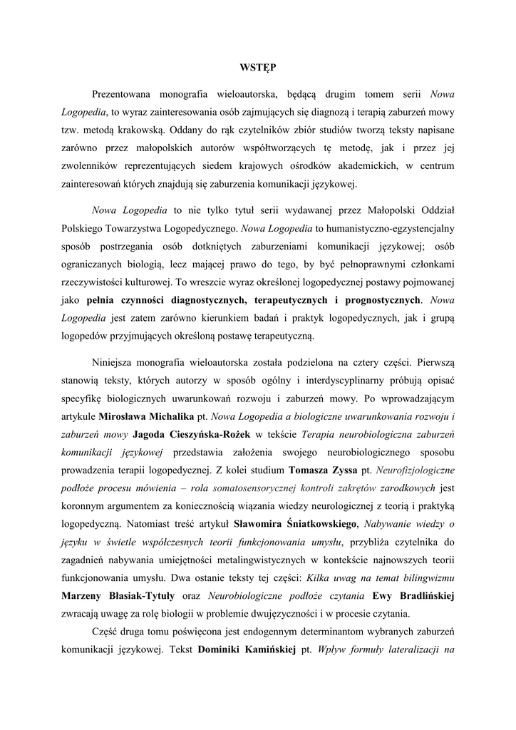 WSTĘP Prezentowana monografia wieloautorska, będącą drugim tomem serii Nowa Logopedia, to wyraz zainteresowania osób zajmujących się diagnozą i terapią zaburzeń mowy tzw. metodą krakowską. Oddany do rąk czytelników zbiór studiów tworzą teksty napisane zarówno przez małopolskich autorów współtworzących tę metodę, jak i przez jej zwolenników reprezentujących siedem krajowych ośrodków akademickich, w centrum zainteresowań których znajdują się zaburzenia komunikacji językowej. Nowa Logopedia to nie tylko tytuł serii wydawanej przez Małopolski Oddział Polskiego Towarzystwa Logopedycznego. Nowa Logopedia to humanistyczno-egzystencjalny sposób postrzegania osób dotkniętych zaburzeniami komunikacji językowej; osób ograniczanych biologią, lecz mającej prawo do tego, by być pełnoprawnymi członkami rzeczywistości kulturowej. To wreszcie wyraz określonej logopedycznej postawy pojmowanej jako pełnia czynności diagnostycznych, terapeutycznych i prognostycznych. Nowa Logopedia jest zatem zarówno kierunkiem badań i praktyk logopedycznych, jak i grupą logopedów przyjmujących określoną postawę terapeutyczną. Niniejsza monografia wieloautorska została podzielona na cztery części. Pierwszą stanowią teksty, których autorzy w sposób ogólny i interdyscyplinarny próbują opisać specyfikę biologicznych uwarunkowań rozwoju i zaburzeń mowy. Po wprowadzającym artykule Mirosława Michalika pt. Nowa Logopedia a biologiczne uwarunkowania rozwoju i zaburzeń mowy Jagoda Cieszyńska-Rożek w tekście Terapia neurobiologiczna zaburzeń komunikacji językowej przedstawia założenia swojego neurobiologicznego sposobu prowadzenia terapii logopedycznej. Z kolei studium Tomasza Zyssa pt. Neurofizjologiczne podłoże procesu mówienia – rola somatosensorycznej kontroli zakrętów zarodkowych jest koronnym argumentem za koniecznością wiązania wiedzy neurologicznej z teorią i praktyką logopedyczną. Natomiast treść artykuł Sławomira Śniatkowskiego, Nabywanie wiedzy o języku w świetle współczesnych teorii funkcjonowania umysłu, przybliża czytelnika do zagadnień nabywania umiejętności metalingwistycznych w kontekście najnowszych teorii funkcjonowania umysłu. Dwa ostanie teksty tej części: Kilka uwag na temat bilingwizmu Marzeny Błasiak-Tytuły oraz Neurobiologiczne podłoże czytania Ewy Bradlińskiej zwracają uwagę za rolę biologii w problemie dwujęzyczności i w procesie czytania. Część druga tomu poświęcona jest endogennym determinantom wybranych zaburzeń komunikacji językowej. Tekst Dominiki Kamińskiej pt. Wpływ formuły lateralizacji na kształtowanie się systemu fonetyczno-fonologicznego porusza kwestię dominacji stronnej jako podłoża biologicznego, na którym formuje się płaszczyzna fonetyczno-fonologiczna języka. Aspekt obwodowych przyczyn problemów artykulacyjnych dzieci jest w centrum uwagi Ewy Jeżewskiej-Krasnodębskiej, piszącej tekst: Obwodowe uwarunkowania zaburzeń artykulacji spółgłosek u dzieci 7-letnich. Z kolei Marta Korendo w artykule Specyfika postrzegania wzrokowego u dzieci z dysleksją podkreśla rolę i specyfikę narządu wzroku w wyodrębnianiu i terapii tego zaburzenia komunikacji językowej. Przeglądu nieprawidłowości rozwojowych towarzyszących potomstwu matek pijących alkohol w okresie ciąży dokonuje Halina Pawłowska-Jaroń w studium zatytułowanym Sfery zaburzonego rozwoju u dzieci z FASD. Natomiast Mirosław Michalik w tekście pt. Biologiczne determinanty rozwoju i zaburzeń mowy w mózgowym porażeniu dziecięcym omawia to zaburzenie rozwojowe w świetle nieprawidłowości motorycznych, posturalnych, zmysłowych i intelektualnych współtworzących ten syndrom. Podobnej interpretacji innego zaburzenia komunikacji językowej, afazji, dokonuje Anna Siudak w pracy pt. Neurobiologiczne uwarunkowania terapii osoby z afazją. Na część trzecią tomu składają się studia poświęcone kompensacyjnemu wymiarowi biologii wykorzystywanemu w procesie budowania kompetencji językowej lub usprawniania realizacji ciągów fonicznych. Zdzisława Orłowska-Popek w tekście pt. Neurobiologiczna stymulacja funkcji słuchowych prezentuje założenia i osiągnięcia terapeutycznego programu słuchowego w świetle badań neurobiologicznych. Z kolei postulat rozwijania kompetencji językowej, myślenia przyczynowo-skutkowego i funkcjonowania społecznego u dzieci z SLI jest główną tezą artykułu Stymulacja rozwoju mowy i myślenia u dzieci ze specyficznymi zaburzeniami rozwoju językowego Anny Skoczek. Przeniesienie zainteresowań z procedury budowania kompetencji lingwistycznej na proces usprawniania realizacji ciągów fonicznych następuje w pracy Danuty Pluty-Wojciechowskiej pt. Język lata jak łopata, czyli o ćwiczeniachtzw.pionizacjijęzyka. Natomiast Katarzyna Sedivy w opracowaniu pt. Uruchamianie wzorca artykulacyjnego u dzieci niemówiących przedstawia stosowaną z powodzeniem w praktyce metodę Manualnego Torowania Głosek. Ostatni tekst tej części tomu napisała Joanna Mąka. W obszernym studium pt. Zależności pomiędzy zaburzeniami procesów przetwarzania słuchowego a specyficznymi zaburzeniami rozwoju językowego. Próbki testów dla języka polskiego w ocenie CAPD i SLI autorka w kontekście zaburzeń procesów przetwarzania słuchowego i specyficznych zaburzeń rozwoju języka lokuje charakterystykę testów służących analizie tych nieprawidłowości. Część czwarta tomu to zbiór studiów przypadków stworzonych przez logopedówpraktyków związanych naukowo z Uniwersytetem Pedagogicznym w Krakowie. Małgorzata Krajewska analizuje afazję postępującą w przebiegu otępienia czołowo-skroniowego. Paulina Wójcik omawia przypadek afazji transkorowej mieszanej, zaś Halina PawłowskaJaroń kreśli obraz zaburzeń językowego funkcjonowania dziecka z epilepsją wyłączeniową. Z kolei Monika Sarota na przykładzie swego pacjenta opisuje specyfikę rozw