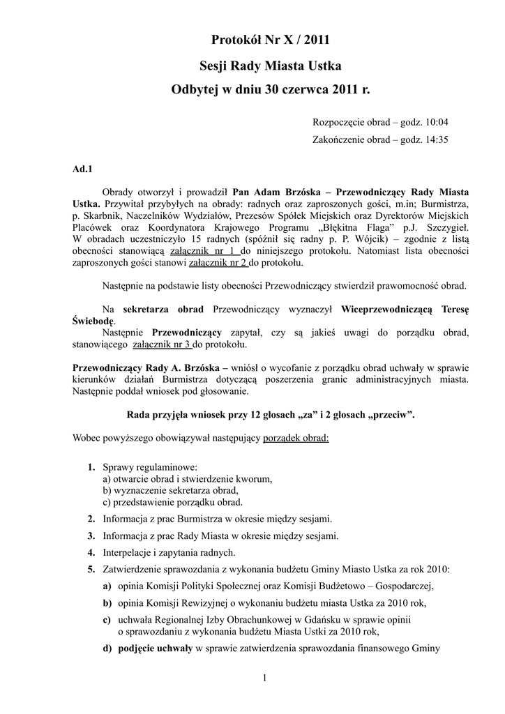 Protokół Nr X / 2011 Sesji Rady Miasta Ustka Odbytej w dniu 30 czerwca 2011 r. Rozpoczęcie obrad – godz. 10:04 Zakończenie obrad – godz. 14:35 Ad.1 Obrady otworzył i prowadził Pan Adam Brzóska – Przewodniczący Rady Miasta Ustka. Przywitał przybyłych na obrady: radnych oraz zaproszonych gości, m.in; Burmistrza, p. Skarbnik, Naczelników Wydziałów, Prezesów Spółek Miejskich oraz Dyrektorów Miejskich Placówek oraz Koordynatora Krajowego Programu „Błękitna Flaga” p.J. Szczygieł. W obradach uczestniczyło 15 radnych (spóźnił się radny p. P. Wójcik) – zgodnie z listą obecności stanowiącą załącznik nr 1 do niniejszego protokołu. Natomiast lista obecności zaproszonych gości stanowi załącznik nr 2 do protokołu. Następnie na podstawie listy obecności Przewodniczący stwierdził prawomocność obrad. Na sekretarza obrad Przewodniczący wyznaczył Wiceprzewodniczącą Teresę Świebodę. Następnie Przewodniczący zapytał, czy są jakieś uwagi do porządku obrad, stanowiącego załącznik nr 3 do protokołu. Przewodniczący Rady A. Brzóska – wniósł o wycofanie z porządku obrad uchwały w sprawie kierunków działań Burmistrza dotyczącą poszerzenia granic administracyjnych miasta. Następnie poddał wniosek pod głosowanie. Rada przyjęła wniosek przy 12 głosach „za” i 2 głosach „przeciw”. Wobec powyższego obowiązywał następujący porządek obrad: 1. Sprawy regulaminowe: a) otwarcie obrad i stwierdzenie kworum, b) wyznaczenie sekretarza obrad, c) przedstawienie porządku obrad. 2. Informacja z prac Burmistrza w okresie między sesjami. 3. Informacja z prac Rady Miasta w okresie między sesjami. 4. Interpelacje i zapytania radnych. 5. Zatwierdzenie sprawozdania z wykonania budżetu Gminy Miasto Ustka za rok 2010: a) opinia Komisji Polityki Społecznej oraz Komisji Budżetowo – Gospodarczej, b) opinia Komisji Rewizyjnej o wykonaniu budżetu miasta Ustka za 2010 rok, c) uchwała Regionalnej Izby Obrachunkowej w Gdańsku w sprawie opinii o sprawozdaniu z wykonania budżetu Miasta Ustki za 2010 rok, d) podjęcie uchwały w sprawie zatwierdzenia sprawozdania finansowego Gminy 1 Miasto Ustka za rok 2010 wraz ze sprawozdaniem z wykonania budżetu Gminy Miasto Ustka za rok 2010, e) podjęcie uchwały w sprawie zatwierdzenia bilansu instytucji kultury za rok 2010, f) uchwała Komisji Rewizyjnej w sprawie wniosku o udzielenie absolutorium Burmistrzowi Miasta Ustka za 2010 rok, g) uchwała Regionalnej Izby Obrachunkowej w Gdańsku do wniosku Komisji Rewizyjnej o udzielenie absolutorium Burmistrzowi Miasta Ustka za 2010 rok, h) d y s k u s j a, i) podjęcie uchwały w sprawie absolutorium dla Burmistrza Miasta Ustka z tytułu wykonania budżetu za 2010 rok. 6. Sprawozdania z działalności spółek miejskich za 2010 rok. 7. Informacja o realizacji miejscowych planów zagospodarowania przestrzennego miasta Ustka. 8. Sprawozdanie z realizacji programu współpracy z organizacjami pozarządowymi za 2010 rok. 9. Podjęcie uchwał: 1) w sprawie: zmian w budżecie miasta na 2011 rok; 2) w sprawie: zmian w Wieloletniej Prognozie Finansowej Miasta Ustka na lata 2011 – 2033; 3) w sprawie: zawarcia Porozumienia Międzygminnego pomiędzy Gminą Miasto Ustka a Gmina Miejską Słupsk w sprawie działań z zakresu planowania przestrzennego na terenach położonych w granicach administracyjnych miasta Ustka, 4) w sprawie: powołania zespołu do wyboru ławników, 5) w sprawie: zmiany Uchwały Nr II/5/10 Rady Miasta Ustka z dnia 13 grudnia 2010 r. w sprawie powołania Komisji Polityki Społecznej, 6) w sprawie: rozpatrzenia skargi p. Ewy Zawisza. 10. Odpowiedzi na interpelacje i zapytania radnych. 11. Wolne wnioski i oświadczenia. 12. Zakończenie obrad. Ad.2 (I cz. nagrania, czas 3:40) Informacja z prac Burmistrza w okresie między sesjami. Koordynator Krajowego Programu „Błękitna Flaga” p. J. Szczygieł wręczył na ręce Burmistrza Miasta Ustka Jana Olech tytuł „Błękitna Flaga” dla kąpieliska Ustka. Burmistrz Jan Olech uzupełniając informację stanowiącą załącznik nr 5 do protokołu, poinformował, że: • spotkał się z rodzicami, których dzieci nie dostały się do przedszkola. Rodzice tych dzieci zwrócili się z prośbą z rozwiązanie tego problemu, w związku z powyższym postanowił aby w Przedszkolu nr 3 utworzyć dodatkową grupę przedszkolną, 2 • odbył spotkanie z Dyrektorem Zarządu Dróg Wojewódzkich wspólnie z p. Biernackim i p. Błądkowskim w sprawie modernizacji ulicy Darłowskiej. Jest szansa, że środki na inwestycje znajdą się w budżecie województwa na 2012 r. • w dniach 16-17 czerwca br. zorganizowano pierwsze Ogólnopolskie Zawody Wędkarskie, na które przyjechało 84 zawodników z całej Polski wraz z rodzinami. Główną nagrodę w zawodach ufundował Prezes Morpolu p. J. Malek, • 22 czerwca br. spotkał się z grupą 20 generałów, którzy obserwowali ćwiczenia na poligonie, • 27 czerwca br. dokonał lustracji budowy przedszkola. Na wniosek p. Dyrektor dokonał zmiany w projekcie budynku, • 27 i 28 czerwca br. odbyły się w usteckim Ratuszu obrady Komisji Małych Miast Związku Miast Polskich podczas których Burmistrz został wybrany Wiceprzewodniczącym, • 29 czerwca br. uczestniczył w spotkaniu samorządowców Powiatu Słupskiego w celu podpisania wspólnego porozumienia na przeprowadzenia przetargu na dostawę energii, • spotkał się z Zarządem Dróg Powiatowych oraz spółką ZGK celem doprowadzenia do podpisania umowy dotyczącej sprzątania ulic powiatowych w naszym mieście przez ZGK. Następnie odczytał pismo Żeglugi Gdańskiej dotyczące zawieszenia rejsów na Bornholm w sezonie 2011 r. K. Błądkowski – zapytał, czy budynek przy ul. Marynarki Polskiej 39 jest przeznaczony do rewitalizacji. Burmistrz Jan Olech – odpowiedział, że budynek nie jest przeznaczony do rewitalizacji ponieważ, część budynku nie należy do gminy. K. Błądkowski – zapyt