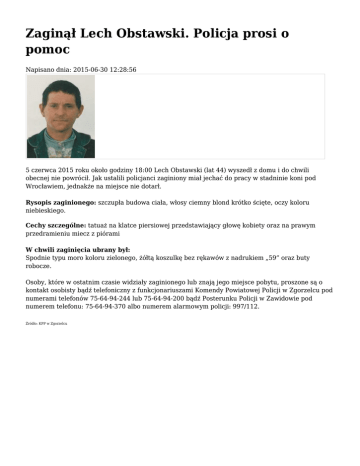 Zaginął Lech Obstawski. Policja prosi o pomoc Napisano dnia: 2015-06-30 12:28:56 5 czerwca 2015 roku około godziny 18:00 Lech Obstawski (lat 44) wyszedł z domu i do chwili obecnej nie powrócił. Jak ustalili policjanci zaginiony miał jechać do pracy w stadninie koni pod Wrocławiem, jednakże na miejsce nie dotarł. Rysopis zaginionego: szczupła budowa ciała, włosy ciemny blond krótko ścięte, oczy koloru niebieskiego. Cechy szczególne: tatuaż na klatce piersiowej przedstawiający głowę kobiety oraz na prawym przedramieniu miecz z piórami W chwili zaginięcia ubrany był: Spodnie typu moro koloru zielonego, żółtą koszulkę bez rękawów z nadrukiem „59” oraz buty robocze. Osoby, które w ostatnim czasie widziały zaginionego lub znają jego miejsce pobytu, proszone są o kontakt osobisty bądź telefoniczny z funkcjonariuszami Komendy Powiatowej Policji w Zgorzelcu pod numerami telefonów 75-64-94-244 lub 75-64-94-200 bądź Posterunku Policji w Zawidowie pod numerem telefonu: 75-64-94-370 albo numerem alarmowym policji: 997/112. Źródło: KPP w Zgorzelcu