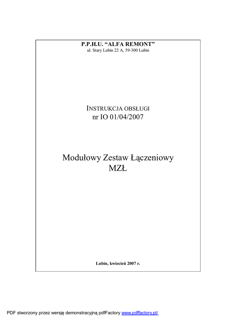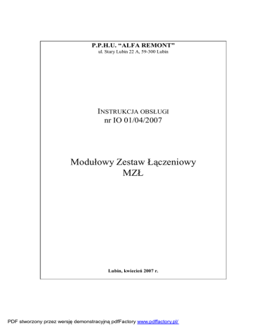 P.P.H.U. “ALFA REMONT” ul. Stary Lubin 22 A, 59-300 Lubin INSTRUKCJA OBSŁUGI nr IO 01/04/2007 Modułowy Zestaw Łączeniowy MZŁ Lubin, kwiecień 2007 r. PDF stworzony przez wersję demonstracyjną pdfFactory www.pdffactory.pl/ IO 01/04/2007 – MZŁ-1 – P.P.H.U. “ALFA REMONT” SPIS TREŚCI 1. INFORMACJE OGÓLNE ..............................................................................................................3 2. OPIS TECHNICZNY ......................................................................................................................4 2.1 OZNACZENIA .............................................................................................................................4 2.2 DANE TECHNICZNO – EKSPLOATACYJNE .....................................................................................5 2.2.1 Warunki klimatyczne (środowiskowe) ...................................................................................5 2.2.2 Warunki eksploatacyjne .......................................................................................................5 2.2.3 Dane techniczne podstawowe...............................................................................................5 3. OPIS TECHNICZNY ......................................................................................................................6 3.1 3.2 3.3 3.4 3.5 3.6 3.7 3.8 3.9 OBUDOWA ................................................................................................................................6 OCHRONA PRZED DOTYKIEM BEZPOŚREDNIM...............................................................................7 ZACISKI PRZYŁĄCZOWE, POŁĄCZENIA ELEKTRYCZNE ...................................................................7 WYPOSAŻENIE...........................................................................................................................7 ZACISKI UZIEMIAJĄCE, CIĄGŁOŚĆ UZIEMIENIA .............................................................................8 WPROWADZANIE KABLI I PRZEWODÓW........................................................................................8 OCHRONA PRZED PORAŻENIEM PRĄDEM ELEKTRYCZNYM .............................................................8 ZABEZPIECZENIA I SYGNALIZACJA ..............................................................................................8 DZIAŁANIE ................................................................................................................................9 4. TRANSPORT ..................................................................................................................................9 5. PRZECHOWYWANIE...................................................................................................................9 6. ZAMAWIANIE ............................................................................................................................. 10 7. MONTAŻ I PODŁĄCZENIE ....................................................................................................... 10 7.1 7.2 7.3 8. ODBIÓR PRZED MONTAŻEM ...................................................................................................... 10 OGLĘDZINY............................................................................................................................. 10 INSTALACJA ZESTAWU ............................................................................................................. 11 ZASADY UŻYTKOWANIA ......................................................................................................... 12 8.1 8.2 9. ZASADY OBSŁUGI I EKSPLOATACJI............................................................................................. 12 WARUNKI BHP........................................................................................................................ 12 PRZEGLĄDY I NAPRAWY ....................................................................................................... 12 10. ZAGROŻENIA WYSTĘPUJĄCE W CZASIE EKSPLOATACJI......................................... 13 11. WYKAZ NORM I PRZEPISÓW............................................................................................. 14 12. SPIS RYSUNKÓW ................................................................................................................... 15 2 PDF stworzony przez wersję demonstracyjną pdfFactory www.pdffactory.pl/ IO 01/04/2007 – MZŁ-1 – P.P.H.U. “ALFA REMONT” 1.INFORMACJE OGÓLNE Modułowy Zestaw Łączeniowy MZŁ przeznaczony jest do łączenia kabli energetycznych o przekroju nie przekraczającym 120 mm2 w dołowej sieci elektroenergetycznej z izolowanym punktem neutralnym uzwojenia wtórnego o napięciu 3 x 500 V. Zestawy przewidziane są do stosowania w wyrobiskach podziemnych zakładów górniczych, w pomieszczeniach nie zagrożonych wybuchem metanu i/lub pyłu węglowego. Zestawy wyposażone są w zależności od zamówienia w listwy łączeniowe pozwalające na łączenie żył kabli energetycznych z końcówkami oczkowymi jak również gołych (nie zaprawionych) Zestawy MZŁ-1 składają się z dwóch modułów tj.: • moduł łączeniowy – wyposażony jest w listwę łączeniową 120 mm2 oraz w listwę 10 mm2 służącą do podłączenia zasilania drugiego modułu, • moduł oświetleniowy – wyposażony jest w torze zasilającym w rozłącznik izolacyjny DILOS 00 firmy GE Power Controls z którego zasilany jest transformator bezpieczeństwa o mocy 100 VA zabezpieczony od strony pierwotnej i wtórnej. Do modułu oświetleniowego poprzez wpust kablowy PG16 i przewód oponowy 2x2,5 mm2 podłączona jest lampa przemysłowa z siatką ochronną wraz ze źródłem światła o mocy max. 50W zasilana napięciem bezpiecznym 24V AC. Sterowanie lampą zewnętrzną odbywa się lokalnie łącznikiem zabudowanym na drzwiach modułu oświetleniowego. Aparatura elektryczna Zestawu MZŁ-1 umieszczona j