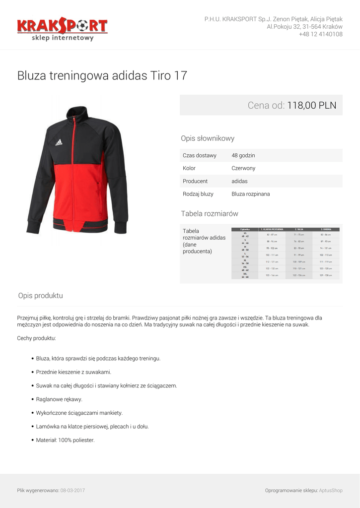 P.H.U. KRAKSPORT Sp.J. Zenon Piętak, Alicja Piętak Al.Pokoju 32, 31-564 Kraków +48 12 4140108 Bluza treningowa adidas Tiro 17 Cena od: 118,00 PLN Opis słownikowy Czas dostawy 48 godzin Kolor Czerwony Producent adidas Rodzaj bluzy Bluza rozpinana Tabela rozmiarów Tabela rozmiarów adidas (dane producenta) Opis produktu Przejmuj piłkę, kontroluj grę i strzelaj do bramki. Prawdziwy pasjonat piłki nożnej gra zawsze i wszędzie. Ta bluza treningowa dla mężczyzn jest odpowiednia do noszenia na co dzień. Ma tradycyjny suwak na całej długości i przednie kieszenie na suwak. Cechy produktu: Bluza, która sprawdzi się podczas każdego treningu. Przednie kieszenie z suwakami. Suwak na całej długości i stawiany kołnierz ze ściągaczem. Raglanowe rękawy. Wykończone ściągaczami mankiety. Lamówka na klatce piersiowej, plecach i u dołu. Materiał: 100% poliester. Plik wygenerowano: 08-03-2017 Oprogramowanie sklepu: AptusShop P.H.U. KRAKSPORT Sp.J. Zenon Piętak, Alicja Piętak Al.Pokoju 32, 31-564 Kraków +48 12 4140108 Warianty produktu Plik wygenerowano: 08-03-2017 XS 118,00 PLN S 118,00 PLN M 118,00 PLN L 118,00 PLN XL 118,00 PLN XXL 118,00 PLN XXXL 118,00 PLN Oprogramowanie sklepu: AptusShop P.H.U. KRAKSPORT Sp.J. Zenon Piętak, Alicja Piętak Al.Pokoju 32, 31-564 Kraków +48 12 4140108 Galeria Plik wygenerowano: 08-03-2017 Powered by TCPDF (www.tcpdf.org) Oprogramowanie sklepu: AptusShop