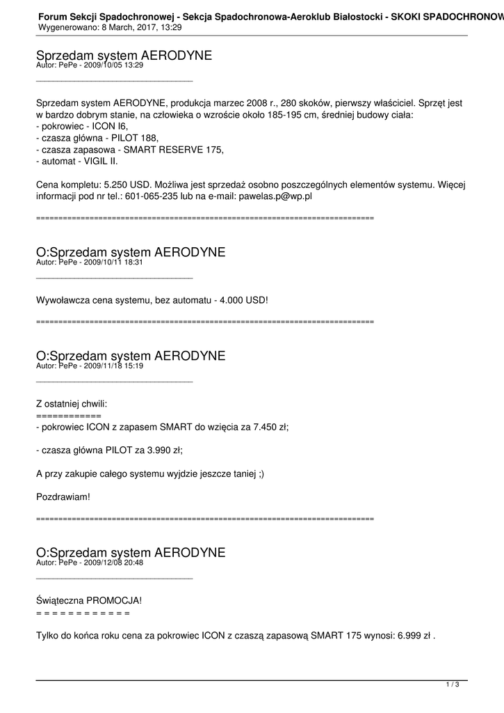 Forum Sekcji Spadochronowej - Sekcja Spadochronowa-Aeroklub Białostocki - SKOKI SPADOCHRONOW Wygenerowano: 8 March, 2017, 13:29 Sprzedam system AERODYNE Autor: PePe - 2009/10/05 13:29 _____________________________________ Sprzedam system AERODYNE, produkcja marzec 2008 r., 280 skoków, pierwszy właściciel. Sprzęt jest w bardzo dobrym stanie, na człowieka o wzroście około 185-195 cm, średniej budowy ciała: - pokrowiec - ICON I6, - czasza główna - PILOT 188, - czasza zapasowa - SMART RESERVE 175, - automat - VIGIL II. Cena kompletu: 5.250 USD. Możliwa jest sprzedaż osobno poszczególnych elementów systemu. Więcej informacji pod nr tel.: 601-065-235 lub na e-mail: [email protected] ============================================================================ O:Sprzedam system AERODYNE Autor: PePe - 2009/10/11 18:31 _____________________________________ Wywoławcza cena systemu, bez automatu - 4.000 USD! ============================================================================ O:Sprzedam system AERODYNE Autor: PePe - 2009/11/18 15:19 _____________________________________ Z ostatniej chwili: ============ - pokrowiec ICON z zapasem SMART do wzięcia za 7.450 zł; - czasza główna PILOT za 3.990 zł; A przy zakupie całego systemu wyjdzie jeszcze taniej ;) Pozdrawiam! ============================================================================ O:Sprzedam system AERODYNE Autor: PePe - 2009/12/08 20:48 _____________________________________ Świąteczna PROMOCJA! ============ Tylko do końca roku cena za pokrowiec ICON z czaszą zapasową SMART 175 wynosi: 6.999 zł . 1/3 Forum Sekcji Spadochronowej - Sekcja Spadochronowa-Aeroklub Białostocki - SKOKI SPADOCHRONOW Wygenerowano: 8 March, 2017, 13:29 Więcej informacji pod numerem telefonu: 601-065-235 lub na e-mail: [email protected] ============================================================================ O:Sprzedam system AERODYNE Autor: PePe - 2010/01/13 19:03 _____________________________________ Hey! Czasza główna PILOT znalazła już nabywcę ;) Do kupienia pozostał pokrowiec ICON z czaszą zapasową SMART 175 za 6.999 zł. Więcej informacji pod numerem telefonu: 601-065-235 lub na e-mail: [email protected] ============================================================================ O:Sprzedam system AERODYNE Autor: PePe - 2010/02/03 21:22 _____________________________________ Pokrowiec + zapas produkcji Aerodyne nadal są do wzięcia! Cena wyjściowa to tylko 6.750 zł, a dla "Swojaków" da radę jeszcze taniej coś utargować ;) ============================================================================ Re:Sprzedam system AERODYNE Autor: PePe - 2010/02/16 18:45 _____________________________________ Sprzęt sprzedany, a ogoszenie już nieaktualne. ============================================================================ Re:Sprzedam system AERODYNE Autor: PePe - 2010/02/16 18:47 _____________________________________ * Sorry, ogłoszenie, of course ;P ============================================================================ Re:Sprzedam system AERODYNE Autor: grzecho - 2010/02/17 07:46 _____________________________________ Pochwal się PePe co nowego sprezentowałeś sobie w zamian ??? 2/3 Forum Sekcji Spadochronowej - Sekcja Spadochronowa-Aeroklub Białostocki - SKOKI SPADOCHRONOW Wygenerowano: 8 March, 2017, 13:29 ============================================================================ Re:Sprzedam system AERODYNE Autor: PePe - 2010/02/17 21:29 _____________________________________ Nowy sprzęcik jest jeszcze w trakcie realizacji, a będzie to połączenie europejskiej myśli technicznej z Francji (pokrowiec Advance + X-Fast w zapasie) ze sprawdzoną na własnej skórze technologią zza oceanu (USA), czyli czaszą główną Pilot, ale w nowym rozwiązaniu z tkaniny ZPX... Zobaczymy co z połączenia tych klocków wyjdzie, ja w każdym bądź razie już nie mogę się doczekać ;) Pozdrawiam! ============================================================================ 3/3