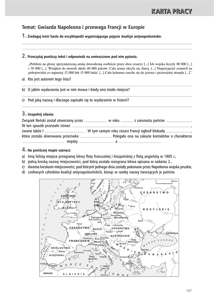 KARTA PRACY Temat: Gwiazda Napoleona i przewaga Francji w Europie 1. Zredaguj treÊç has∏a do encyklopedii wyjaÊniajàcego poj´cie koalicje antynapoleoƒskie. 2. Przeczytaj poni˝szy tekst i odpowiedz na umieszczone pod nim pytania. „Pobiłem na głowę sprzymierzoną armię dowodzoną osobiście przez dwu cesarzy [...] Ich wojska liczyły 80 000 [...] i 30 000 [...]. Wziąłem do niewoli około 40 000 jeńców. Cała armia okryła się sławą. [...] Nieprzyjaciel zostawił na pobojowisku co najmniej 12 000 lub 15 000 ludzi. [...] Cała kolumna rzuciła się do jeziora i przeważnie utonęła [...]”. a) Kto jest autorem tego listu? b) O jakim wydarzeniu jest w nim mowa i kiedy ono mia∏o miejsce? c) Pod jakà nazwà i dlaczego zapisa∏o si´ to wydarzenie w historii? 3. Uzupe∏nij zdania: Zwiàzek Reƒski zosta∏ utworzony przez w roku z szesnastu paƒstw . W ten sposób przesta∏o istnieç , zwane tak˝e I . W tym samym roku cesarz Francji og∏osi∏ blokad´ , która zosta∏a skierowana przeciwko . Polega∏a ona na zakazie kontaktów o charakterze mi´dzy a . 4. Na poni˝szej mapie zaznacz: a) b) c) d) linià falistà miejsce przegranej bitwy floty francuskiej i hiszpaƒskiej z flotà angielskà w 1805 r., jednà kreskà nazw´ miejscowoÊci, pod którà zosta∏a rozegrana bitwa opisana w zadaniu 2., dwoma kreskami miejscowoÊci, pod którymi jednego dnia zosta∏y pokonane przez Napoleona wojska pruskie, czo∏owych cz∏onków koalicji antynapoleoƒskich, bioràc w ramk´ nazwy tworzàcych je paƒstw. 147