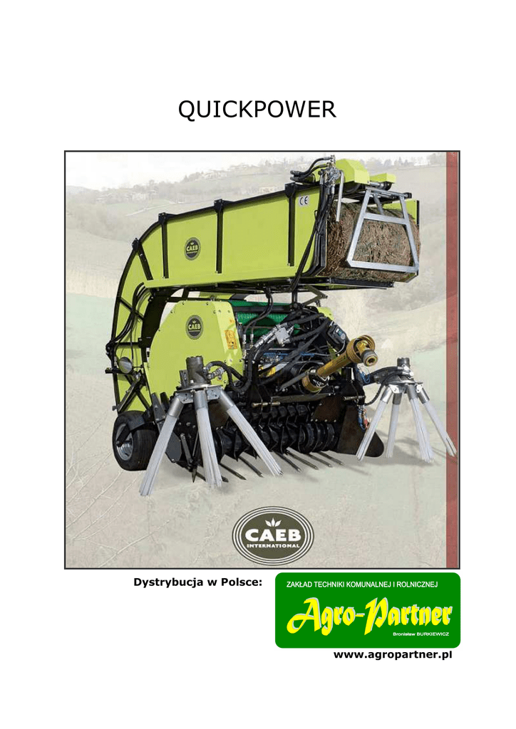 QUICKPOWER Dystrybucja w Polsce: www.agropartner.pl CHARAKTERYSTYKA OGÓLNA Quickpower jest prasą belującą przeznaczoną do gałęzi i pędów roślin, jako nowa myśl, bardzo zaawansowana technologicznie i uniwersalna. Quickpower jest konstruowana z rolek ze specjalnie wzmacnianej termicznie stali. Quickpower została przestudiowana pod kątem zminimalizowania zapotrzebowania mocy pochłanianej przez elementy komory prasująco-zwijającej. Quickpower potrzebuje średnio mniej niż 1 minutę na cały 1 cykl roboczy: - zebranie materiału do sprasowania - owinięcie sprasowanej beli - automatyczny wyładunek gotowej beli Masa wyprodukowanej w cyklu beli to 25-35 kg, z możliwością regulacji ciężaru beli zwiększając lub zmniejszając siłę sprasowania wewnątrz komory roboczej. Quickpower jest w stanie zbalować gałęzie do 35mm średnicy. Quickpower jest dostępny w 2 szerokościach opracowanych do międzyrzędzi o różnej szerokości. Siatka do owijania gałęzi Quickpower używa do wiązania beli siatki z PP ( polipropylen), opracowana specjalnie do utrzymania ściśniętych gałęzi różnego typu. Wymiary rolki siatki używanej do owijania: Szer. 600 mm – Śred 200 mm – Dł 1000 m Wymiary wyprodukowanej beli to: Szerokość 600 mm – Srednica 400 mm WYPOSAŻENIE DODATKOWE Przełącznik kierunku obrotów Przełącznik kierunku obrotów jest konieczny przy współpracy z ciągnikami nie posiadającymi obrotów WOM zsynchronizowanych. Pozwala on na odblokowanie maszyny zablokowanej nadmiarem materiału lub materiałem nieodpowiednim. Widły podbierające Są one niezbędne przy pracy w terenie zakamienionym, uniemożliwiają przedostanie się kamieni do komory roboczej. Koła tylne Służą głównie regulacji wysokości maszyny ( niezbędne przy zastosowaniu wideł podbierających) Rękaw magazynujący Gromadzi on wyrzucane gotowe bele, pozwalając w sposób znaczny na skrócenie czasu pracy. Pojemność rękawa to 7 beli, a rozładunek następuje automatycznie za pośrednictwem instalacji hydraulicznej ( podwójnego działania ) sterowanej przez operatora. Wymiary zewnętrzne rękawa zamontowanego na Quickpower to: 255 cm długości i 187 cm wysokości. Hydrauliczne szczotki nagarniające Nowe szczotki nagarniające służą zwiększeniu szerokości roboczej maszyny i są wyposażone w silniki hydrauliczne orbitalne o pojemności 160 cc. Szczotki są regulowane na dowolną wysokość a szerokość robocza jest w zakresie 180cm do 230 cm. Do zasilanie szczotek potrzebny jest rozdzielacz podwójnego działania 3/8” Szczotki hydrauliczne są dostępne tylko przy modelu Quickpower 1230 Prasa belująca do gałęzi przeznaczona do międzyrzędzi o szerokości powyżej 160 cm Prasa belująca do gałęzi przeznaczona do międzyrzędzi o szerokości powyżej 160 cm CHARAKTERYSTYKA TECHNICZNA CHARAKTERYSTYKA TECHNICZNA Wysokość 1000mm Szer. z nagarniaczami zamkniętymi 1310mm Szer. z nagarniaczami otwartymi 1555mm Długość 1160mm Masa własna 550kg (kompletna w wał podporowy) QUICKPOWER 1230 +Rękaw magazynujący + Szczotki Wys. z rękawem magazynującym ( z Quickpower ) od 1810mm do 1880mm Dł. z rękawem magazynującym (z Quickpower) 2550mm Szer. ze szczotkami zamkniętymi 1880mm Szer. ze szczotkami otwartymi 2300mm Wysokość 1000mm Szer. z nagarniaczami zamkniętymi 915mm Szer. z nagarniaczami otwartymi 1165mm Długość 1160mm Masa własna 506kg (kompletna w wał podporowy) QUICKPOWER 1230 +Rękaw magazynujący Wys. z rękawem magazynującym ( z Quickpower ) od 1780mm do 1870mm Dł. z rękawem magazynującym (z Quickpower) 2550mm Waga akcesoriów Rękaw magazynujący Para szczotek nagarniających Para kół tylnych Widły podbierające 235kg 62kg 32kg 28kg WYMAGANIA DOTYCZĄCE CIĄGNIKA - instalacja hydrauliczna podwójnego działania ( do Quickpower bez akcesoriów) - do każdego z akcesoriów ( szczotki, rękaw ) potrzeba dodatkowego gniazda podwójnego działania, - instalacja elektryczna 12 Votl - moc na WOM– 15 kW i prędkość 350 obr/min - WOM z ustawieniem zsynchronizowanym Waga akcesoriów Rękaw magazynujący Para kół tylnych Widły podbierające WYMAGANIA DOTYCZĄCE CIĄGNIKA - instalacja hydrauliczna podwójnego działania - instalacja elektryczna 12 Votl - moc na WOM– 15 kW i prędkość 350 obr/min - WOM z ustawieniem zsynchronizowanym UWAGA. Masa własna maszyny bez akcesoriów to ponad 500kg, należy użyć ciągnika o wadze odpowiedniej. UWAGA. Masa własna maszyny bez akcesoriów to ponad 500kg, należy użyć ciągnika o wadze odpowiedniej. TABELA PODSUMOWUJĄCA Dyski obrotowe nagarniacza Rękaw magazynujący Koła tylne regulowane Szczotki regulowane Widły nagarniacza do terenów zakamienionych Przełącznik kierunku obrotów Smarowanie automatyczne Nagarniacze podbieraka regulowane Automatyczny licznik beli Regulator sprasowania beli System bezpieczeństwa blokujący obracanie się WPM ze sprzęgłem przeciążeniowym Łożyska kulkowe wytrzymałości 2RS Owijanie siatką z regulacją w 3 pozycjach Magnetyczny panel sterujący z informacją dźwiękową Automatyczne napinacze łańcuchów W standardzie Jako dodatkowe 235kg 32kg 28kg
