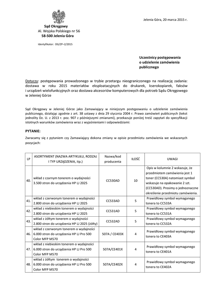 Jelenia Góra, 20 marca 2015 r. Sąd Okręgowy Al. Wojska Polskiego nr 56 58-500 Jelenia Góra Identyfikator: OG/ZP–2/2015 Uczestnicy postępowania o udzielenie zamówienia publicznego Dotyczy: postępowania prowadzonego w trybie przetargu nieograniczonego na realizację zadania: dostawa w roku 2015 materiałów eksploatacyjnych do drukarek, kserokopiarek, faksów i urządzeń wielofunkcyjnych oraz dostawa akcesoriów komputerowych dla potrzeb Sądu Okręgowego w Jeleniej Górze Sąd Okręgowy w Jeleniej Górze jako Zamawiający w niniejszym postępowaniu o udzielenie zamówienia publicznego, działając zgodnie z art. 38 ustawy z dnia 29 stycznia 2004 r. Prawo zamówień publicznych (tekst jednolity Dz. U. z 2013 r. poz. 907 z późniejszymi zmianami), przekazuje poniżej treść zapytań do specyfikacji istotnych warunków zamówienia wraz z wyjaśnieniami i odpowiedziami: PYTANIE: Zwracamy się z pytaniem czy Zamawiający dokona zmiany w opisie przedmiotu zamówienia we wskazanych pozycjach: LP 40. 41. 42. 43. 46. 47. 48. ASORTYMENT (NAZWA ARTYKUŁU, RODZAJ I TYP URZĄDZENIA, itp.) wkład z czarnym tonerem o wydajności 3.500 stron do urządzenia HP LJ 2025 wkład z czerwonym tonerem o wydajności 2.800 stron do urządzenia HP LJ 2025 wkład z niebieskim tonerem o wydajności 2.800 stron do urządzenia HP LJ 2025 wkład z żółtym tonerem o wydajności 2.800 stron do urządzenia HP LJ 2025 (żółty) wkład z czerwonym tonerem o wydajności 6.000 stron do urządzenia HP LJ Pro 500 Color MFP M570 wkład z niebieskim tonerem o wydajności 6.000 stron do urządzenia HP LJ Pro 500 Color MFP M570 wkład z żółtym tonerem o wydajności 6.000 stron do urządzenia HP LJ Pro 500 Color MFP M570 Nazwa/kod producenta ILOŚĆ UWAGI Opis w kolumnie 2 wskazuje, że przedmiotem zamówienia jest 1 toner (CC530A) natomiast symbol wskazuje na opakowanie 2 szt. (CC530AD). Prosimy o jednoznaczne określenie przedmiotu zamówienia. Prawidłowy symbol wymaganego tonera to CC533A Prawidłowy symbol wymaganego tonera to CC531A Prawidłowy symbol wymaganego tonera to CC532A CC530AD 10 CC533AD 5 CC531AD 5 CC532AD 5 507A / CE403X 4 Prawidłowy symbol wymaganego tonera to CE403A 507A/CE401X 4 Prawidłowy symbol wymaganego tonera to CE401A 507A/CE402X 4 Prawidłowy symbol wymaganego tonera to CE402A Pozostawienie opisu bez zmian może spowodować złożenie różnych ofert wzajemnie się wykluczających co w efekcie może doprowadzić do unieważnienia postępowania w związku z czym pomimo późnego terminu prosimy o uwzględnienie naszego pytania oraz o weryfikację i zmianę zapisów. ODPOWIEDŹ: Tak. Zamawiający dokonuje zmian w załączniku nr 1 Zestawienie ilościowo wartościowe - materiały eksploatacyjne do drukarek, kopiarek oraz faksów w Sądach Rejonowych w Kamiennej Górze i w Lwówku Śląskim oraz w Sądzie Okręgowym w Jeleniej Górze na rok 2015 w pozycjach numer: 40,41,42,43,46,47,48 w kolumnie nr 3 następujący sposób: LP asortyment (nazwa artykułu, rodzaj i typ urządzenia, itp.) Nazwa/kod producenta 40. wkład z czarnym tonerem o wydajności 3.500 stron do urządzenia HP LJ 2025 CC530A 41. 42. 43. 46. 47. 48. wkład z czerwonym tonerem o wydajności 2.800 stron do urządzenia HP LJ 2025 wkład z niebieskim tonerem o wydajności 2.800 stron do urządzenia HP LJ 2025 wkład z żółtym tonerem o wydajności 2.800 stron do urządzenia HP LJ 2025 (żółty) wkład z czerwonym tonerem o wydajności 6.000 stron do urządzenia HP LJ Pro 500 Color MFP M570 wkład z niebieskim tonerem o wydajności 6.000 stron do urządzenia HP LJ Pro 500 Color MFP M570 wkład z żółtym tonerem o wydajności 6.000 stron do urządzenia HP LJ Pro 500 Color MFP M570 CC533A CC531A CC532A CE403A CE401A CE402A Zamawiający uprzejmie informuje, że na podstawie art. 38 ust. 6 ustawy Prawo zamówień publicznych, przedłuża termin składania ofert, w związku z tym: Termin składania ofert upływa w dniu 26 marca 2015 r. o godzinie 10:00. Wadium należy wnieść przed upływem terminu składania ofert tj. przed dniem 26 marca 2015 r. godzina 10:00. Komisyjne otwarcie ofert nastąpi w dniu 26 marca 2015 r. o godzinie 10:15 w siedzibie zamawiającego: Sąd Okręgowy w Jeleniej Górze Al. Wojska Polskiego nr 56 pokój numer 326-327 III piętro Miejsce składania i otwarcia ofert nie ulegają zmianie.