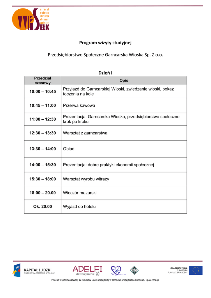 Program wizyty studyjnej Przedsiębiorstwo Społeczne Garncarska Wioska Sp. Z o.o. Dzień I Przedział czasowy Opis 10:00 – 10:45 Przyjazd do Garncarskiej Wioski, zwiedzanie wioski, pokaz toczenia na kole 10:45 – 11:00 Przerwa kawowa 11:00 – 12:30 Prezentacja: Garncarska Wioska, przedsiębiorstwo społeczne krok po kroku 12:30 – 13:30 Warsztat z garncarstwa 13:30 – 14:00 Obiad 14:00 – 15:30 Prezentacja: dobre praktyki ekonomii społecznej 15:30 – 18:00 Warsztat wyrobu witraży 18:00 – 20.00 Wieczór mazurski Ok. 20.00 Wyjazd do hotelu Dzień II Przedział czasowy 09:00 – 09:30 9.30 – 10:30 Opis Śniadanie Zwiedzanie zamku w Nidzicy 10:30 – 10:45 Przejazd do Garncarskiej Wioski 10:45 – 11:00 Przerwa kawowa 11:00 – 13:30 Warsztaty: malowanie na szkle, malowanie ceramiki lub bombek 13:30 – 14:00 Obiad Ok 14.15 Zakończenie wizyty